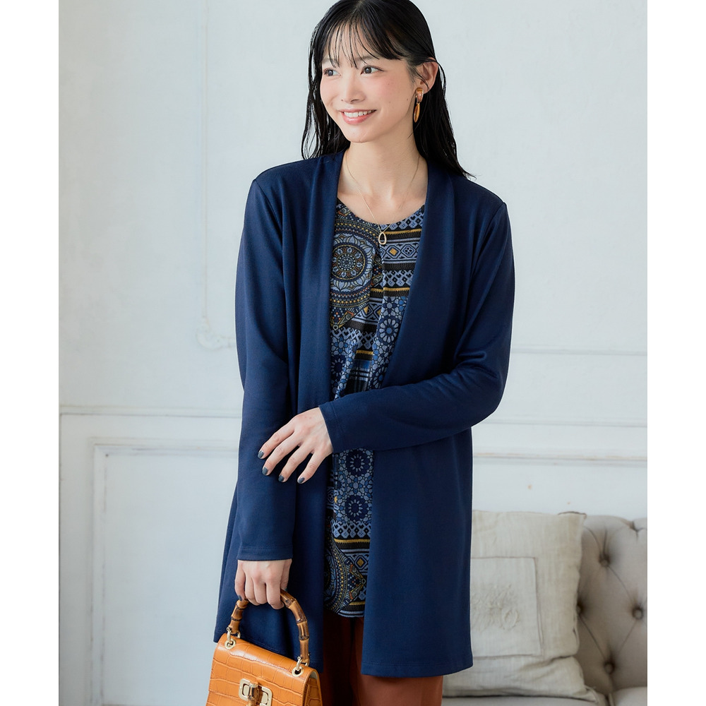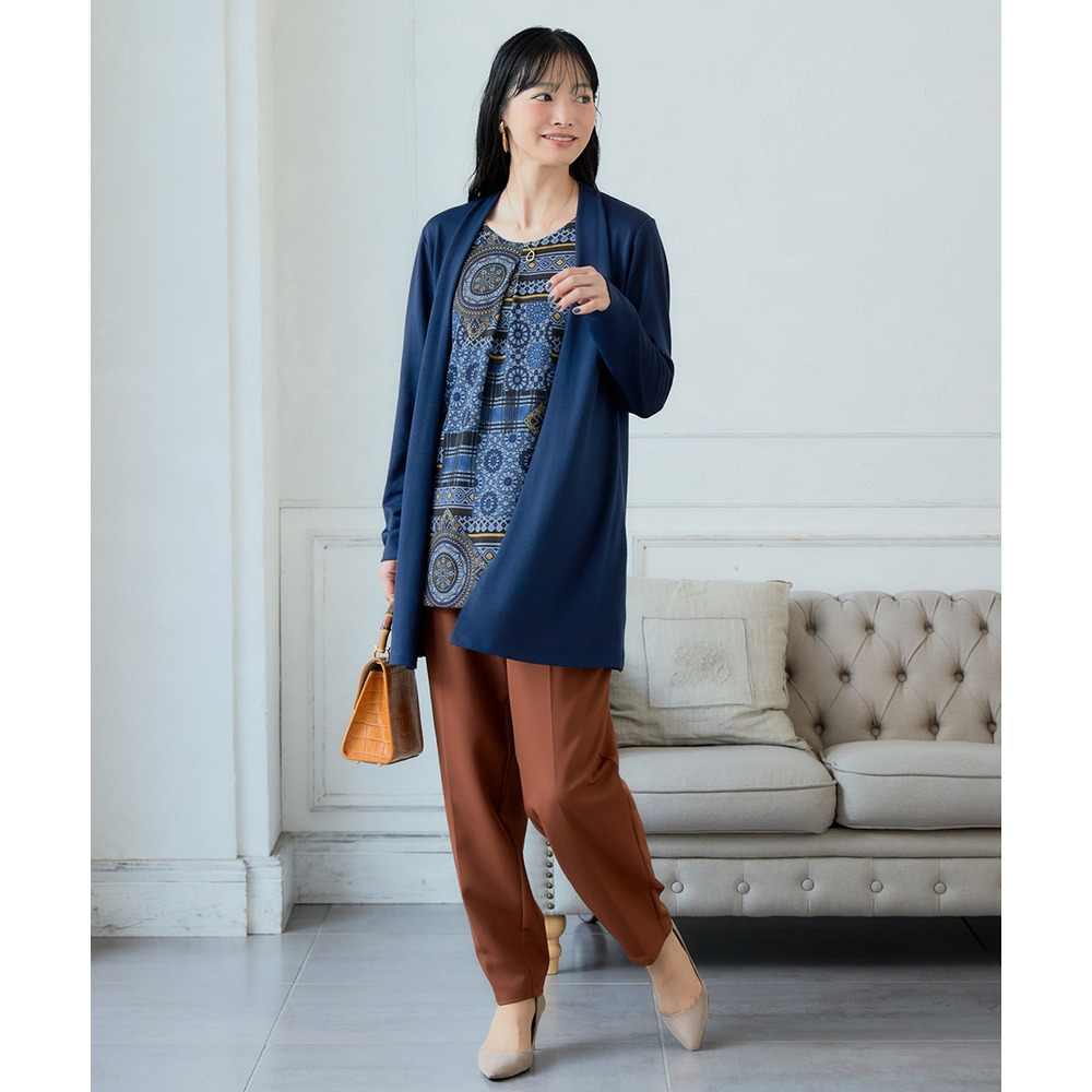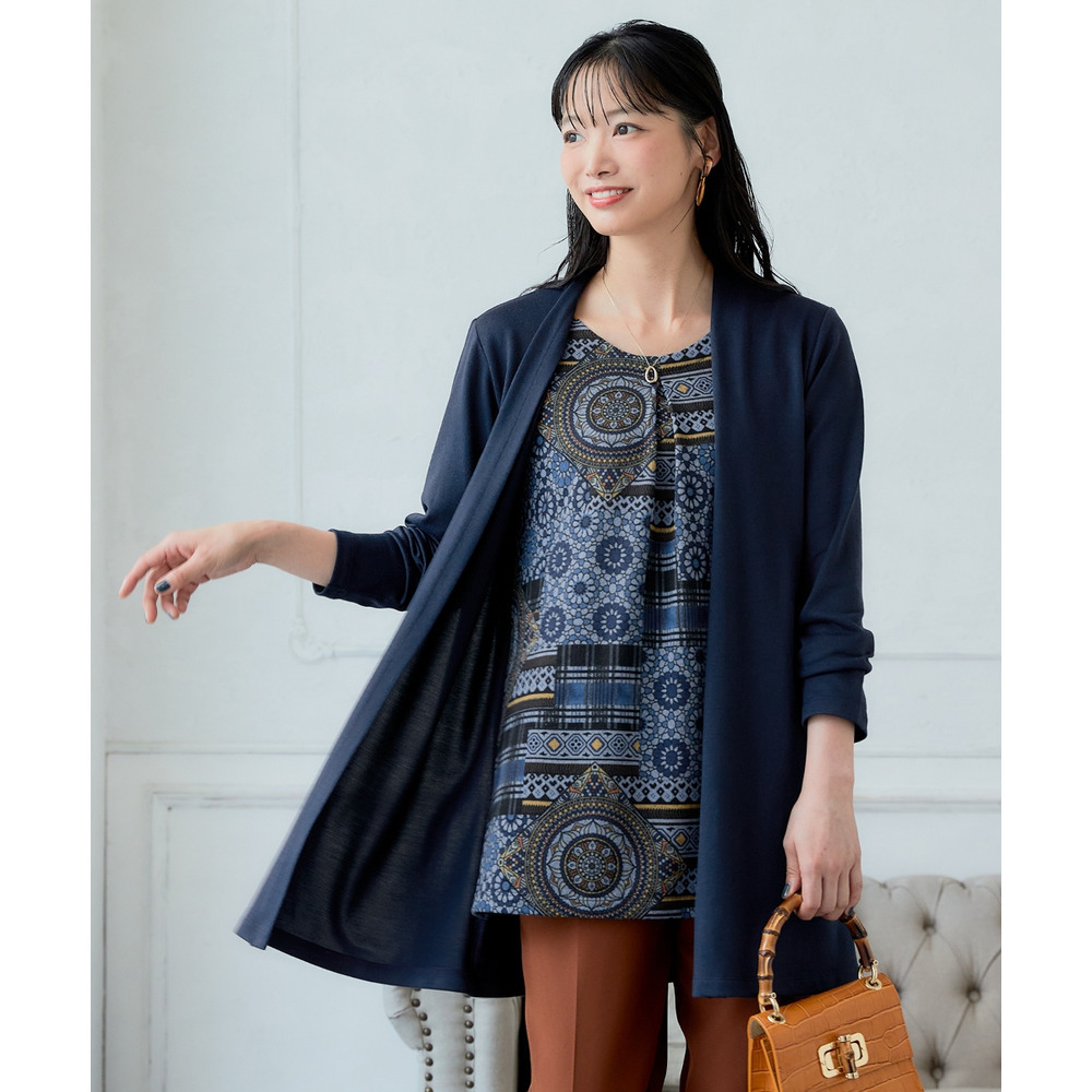 ロングのトッパーカーディガンにプリントチュニックをコーディネートしたようなデザイン。