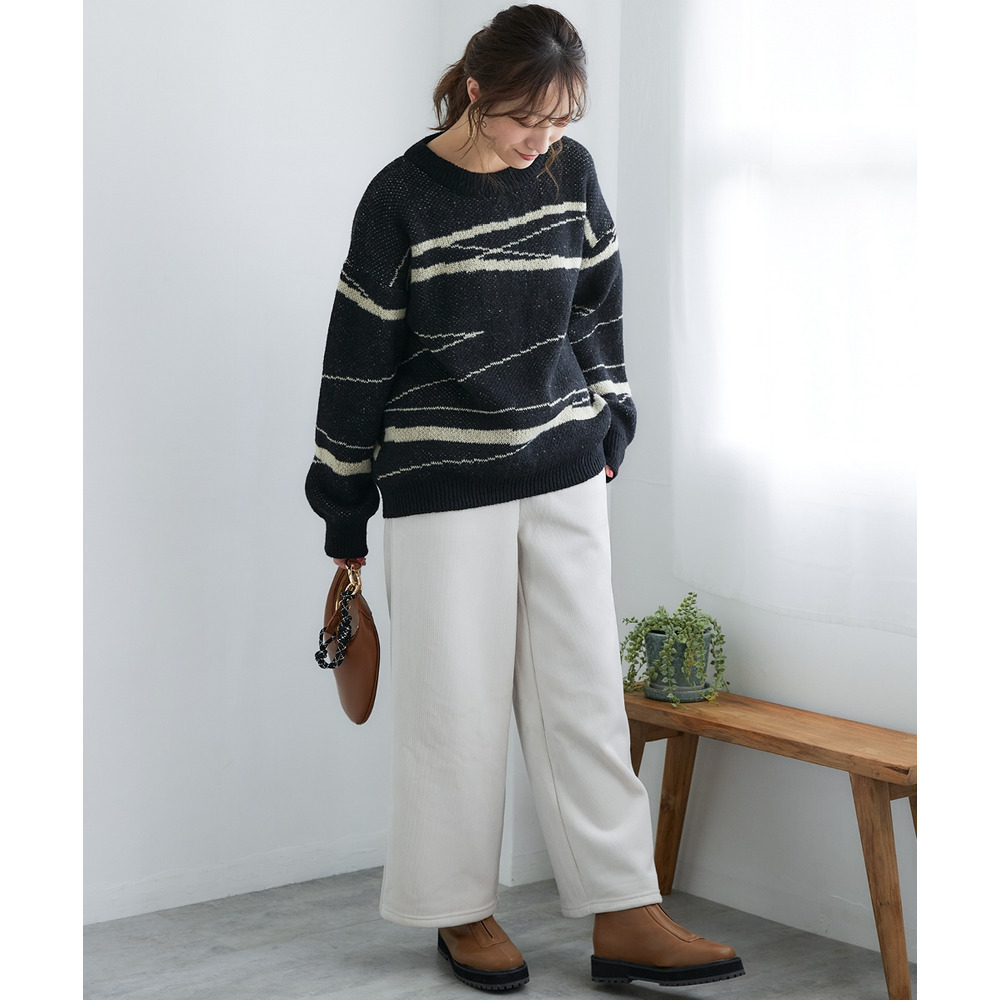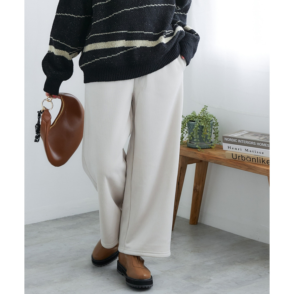 裏フリースであたたかいのに、リブで表現した縦畝がすっきりと細見えさせてくれる、寒い季節に嬉しいパンツです。