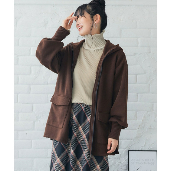 カジュアルだけど大人っぽく着こなせる、袖口をニット風リブで切替えた立衿ジップアップパーカーコート