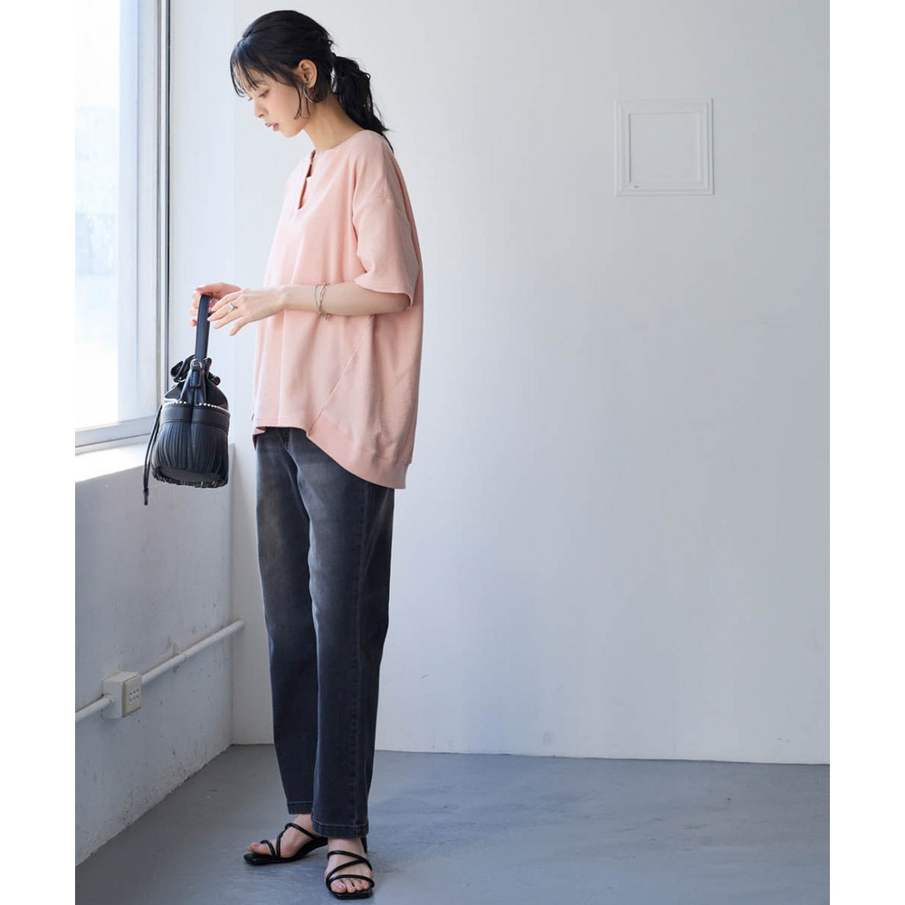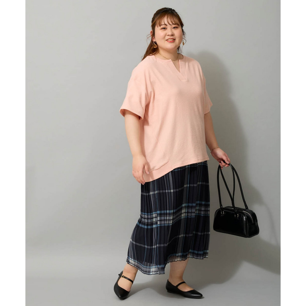 ゆるっとしたコクーンシルエットで体型をカバーしつつスッキリ見せてくれます。脇から前に向かって入っている切り替えでゆったりしてるのにスッキリ見せてくれます。気になる二の腕がしっかり隠れる安心の袖丈。袖口も広めで涼しく楽ちんです。気になる腰回りをしっかりカバーできるように後ろが長めになったデザインです。