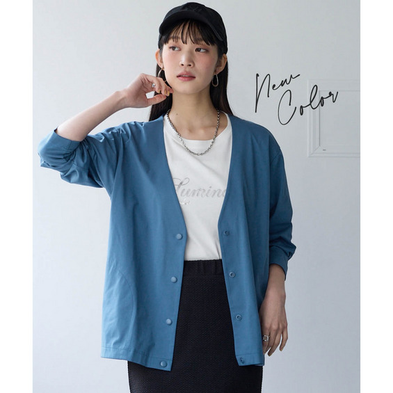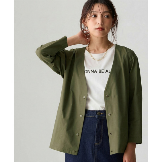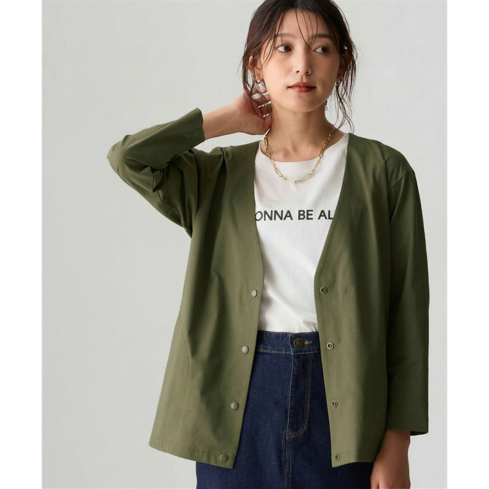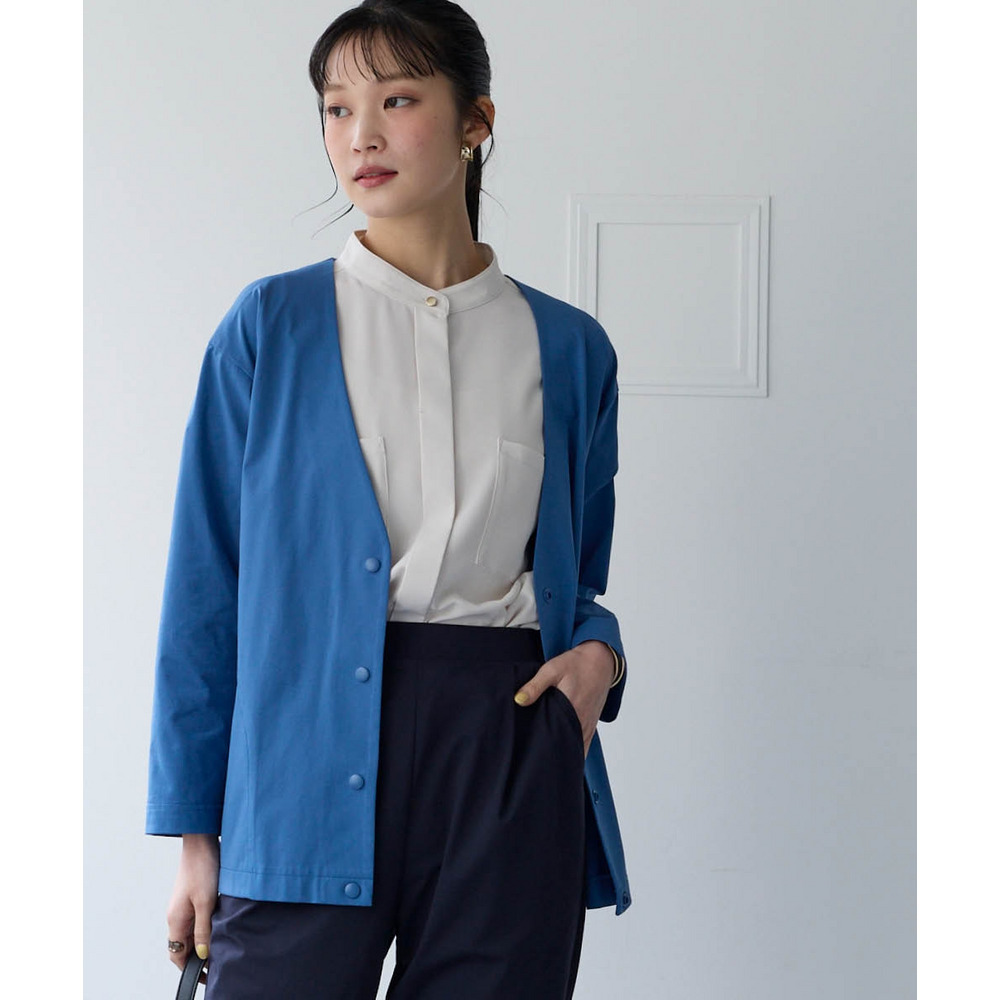 シンプルなVネックのノーカラーでカジュアルもキレイ目も両方OK。Vネックなので顔周りをスッキリ見せてくれて中に合わせるものも選びません。ゆるっとしたシルエットで体型カバーしつつ着ていて楽々。スナップボタンで着脱も楽々です。もちろん便利なポケット付き。スカートやワイドパンツとも相性よい丈感なので着まわせて便利。
