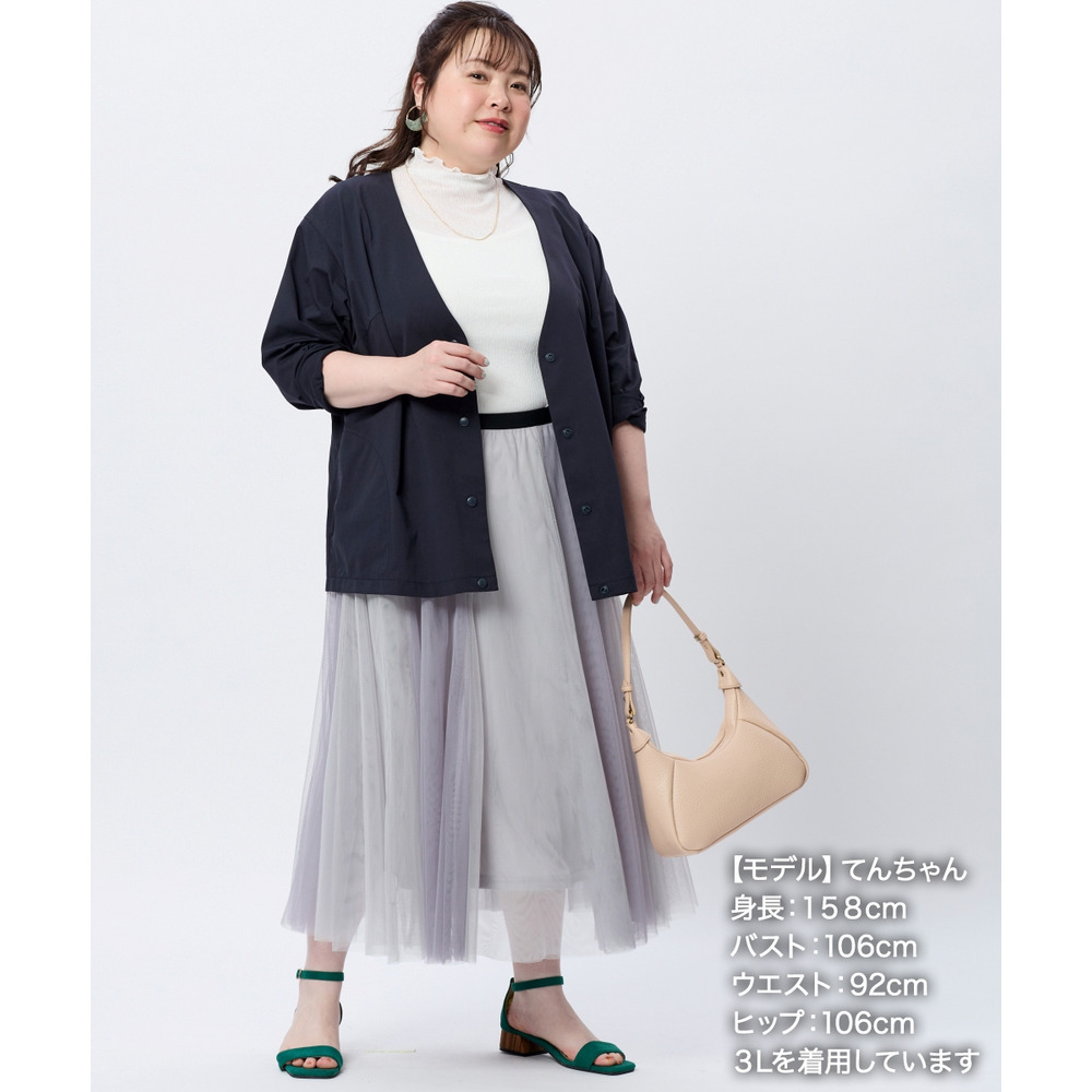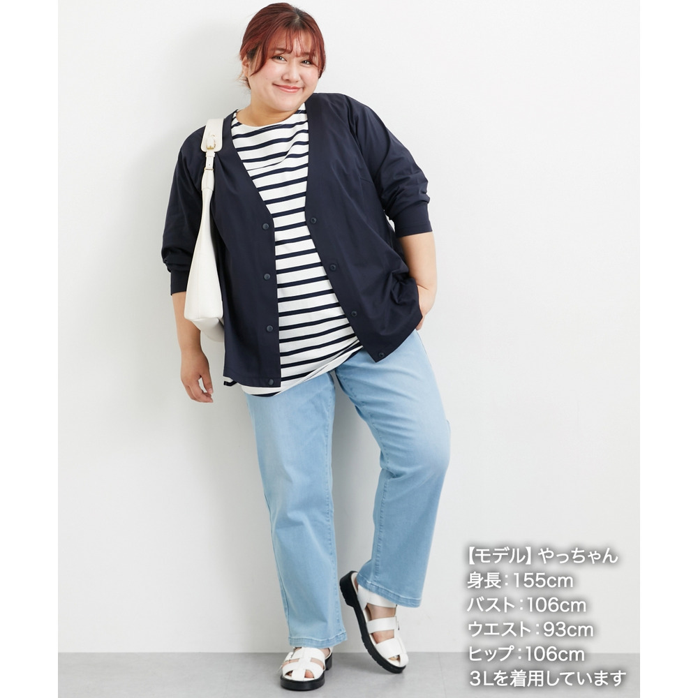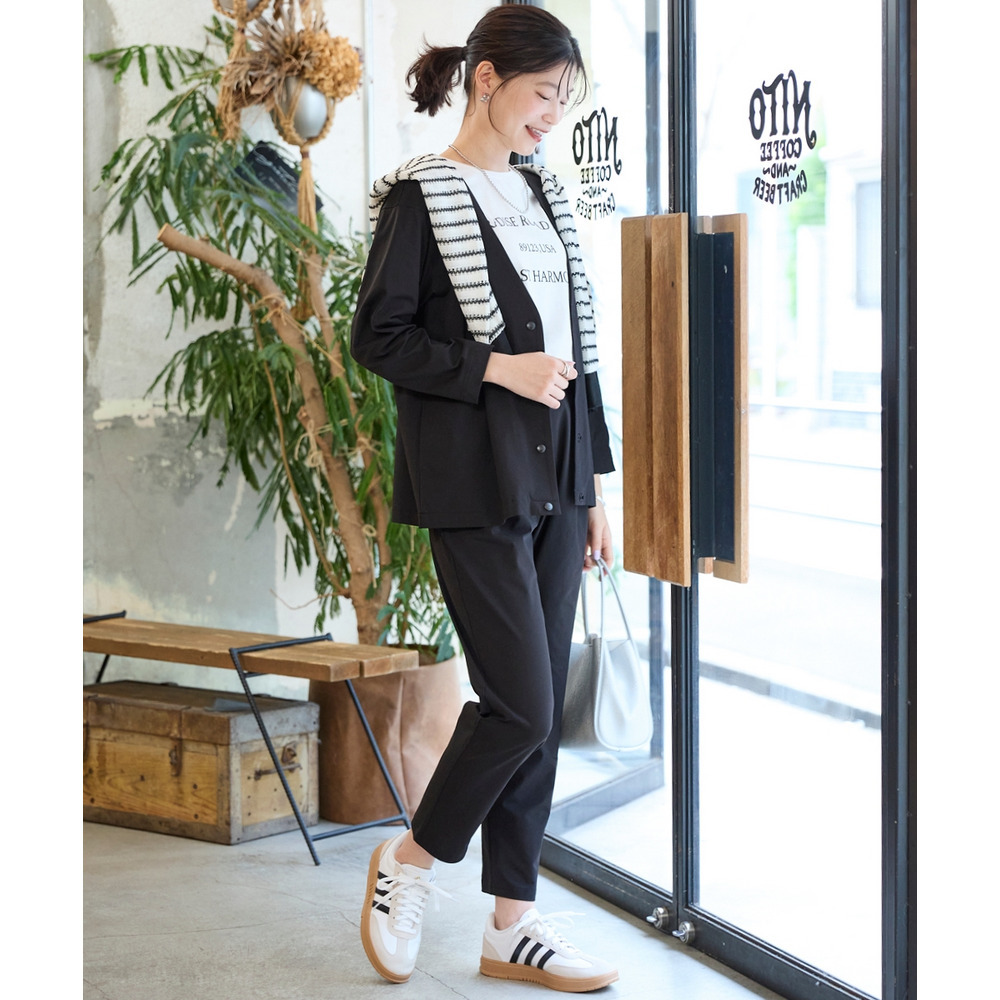 Vネックでスッキリした印象になるのでインに合わせるものを選ばず着回しがきいて便利。ボリュームのあるワイドパンツやロングスカートとも相性良く着まわせて便利。別売りのワイドパンツやテーパードパンツとセットアップ着用もお勧め。デニムで合わせて普段使いからセットアップで通勤まで着まわせて便利。