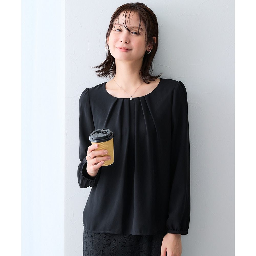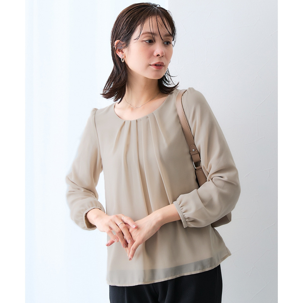 【カットソー裏地付】シフォン前タック9分袖ブラウス(裾ふらし)<大きいサイズ有>
