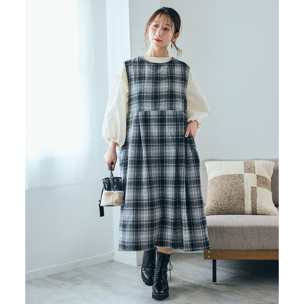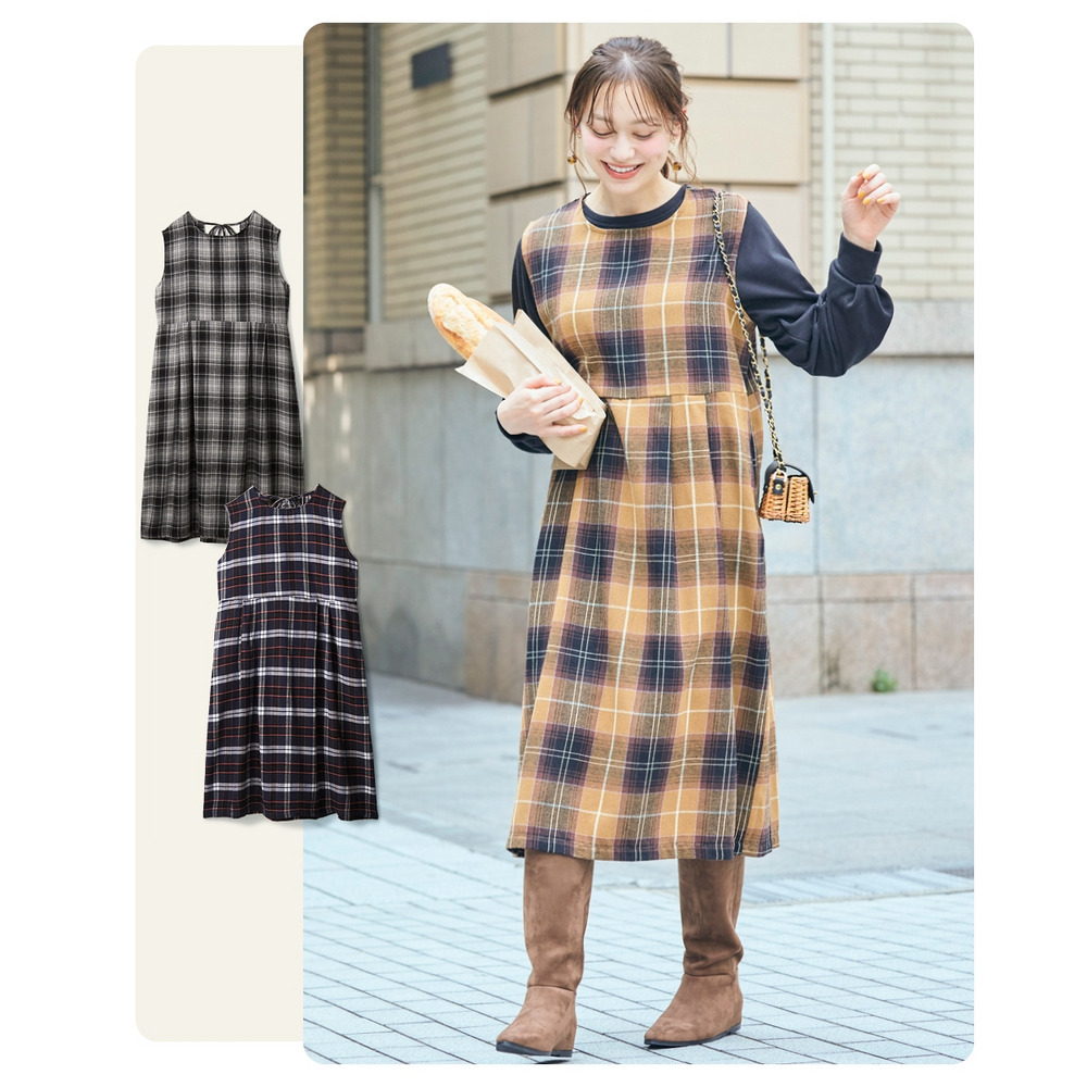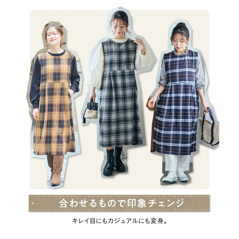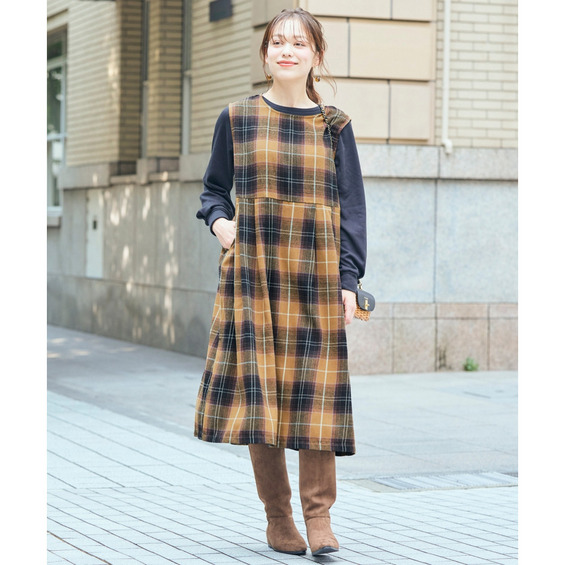このジャンパースカートは、インナー次第で様々な表情を見せてくれる万能アイテムです。