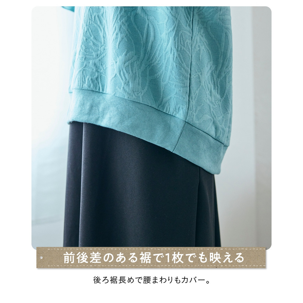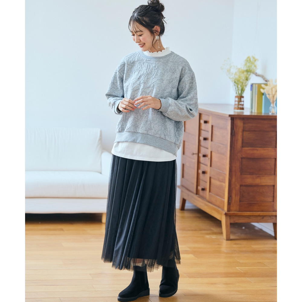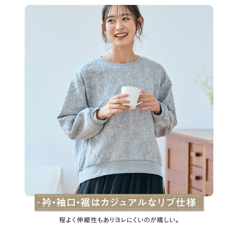 ぽこぽことした表情豊かな生地が、気になる体のラインを自然にカバーし、着るだけでこなれたおしゃれ感を演出します。