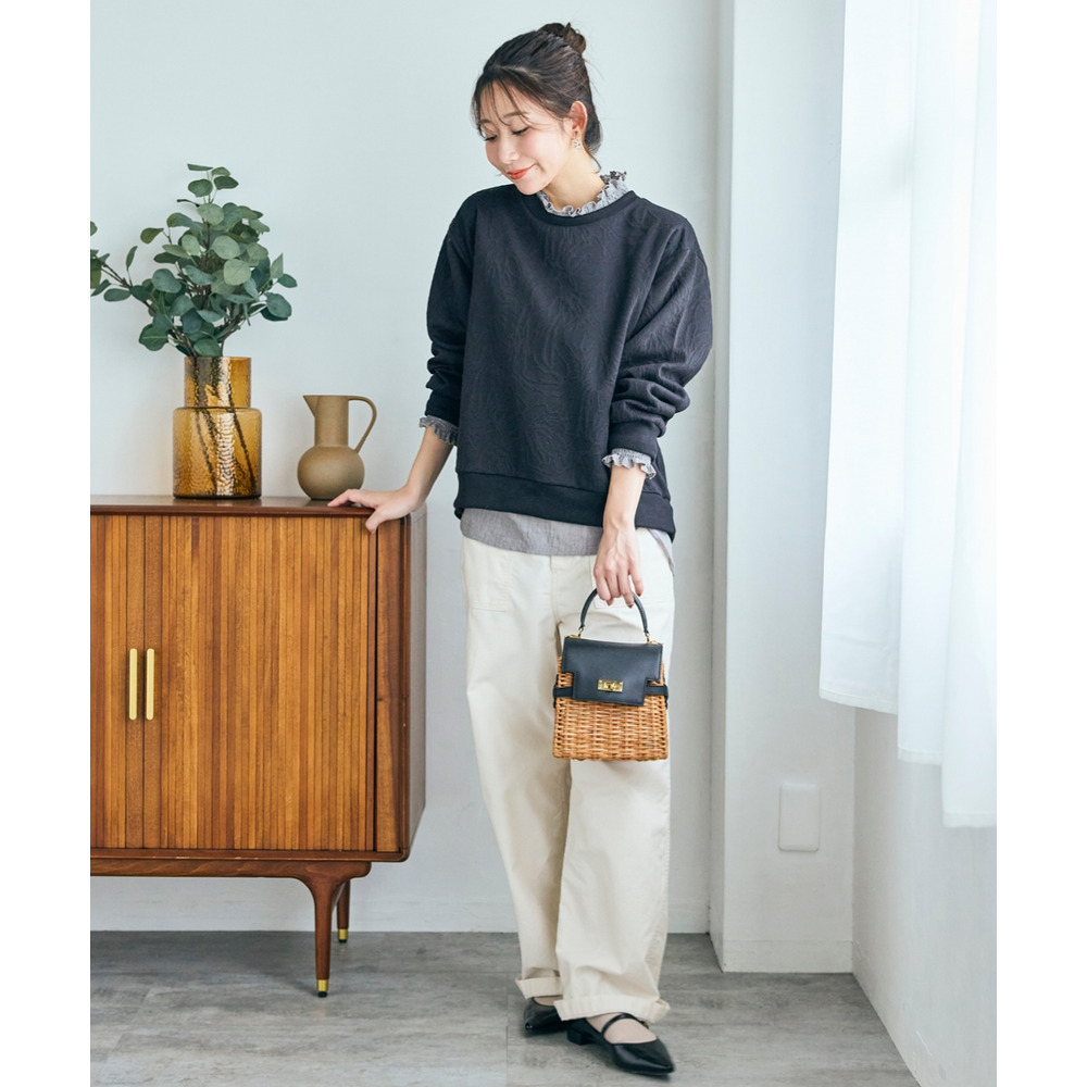首元はクルーネックで、どんなインナーとも合わせやすく、カジュアルながらも上品な印象を与えます。