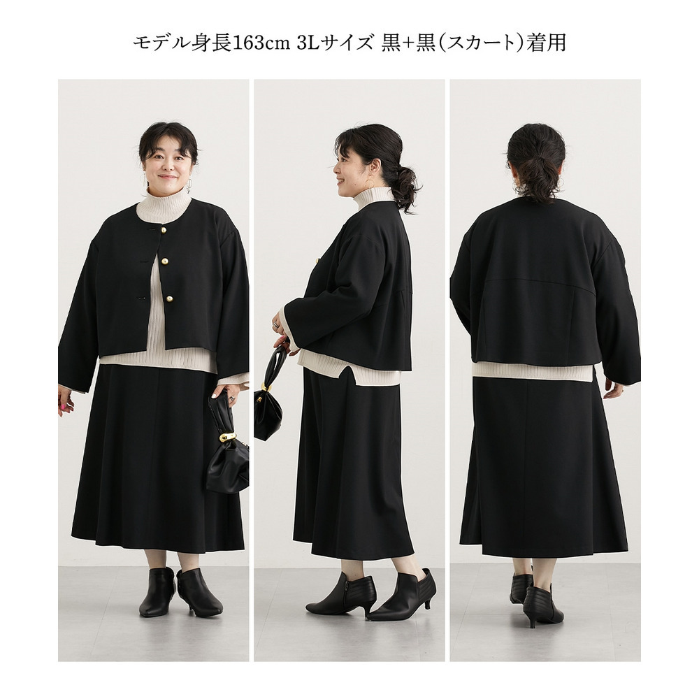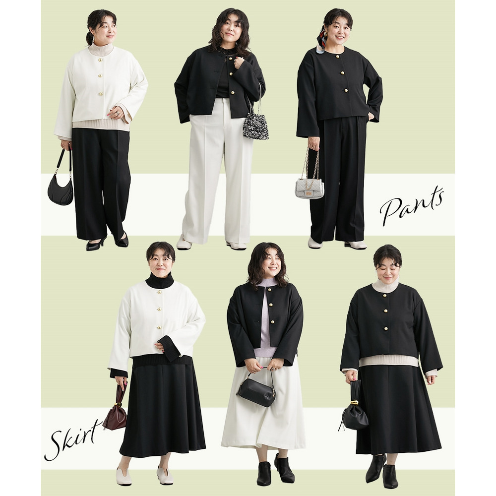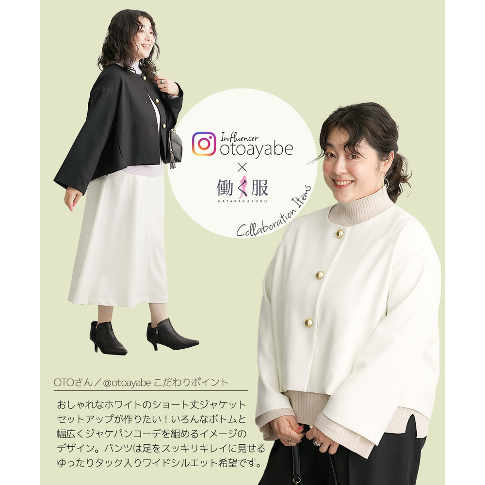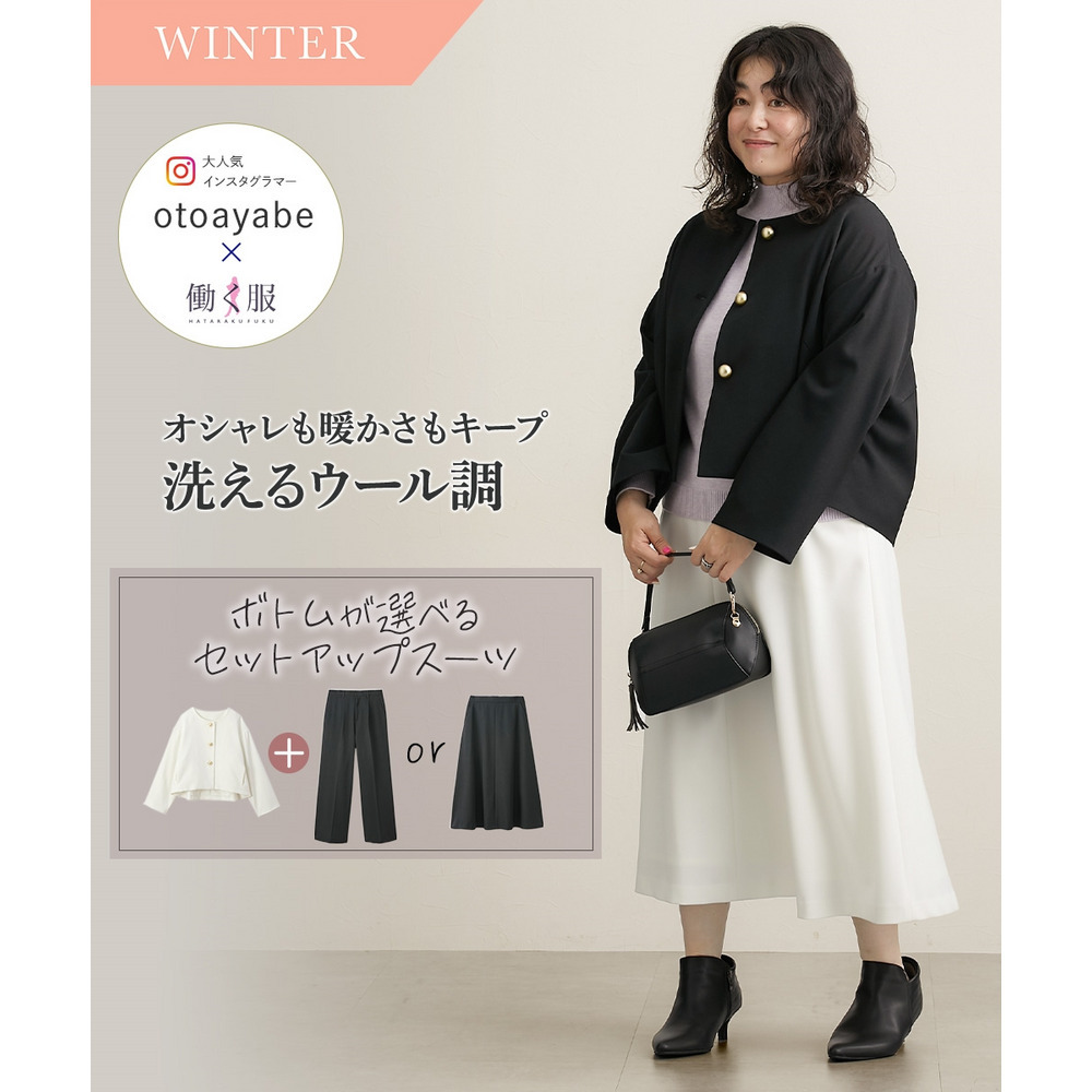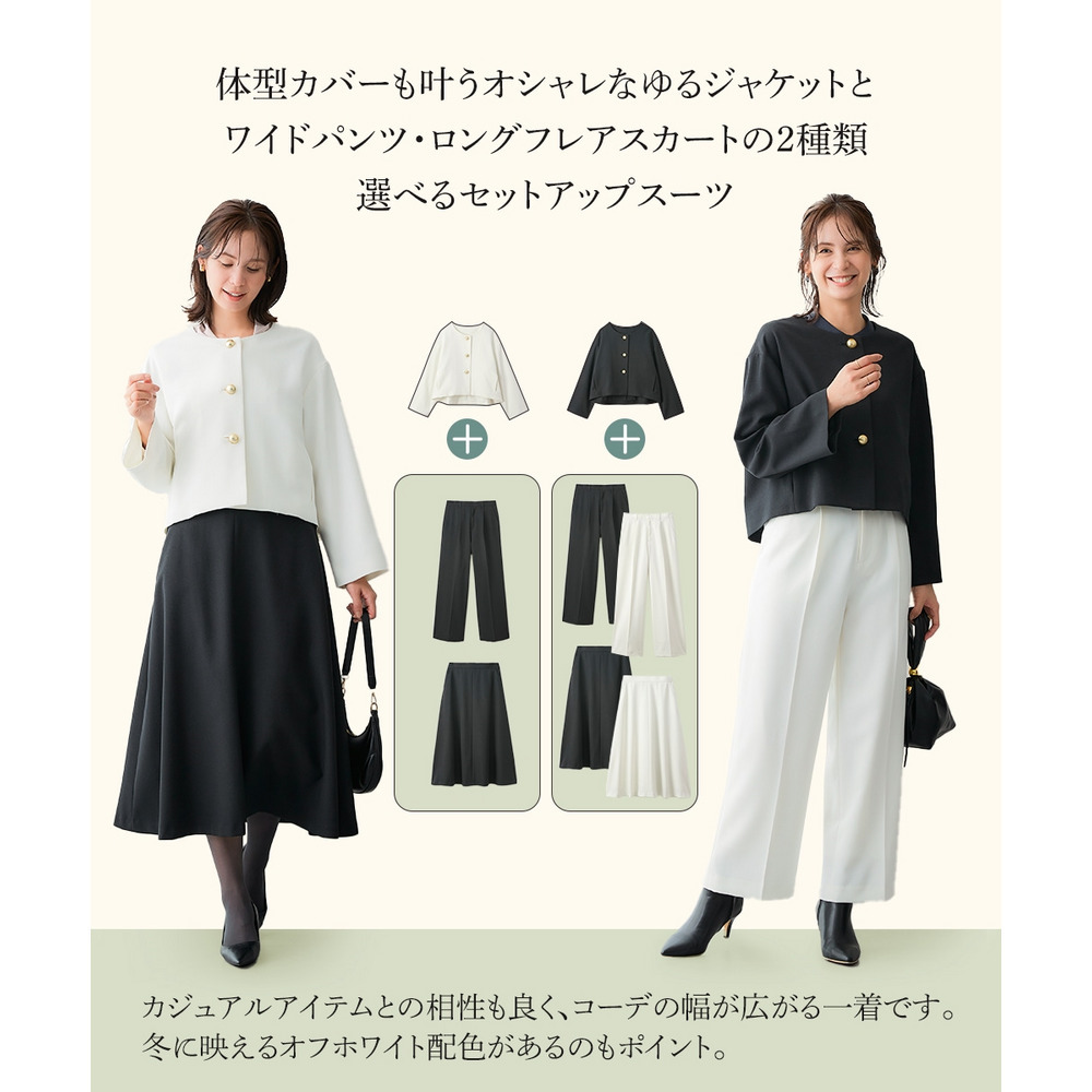 【レディーススーツ】<OTOさんコラボ>ボトムが選べるセットアップスーツ(ノーカラージャケット+ワイドパンツまたはロング丈フレアスカート)(ストレッチウール調シリーズ) 大きいサイズ