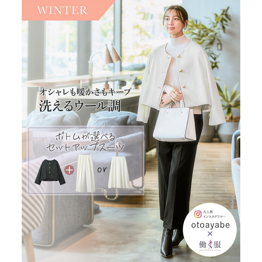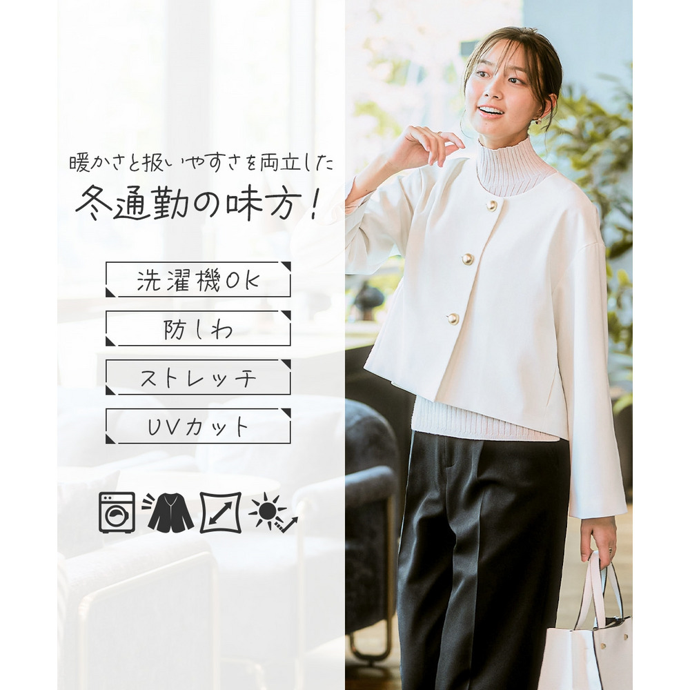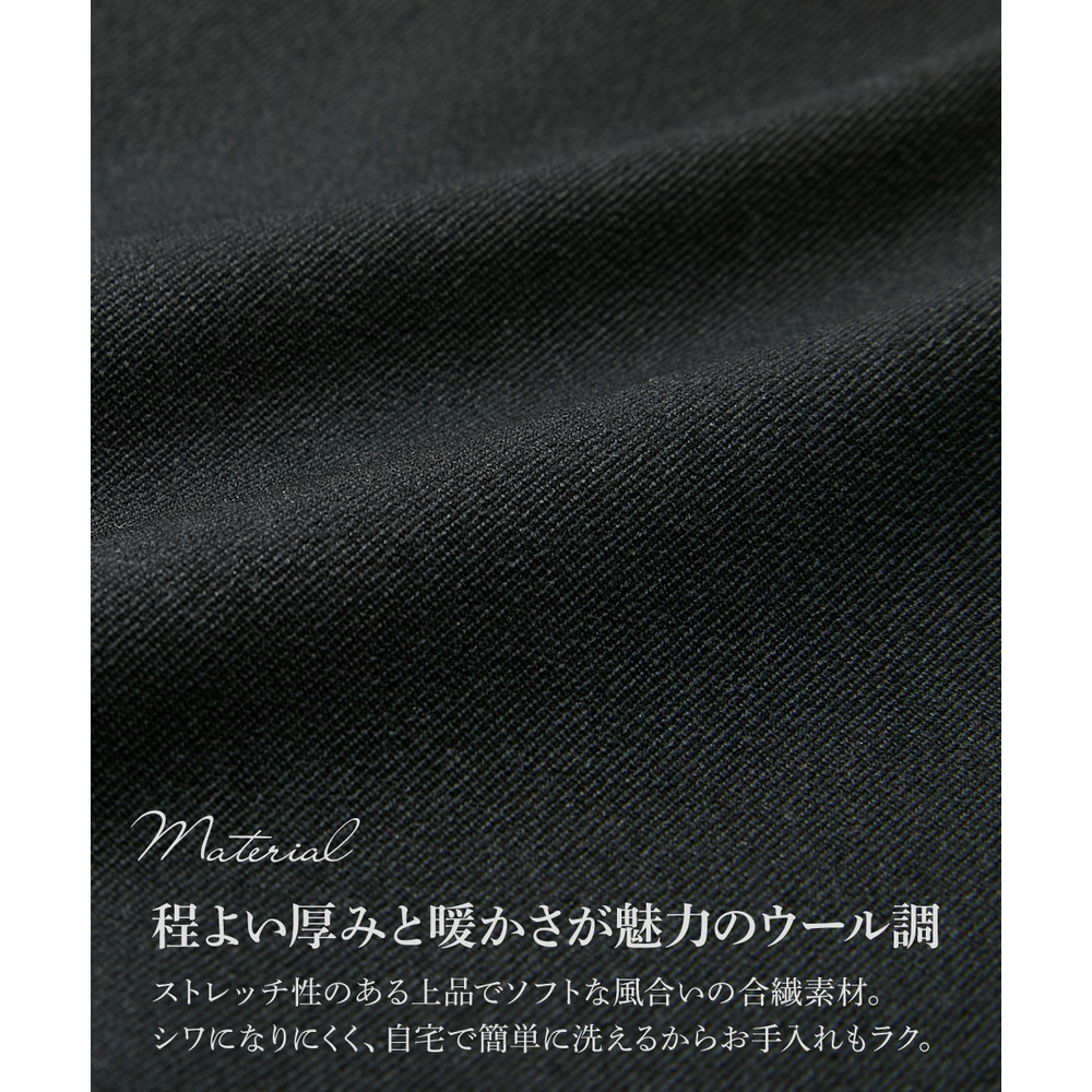 ・冬にちょうどいい厚みのあたたかみのあるウール調素材しわになりにくいので、長時間の着用でもきれいが続きます!ストレッチ入りなので着心地◎・おうち洗いができる素材&仕様にしておりますので、取り扱いもラクチン☆忙しい働く女性・ママにもぴったり