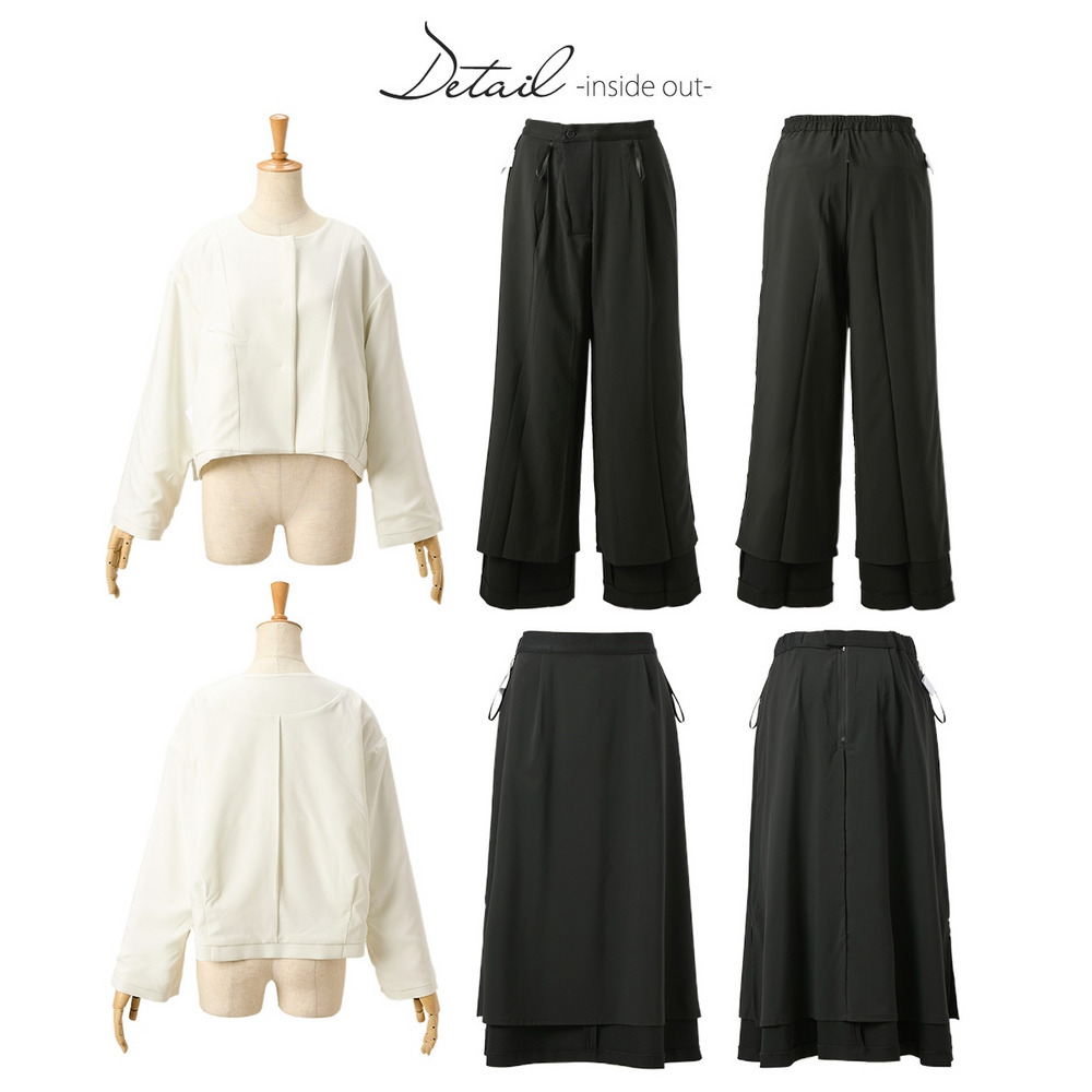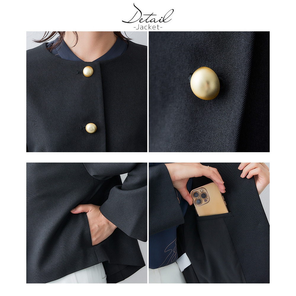 素材 | 品質=[表地]ポリエステル100%(ストレッチ織物) [裏地]有(総裏 ストレッチ裏地使用) ジャケット:肩パッド無 前ボタン開 パンツ:前ファスナー内ボタン付ホック開 ウエスト後ゴム入 ポケット両脇・後飾り スカート:後ファスナー開 ウエスト後脇ゴム入 ポケット両脇 ※この商品は2点同サイズのみで販売します。 ※ジャケットはLLサイズから胸ダーツあり。 |