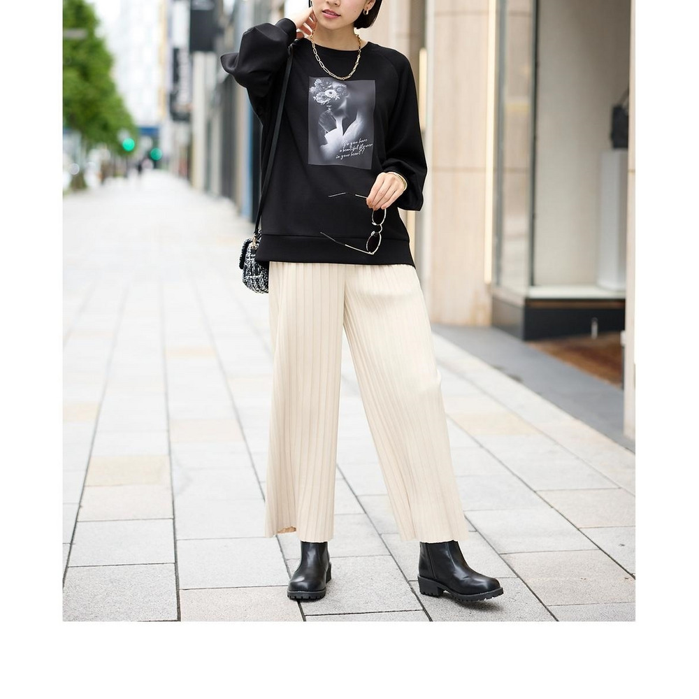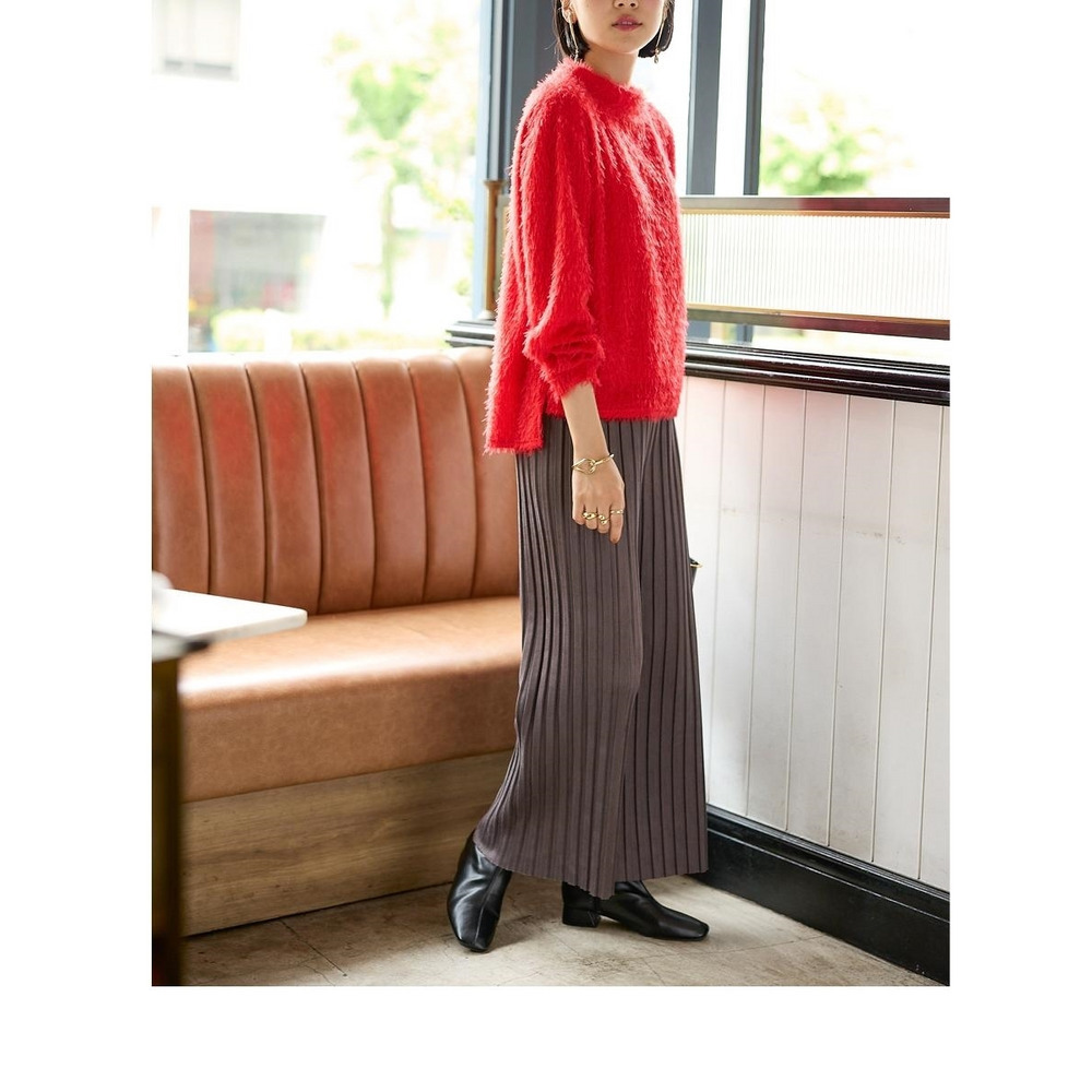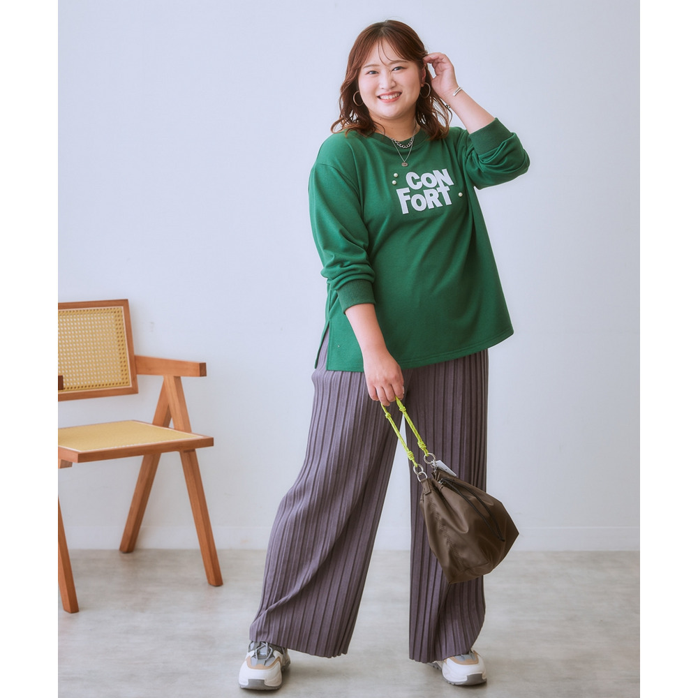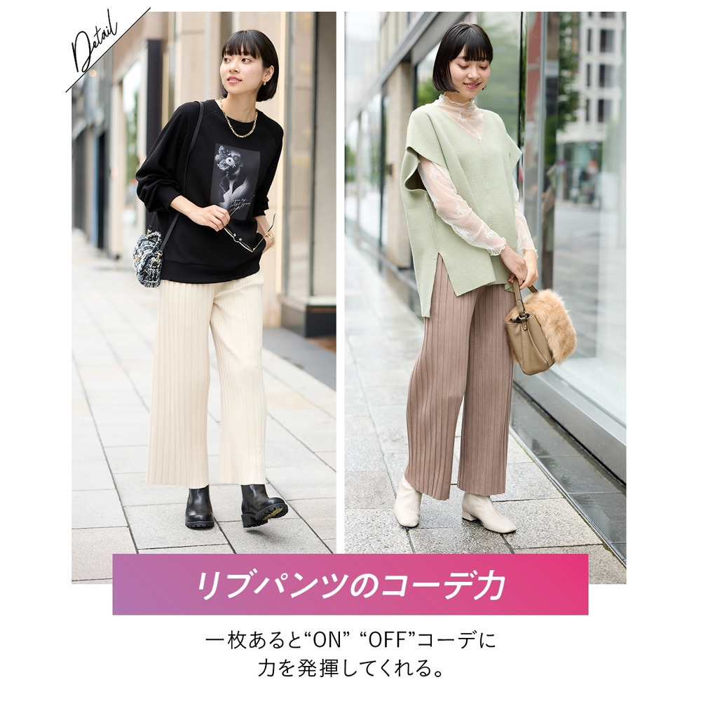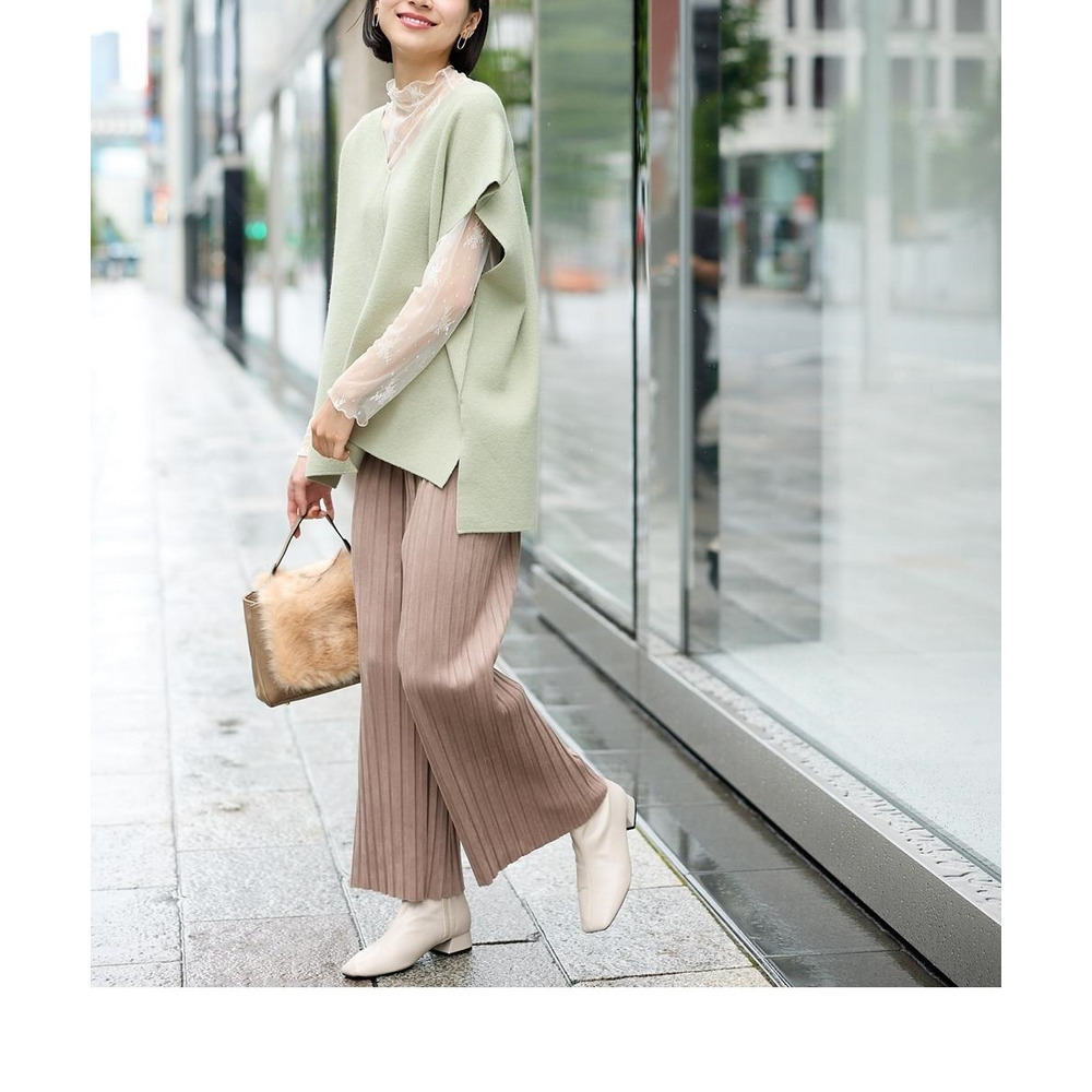 スッキリ楯見えのパンツなのでトップスにふんわりシルエットのニットをあわせてバランスよし!