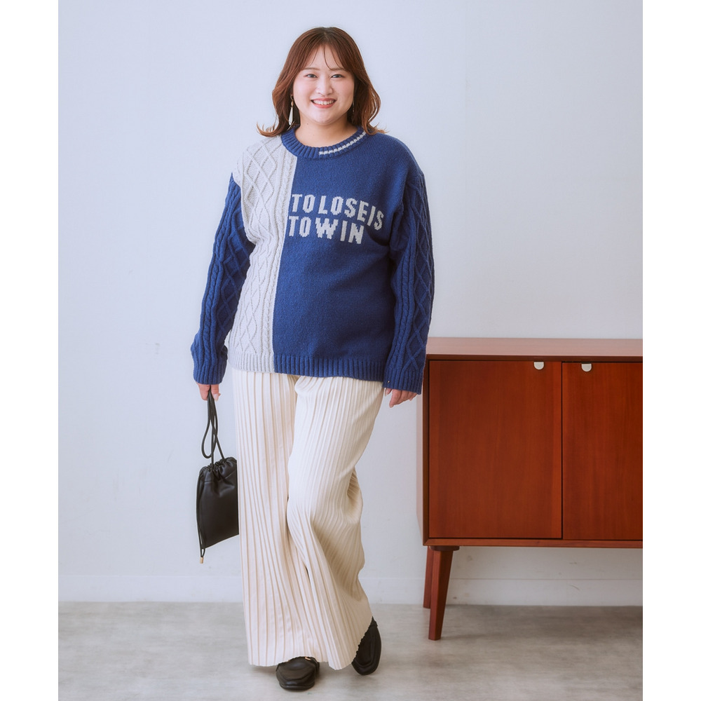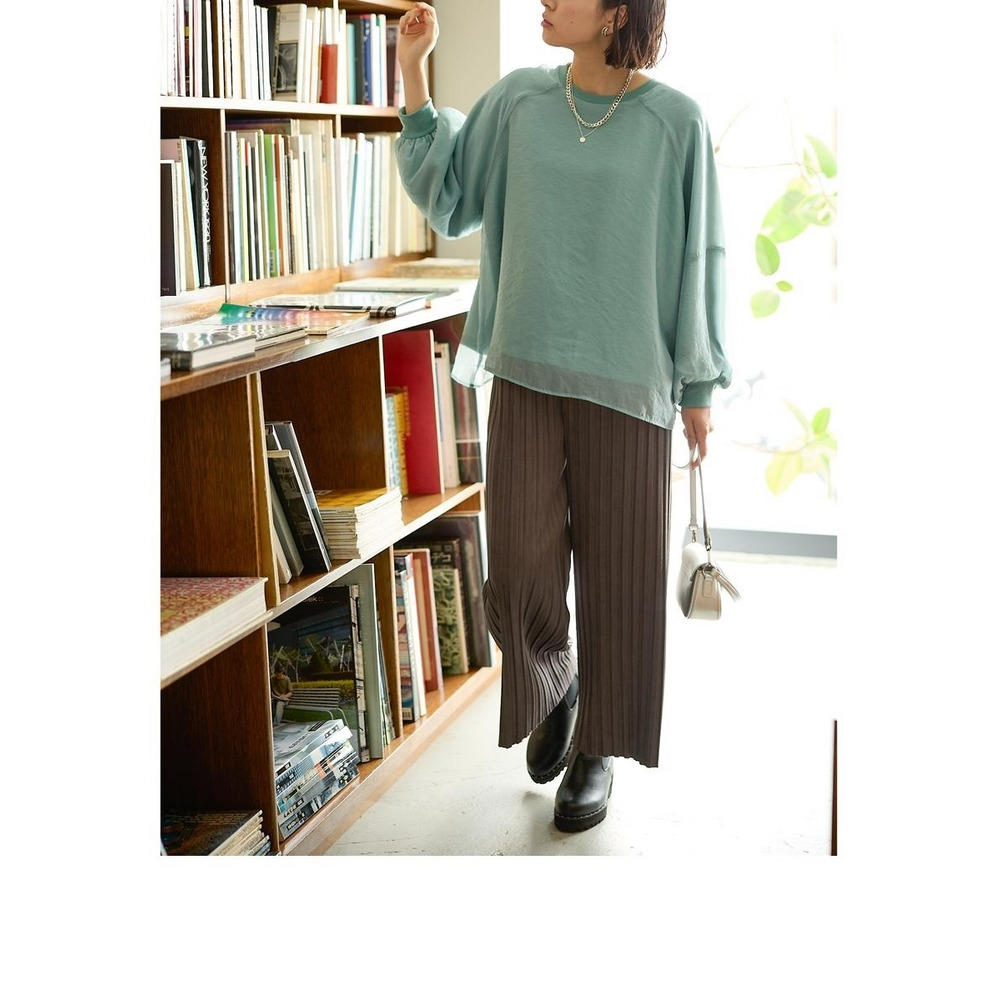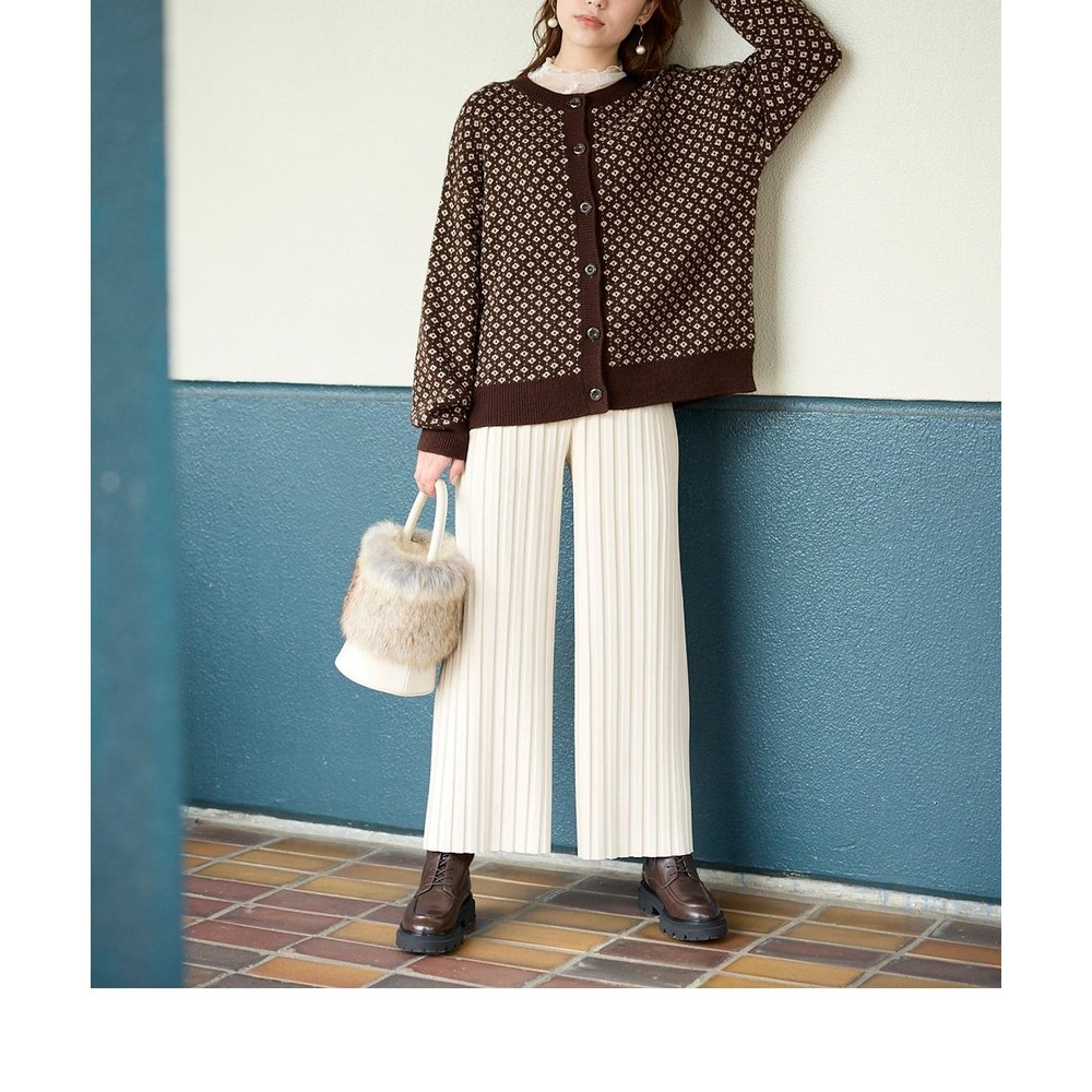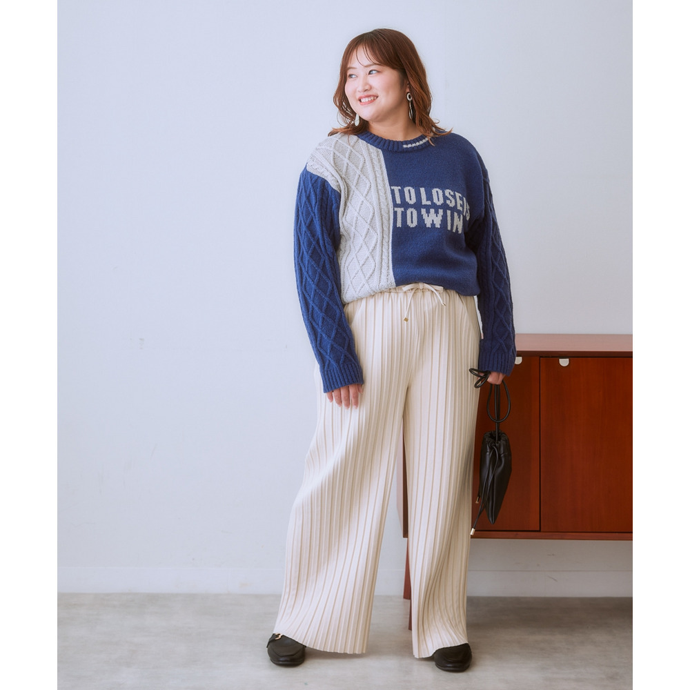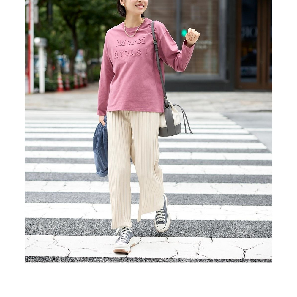 スッキリ楯見えのパンツなのでトップスにふんわりシルエットのニットをあわせてバランスよし!