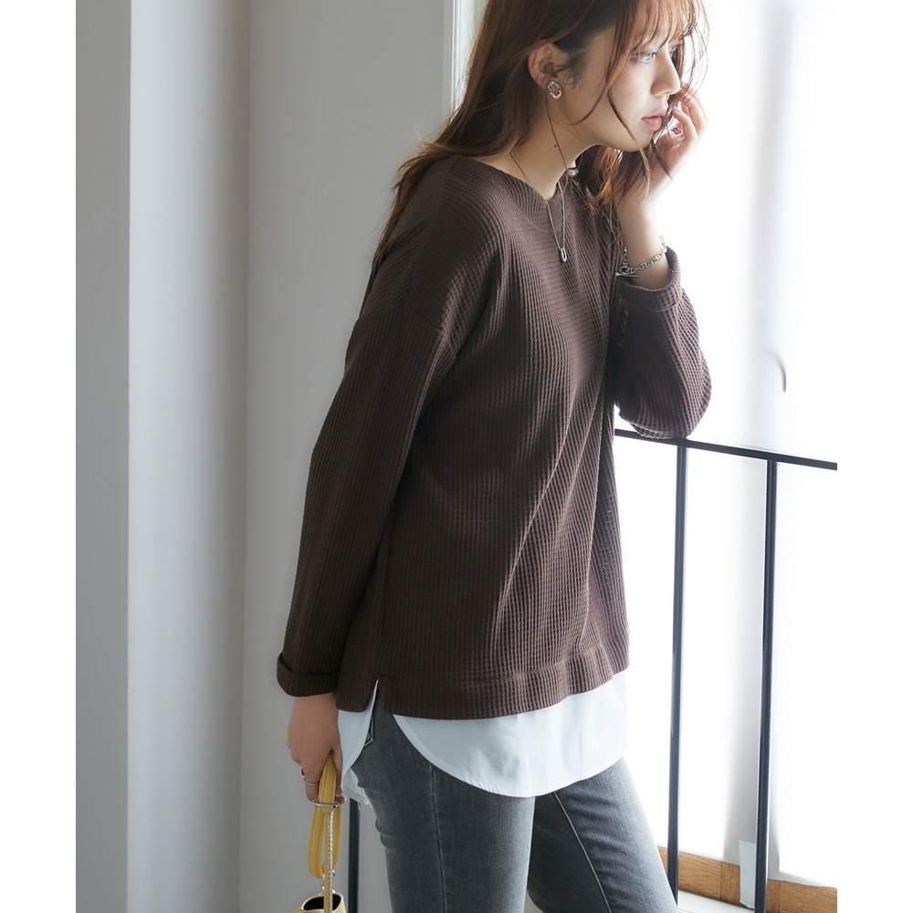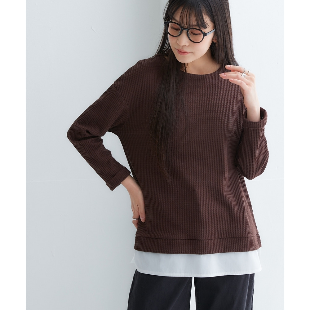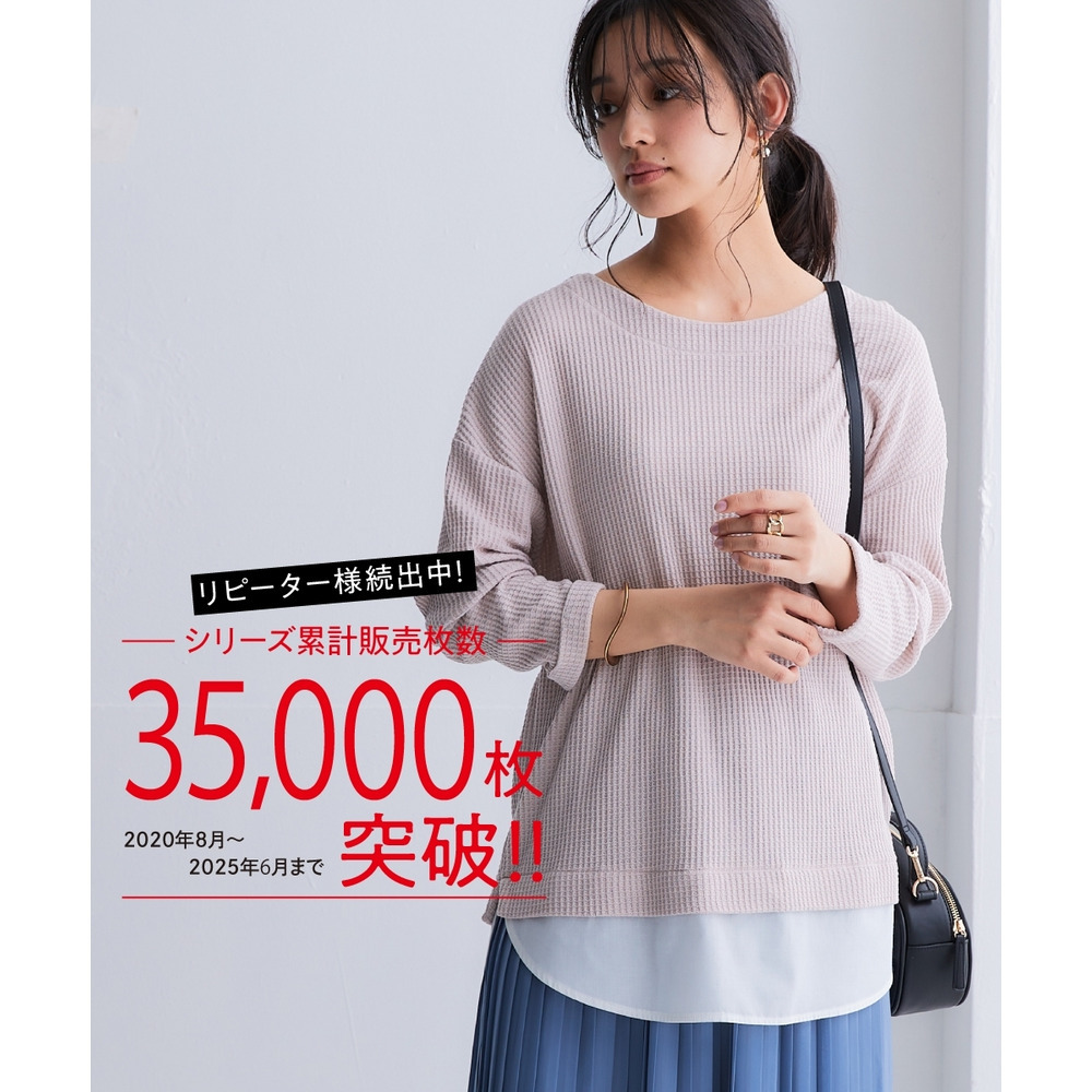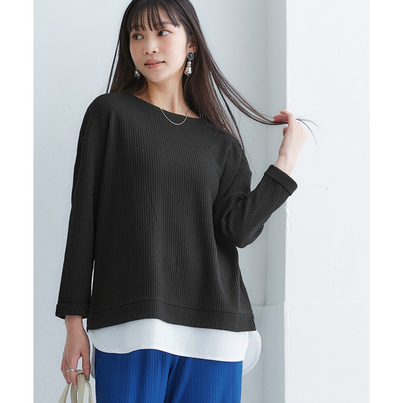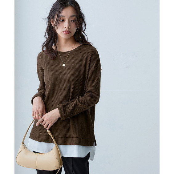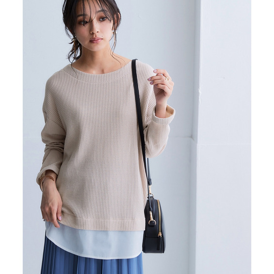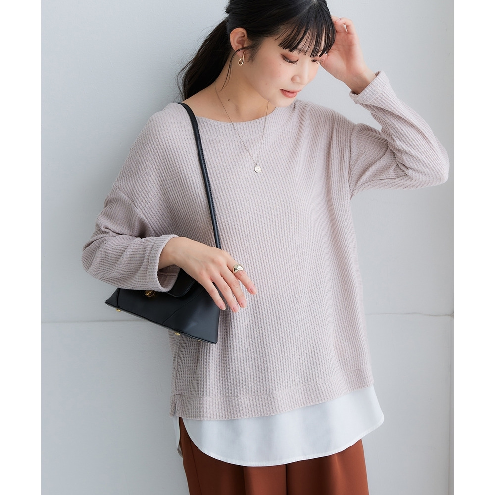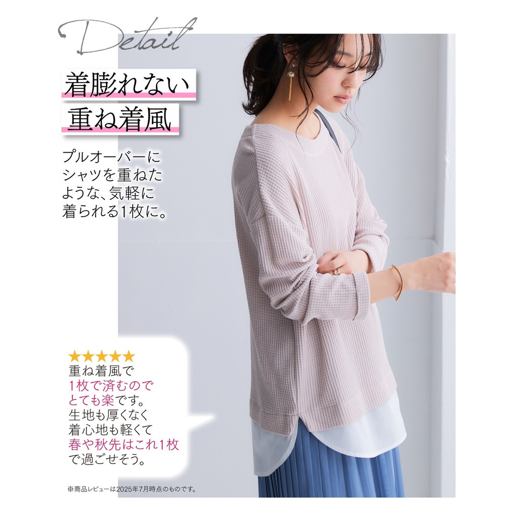 9分袖のゆったり感のあるプルオーバーにシャツを重ねたようなデザインで、気楽に着られて1枚でサマになります。