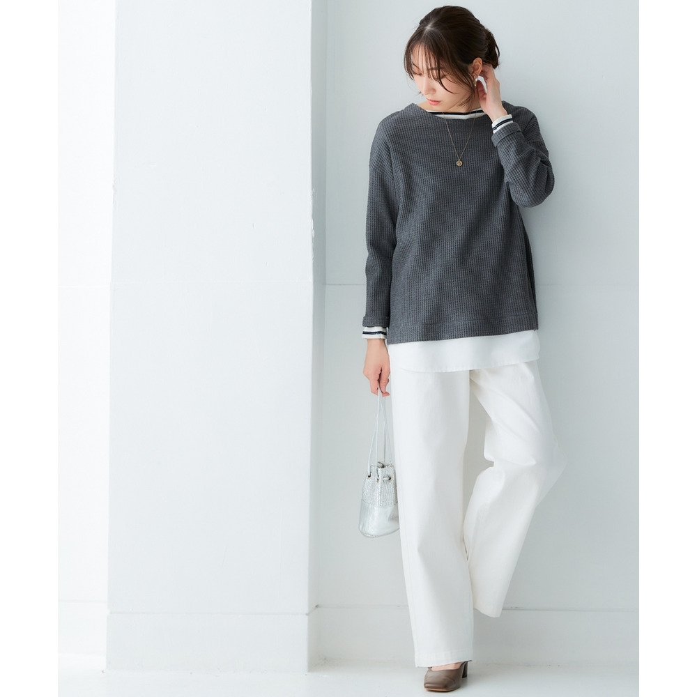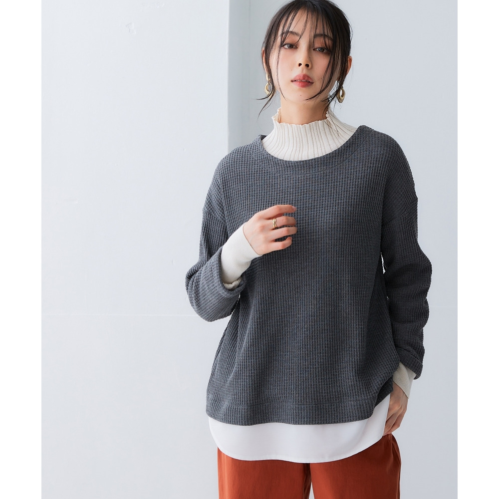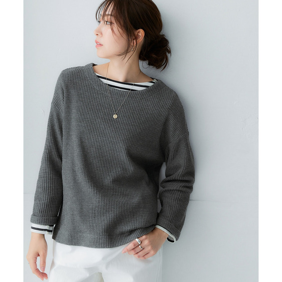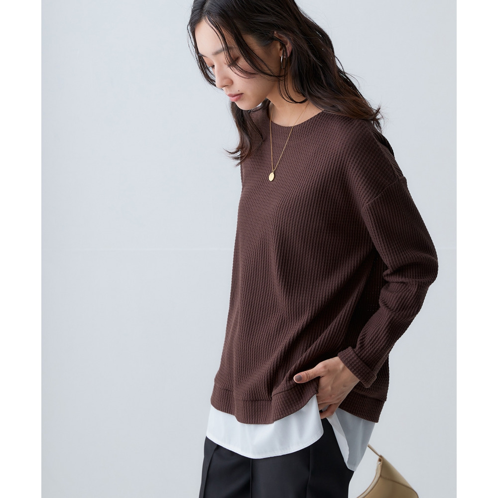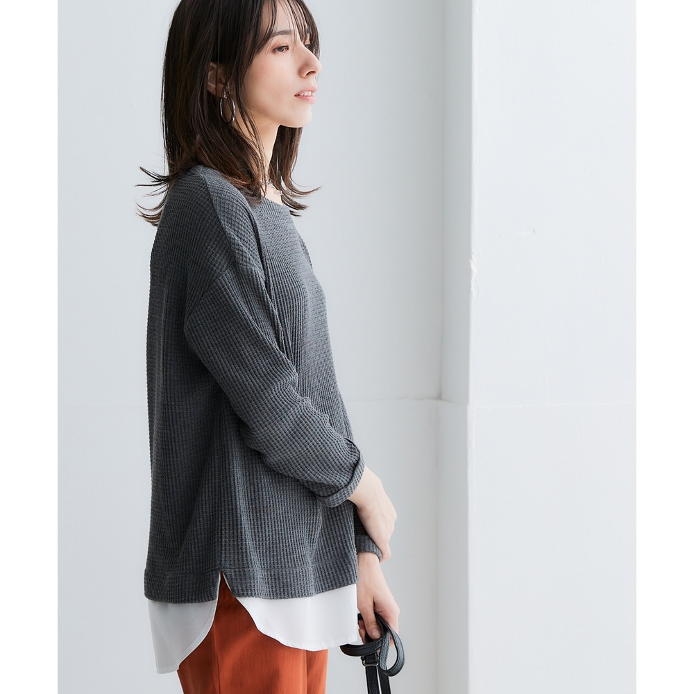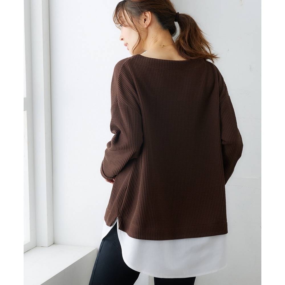 9分袖のゆったり感のあるプルオーバーにシャツを重ねたようなデザインで、気楽に着られて1枚でサマになります。