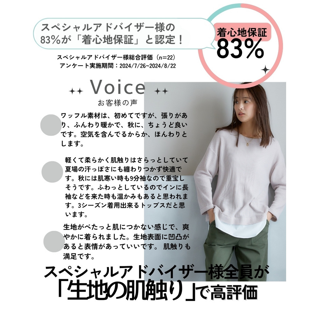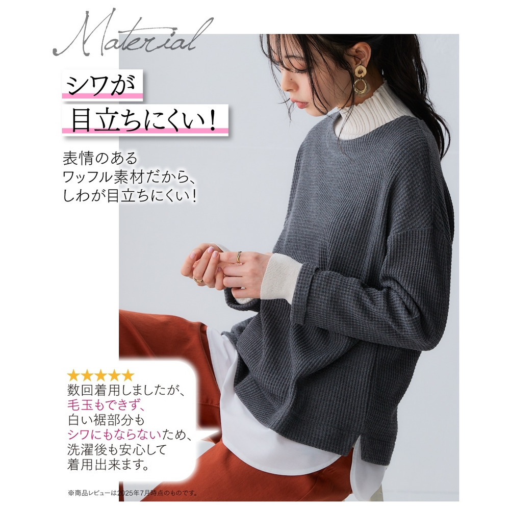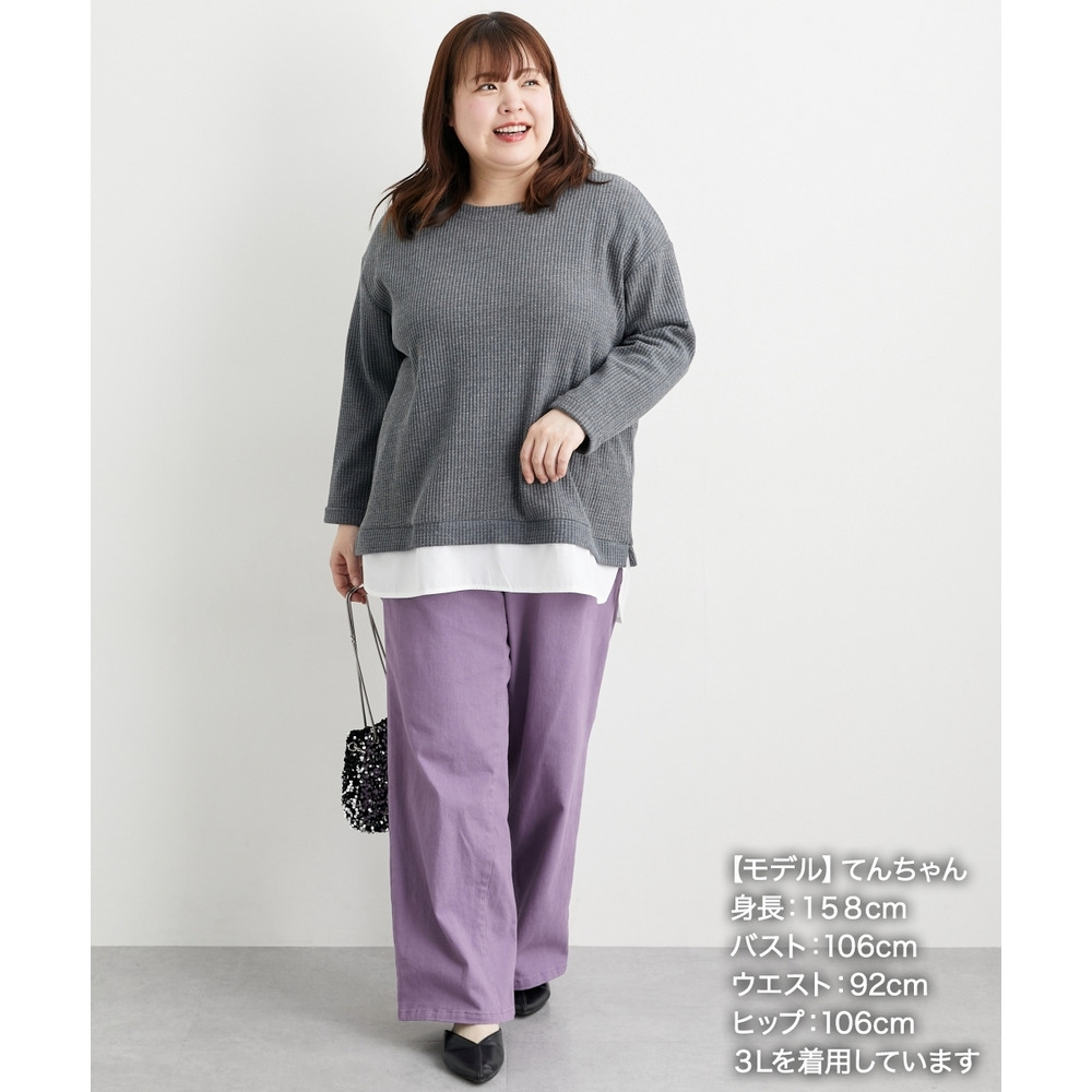 | 素材 | 品質:[本体]ポリエステル65%・綿35%(カットソー ワッフル) [別布部分]ポリエステル80%・綿20%(織物 平織) 袖口は折り返したデザインです。伸ばすことはできません。 この商品は着丈に前後差のあるデザインです。着丈はSNP(サイドネックポイント)~後身頃の裾までの寸法を記載しています 透け感:やや透ける ※色によって透け感が異なる場合があります。淡色カラーはベージュ系インナー着用をおすすめします。 伸縮性:あり 生地の厚み:普通 光沢感:なし ポケット:なし 季節:春・秋 シルエット:普通 |