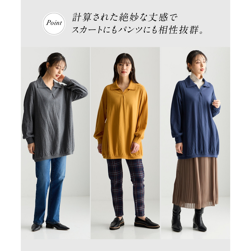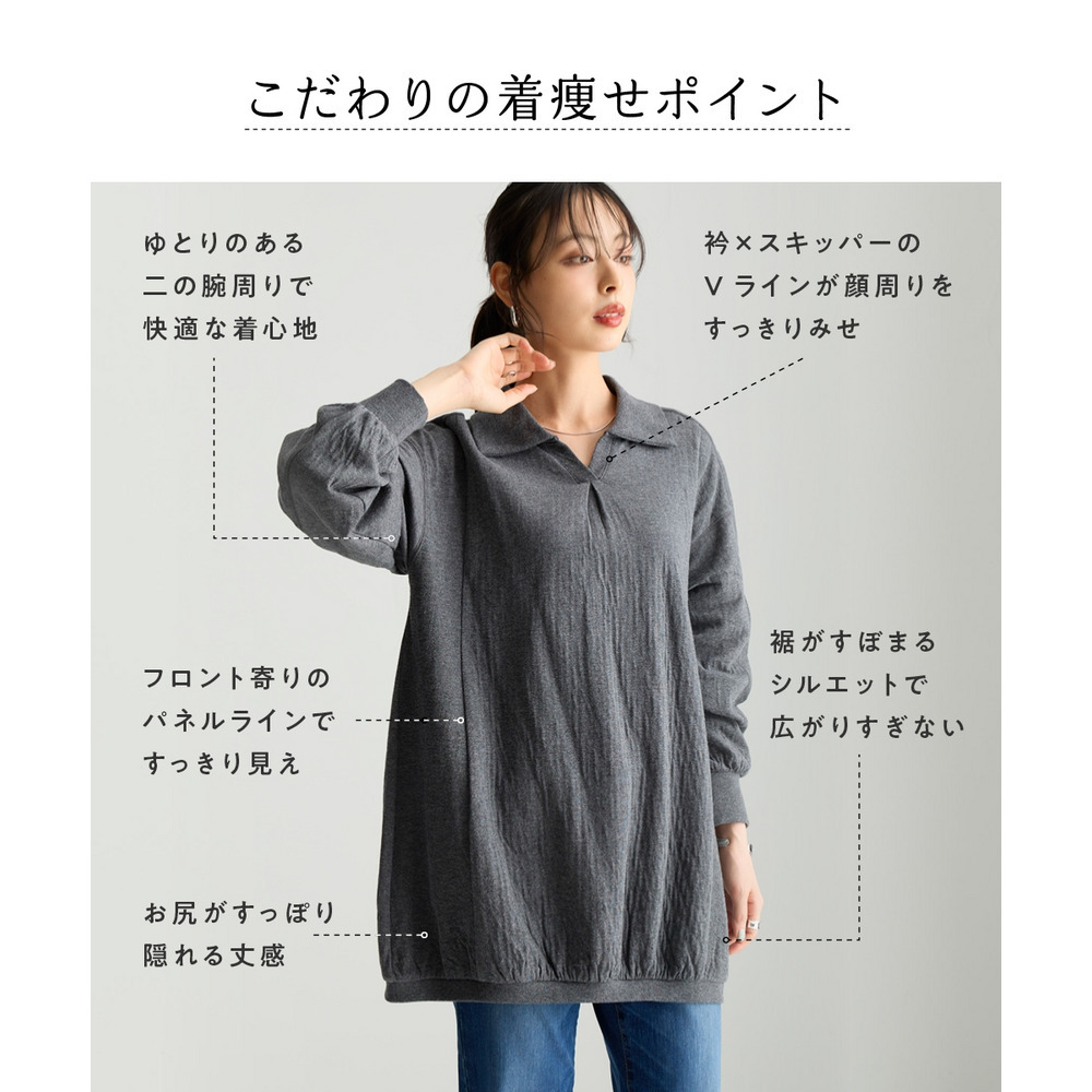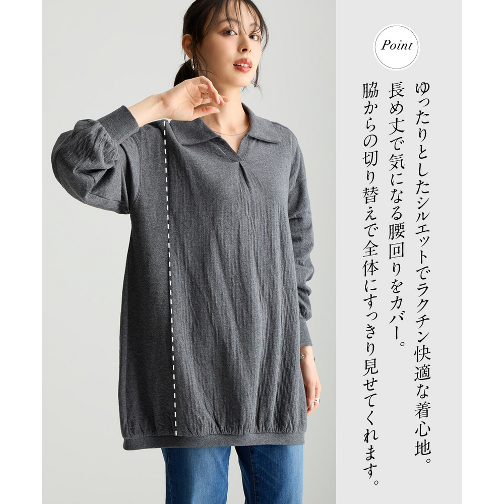 綿100%甘編みやわらかカットソースッキリ見えポロチュニック 大きいサイズ