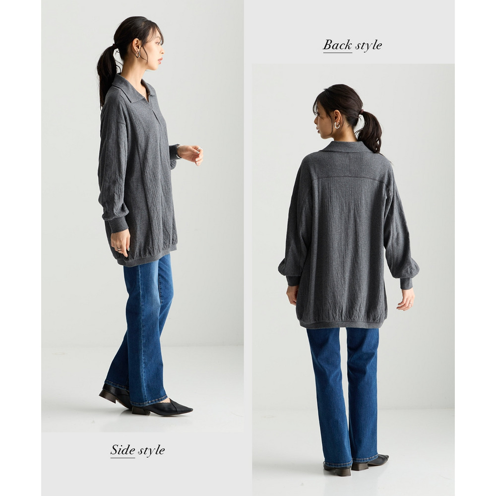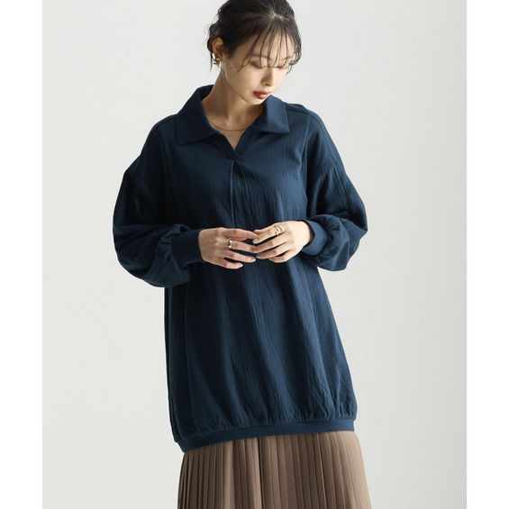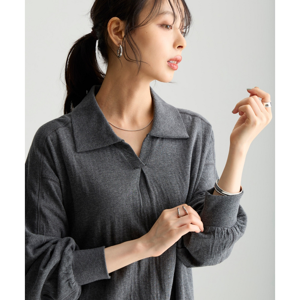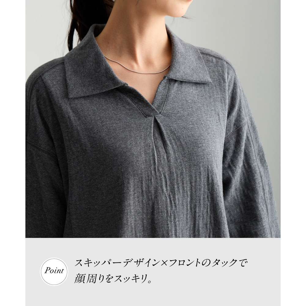 スキッパー襟+襟付きデザインで顔周りはシャープに。