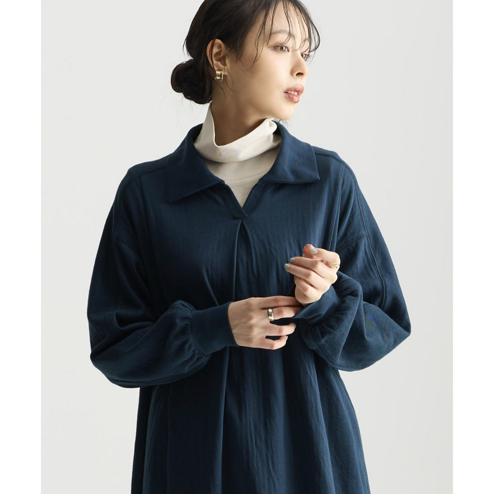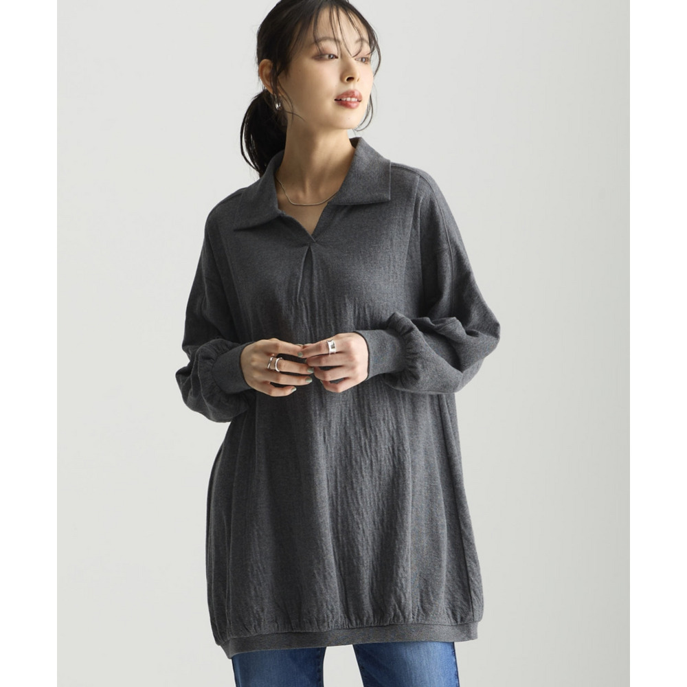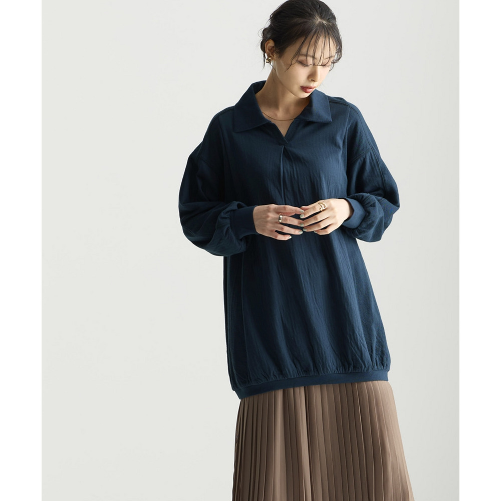 スキッパー襟+襟付きデザインで顔周りはシャープに。