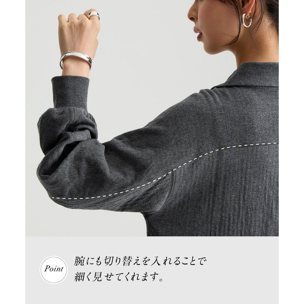 裾に向かってややしぼまるシルエットは、広がらずすっきり見せてくれます脇&腕の切り替えで細見え効果が。