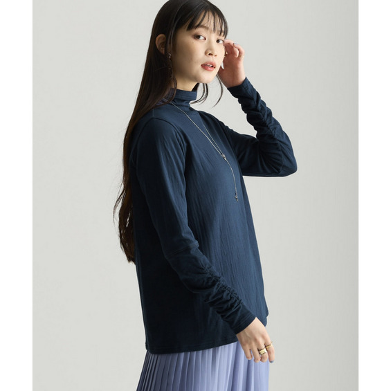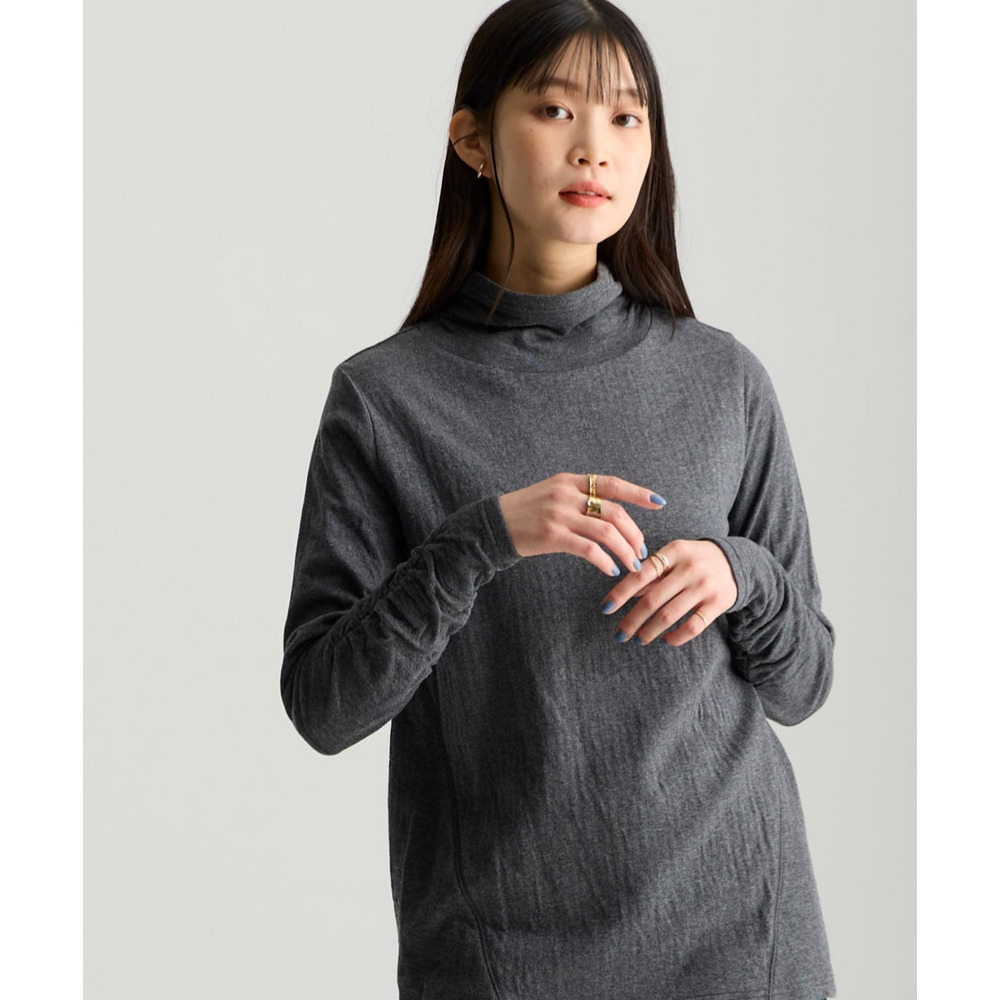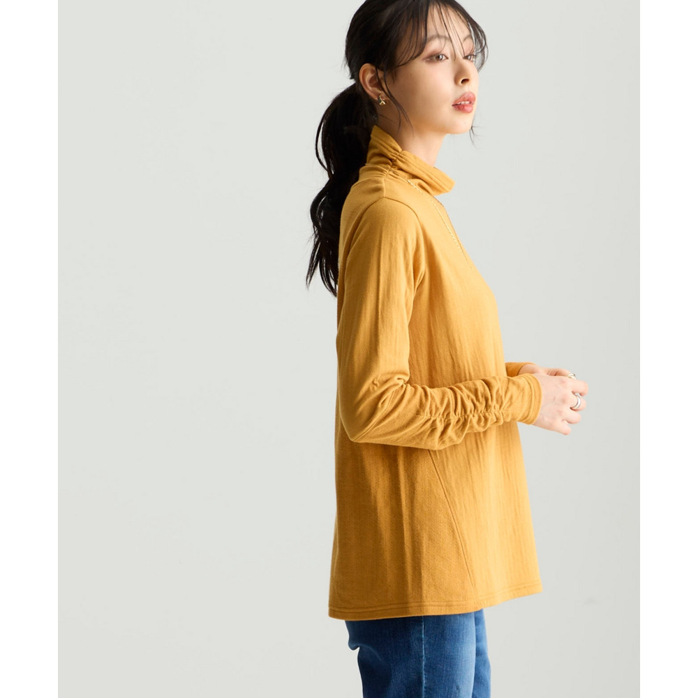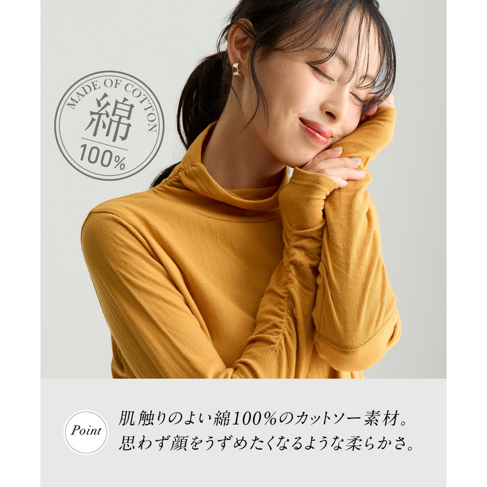 綿100%甘編みやわらかカットソー袖シャーリング使いすっきり見えタートルプルオーバー 大きいサイズ