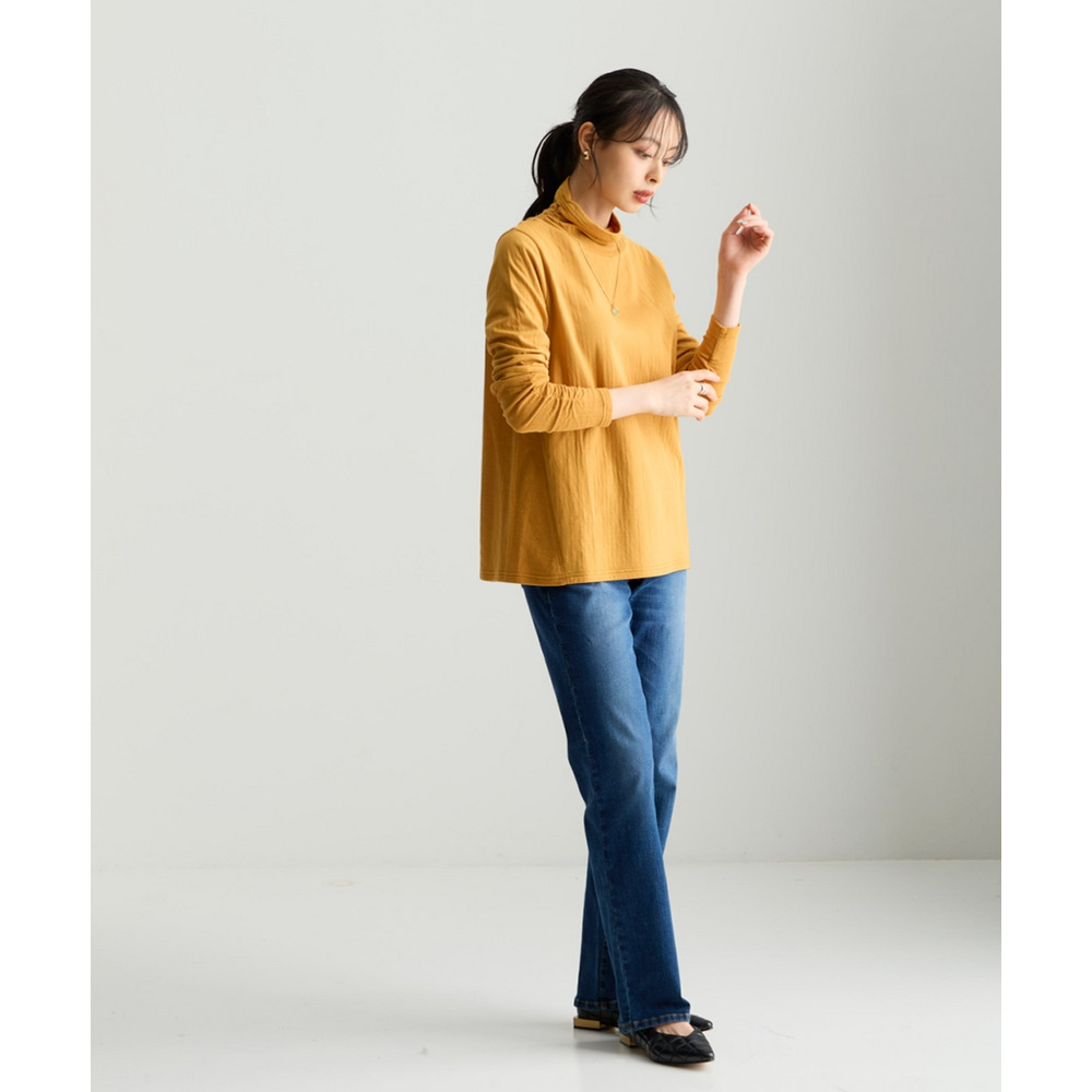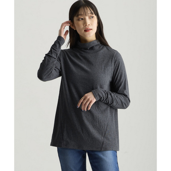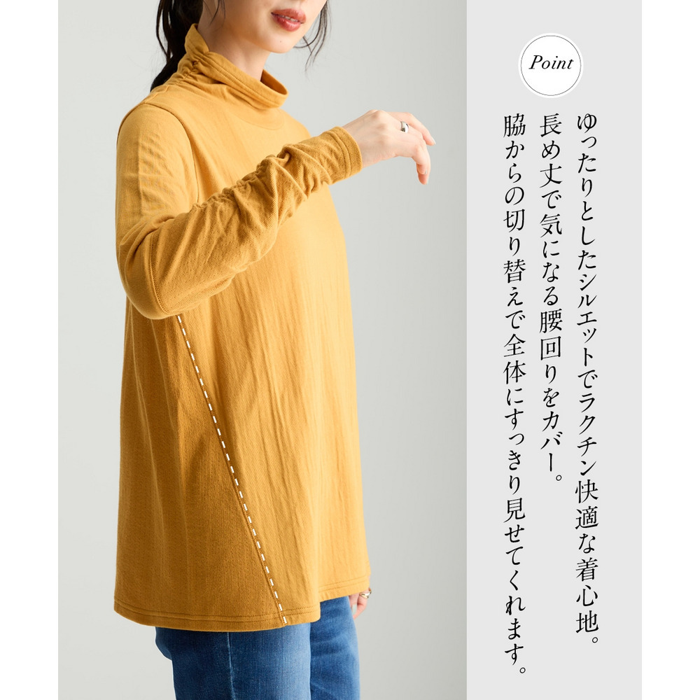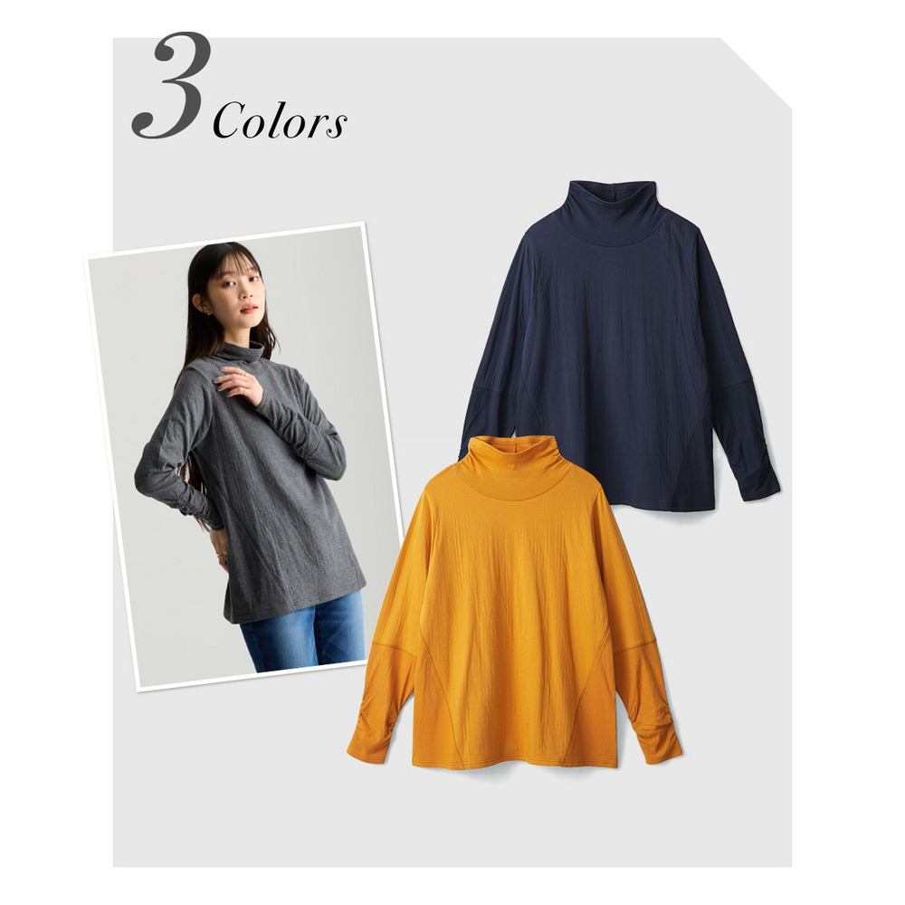 綿100%甘編みやわらかカットソー袖シャーリング使いすっきり見えタートルプルオーバー 大きいサイズ