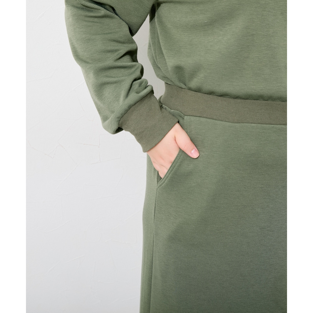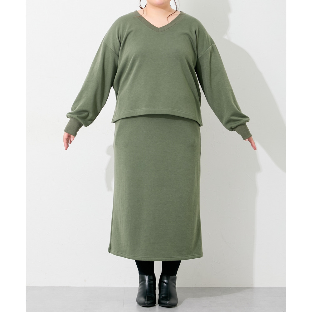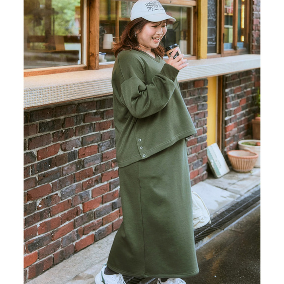 例えば、カーキのVネックトップスとナロースカートの組み合わせは、カジュアルながらも上品な印象に。