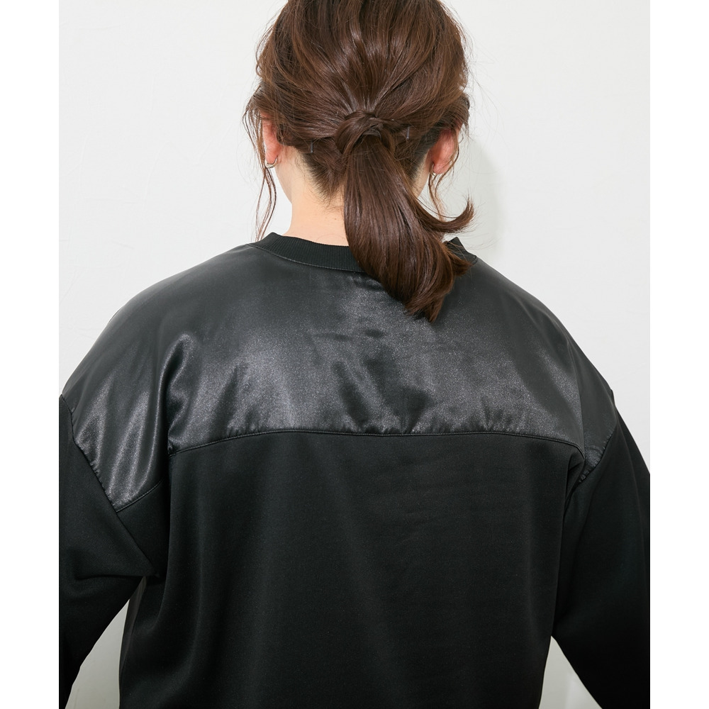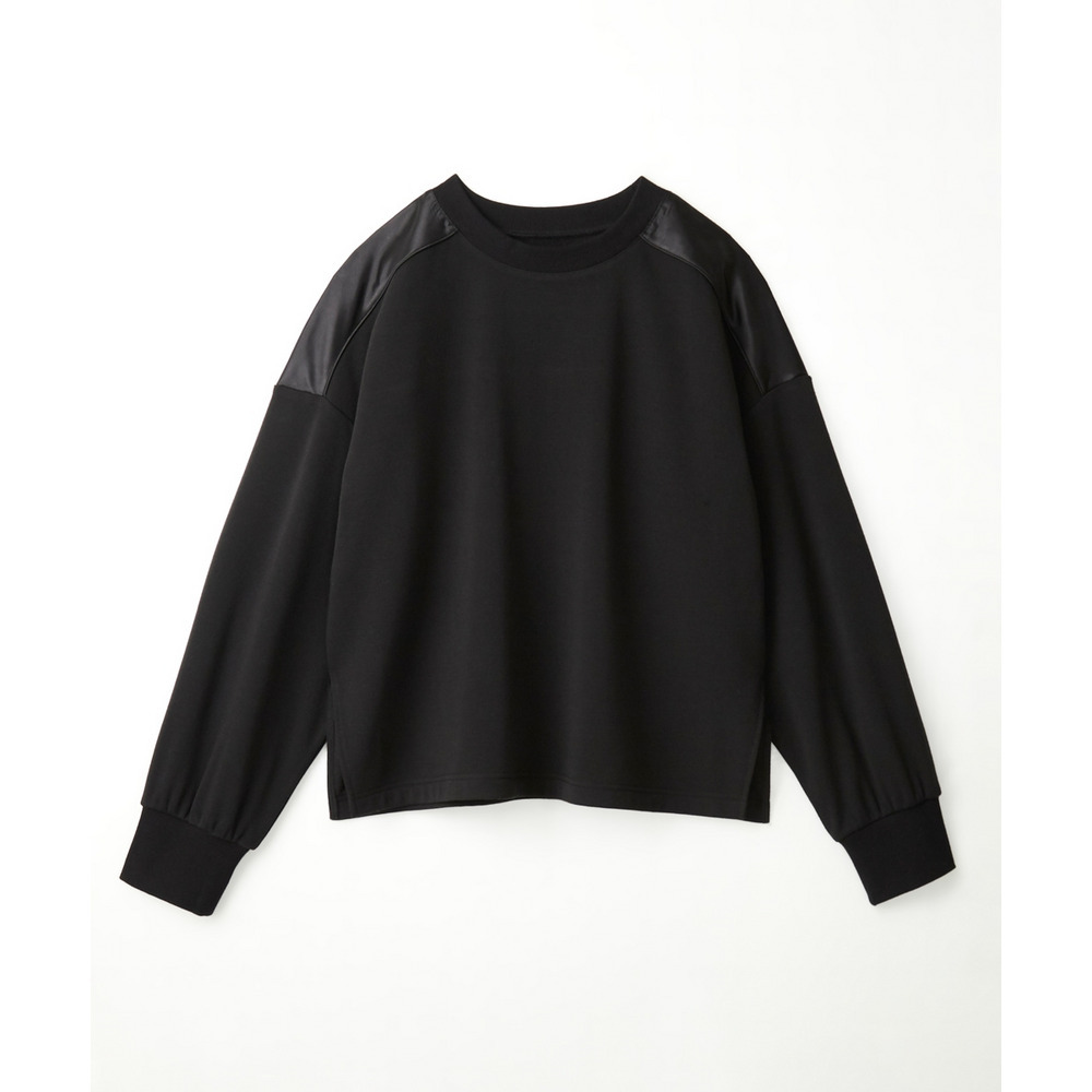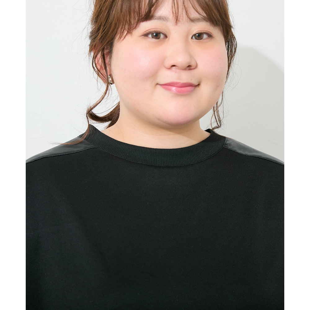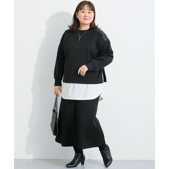 ブラックの異素材切り替えトップスとAラインスカートの組み合わせは、