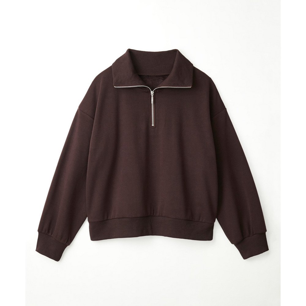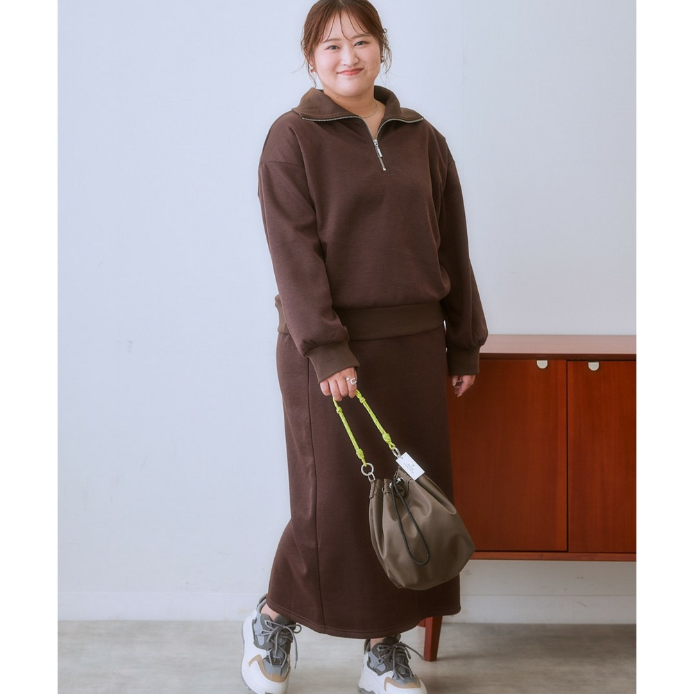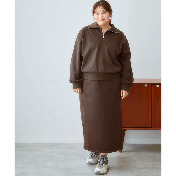 ブラウンのハーフジップトップスとナロースカートの組み合わせは、よりリラックス感のある着こなしに。