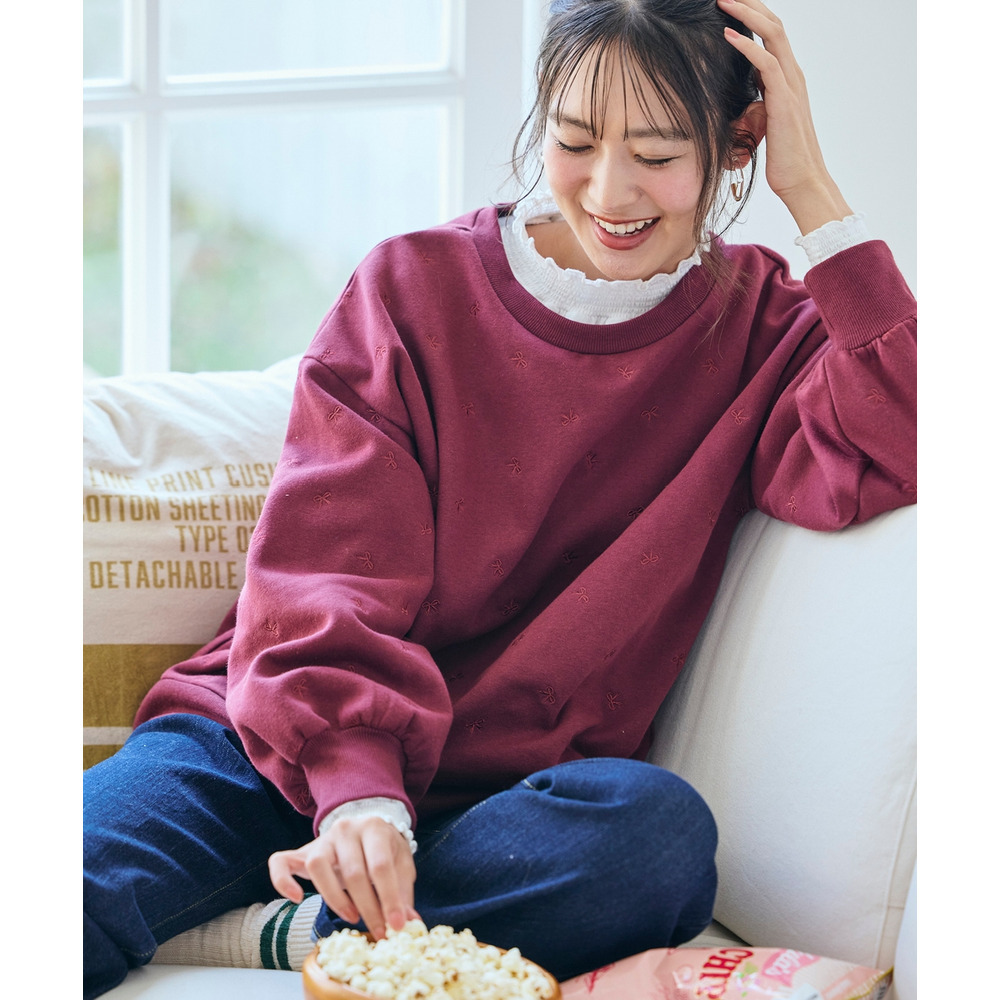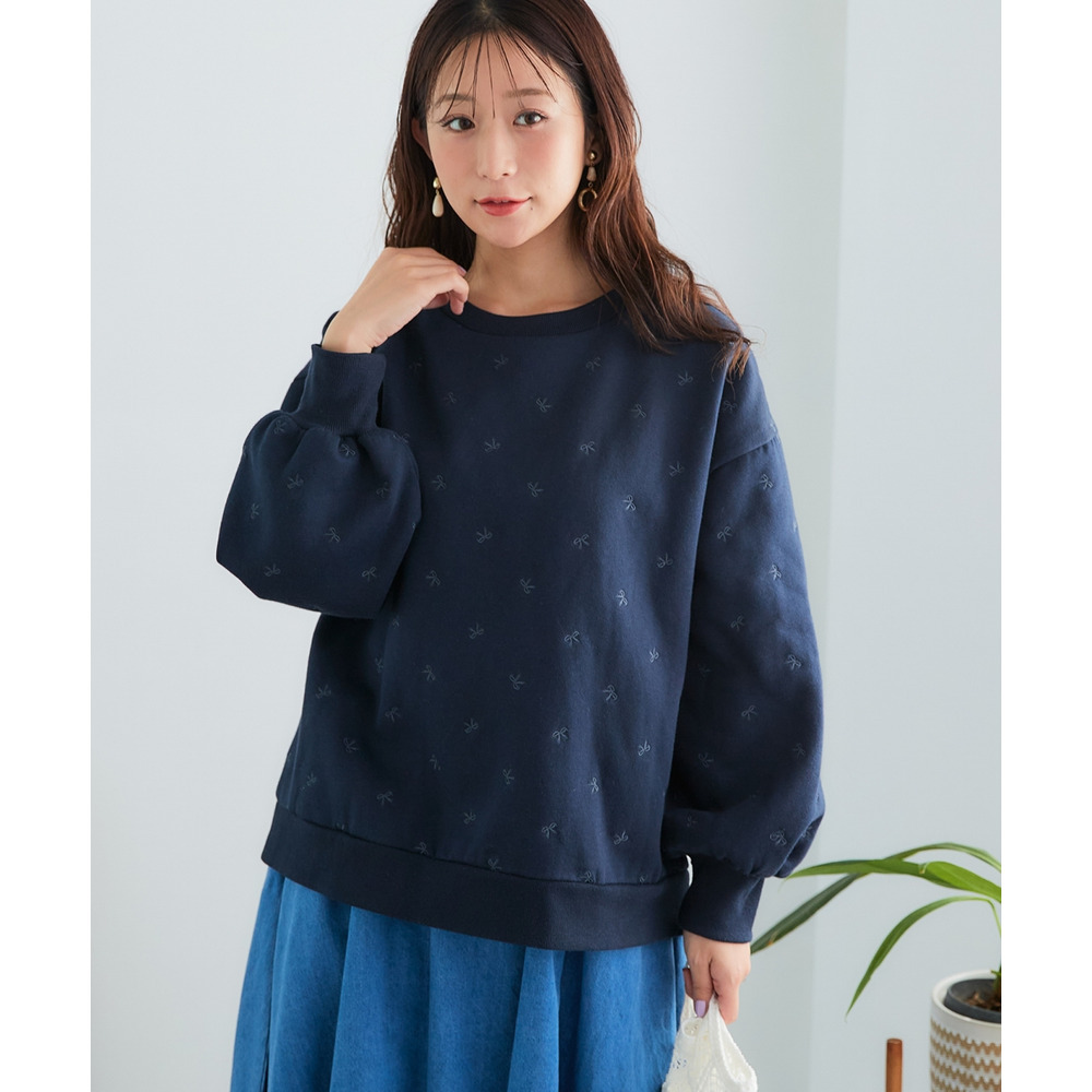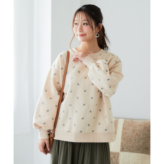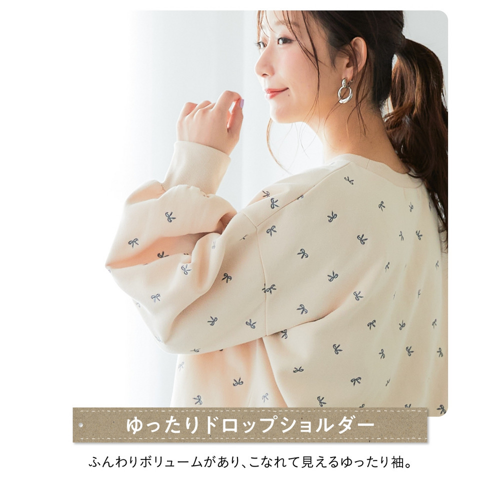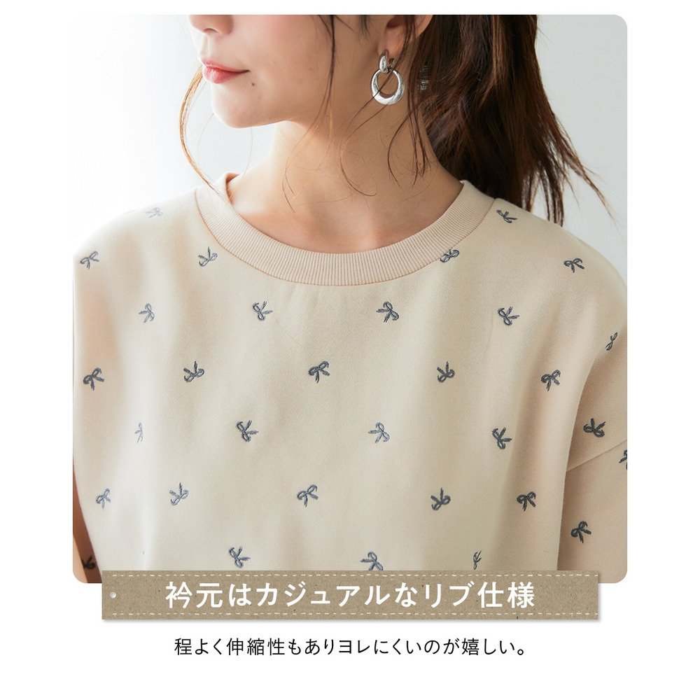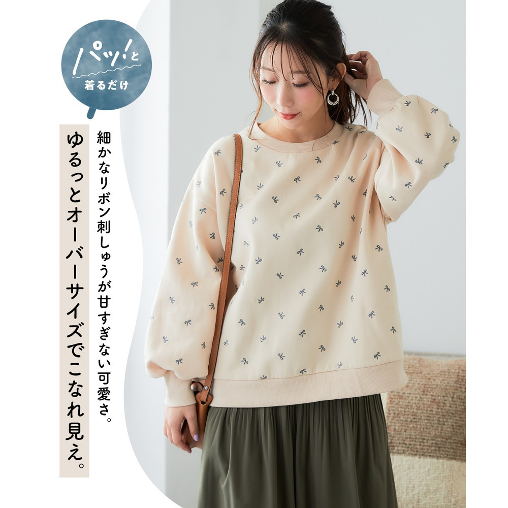 柔らか裏起毛リボン柄刺しゅうゆるシルエットトレーナー 大きいサイズ