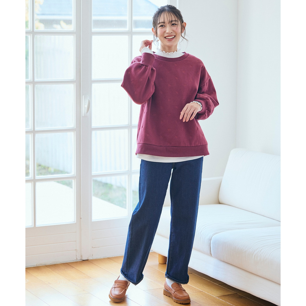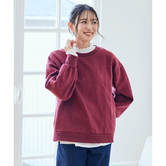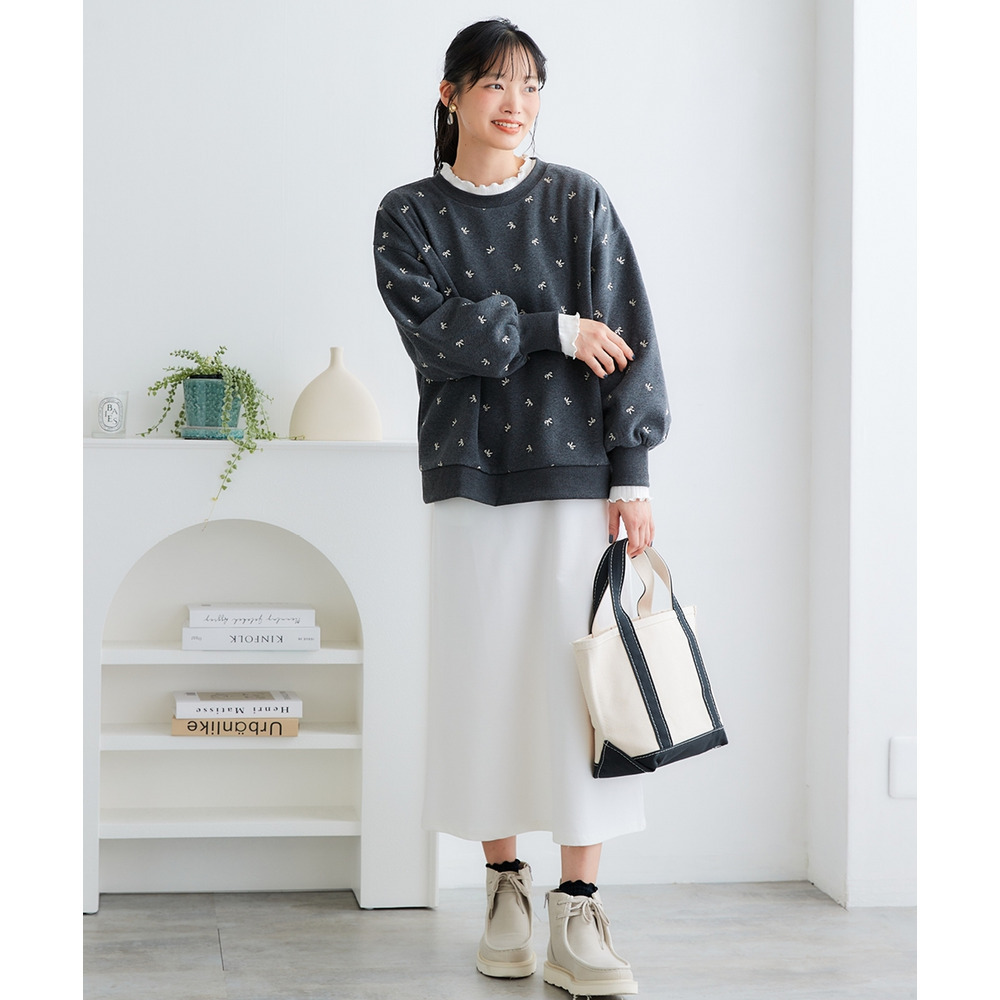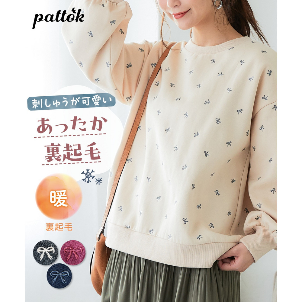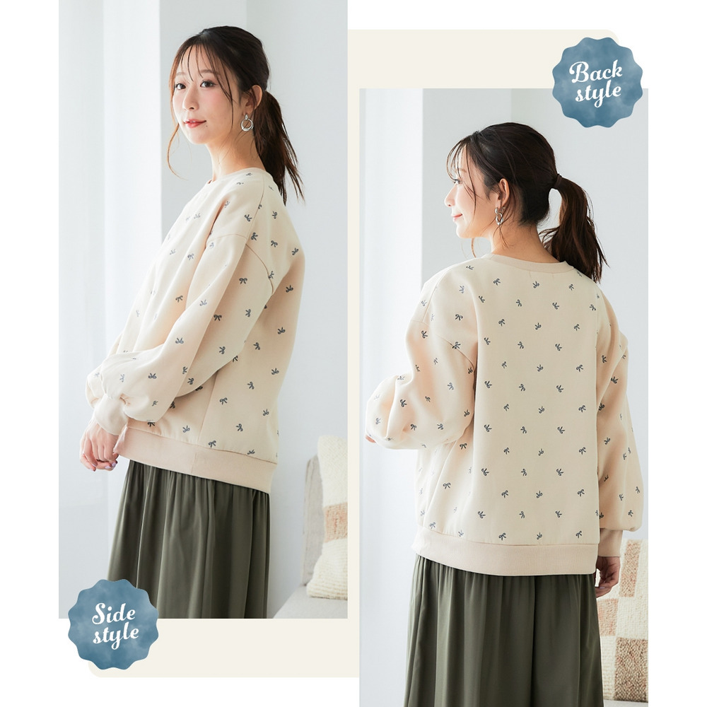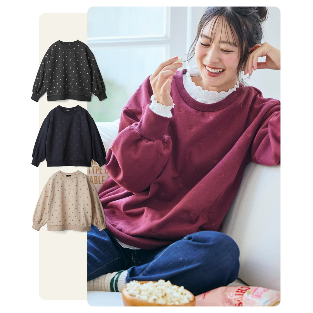 柔らか裏起毛リボン柄刺しゅうゆるシルエットトレーナー 大きいサイズ