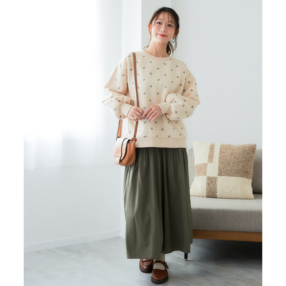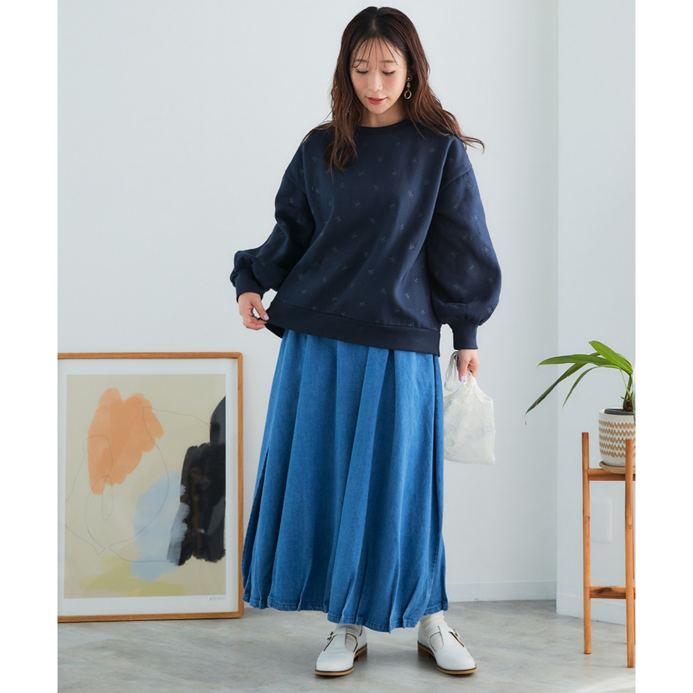 アクセサリーはシンプルなものを選び、トレーナーのリボン柄を際立たせるのがおすすめです。