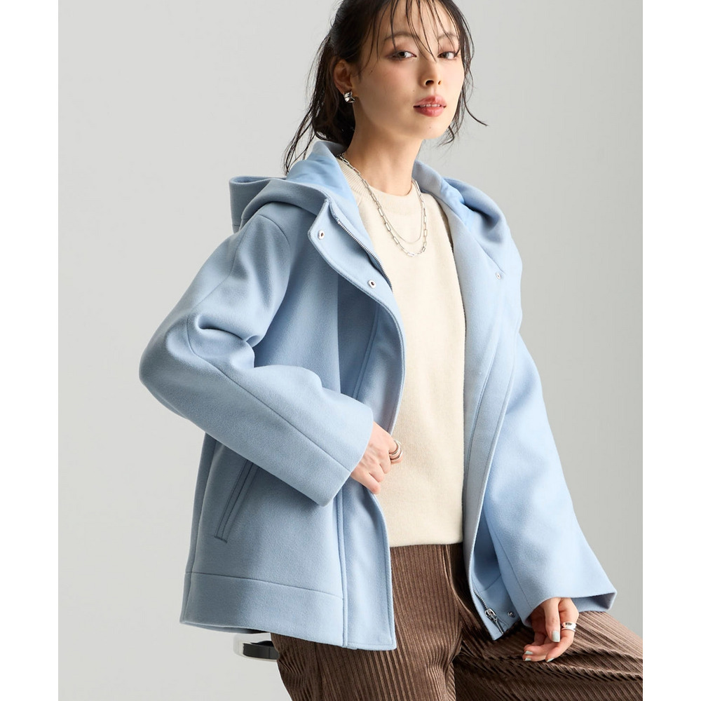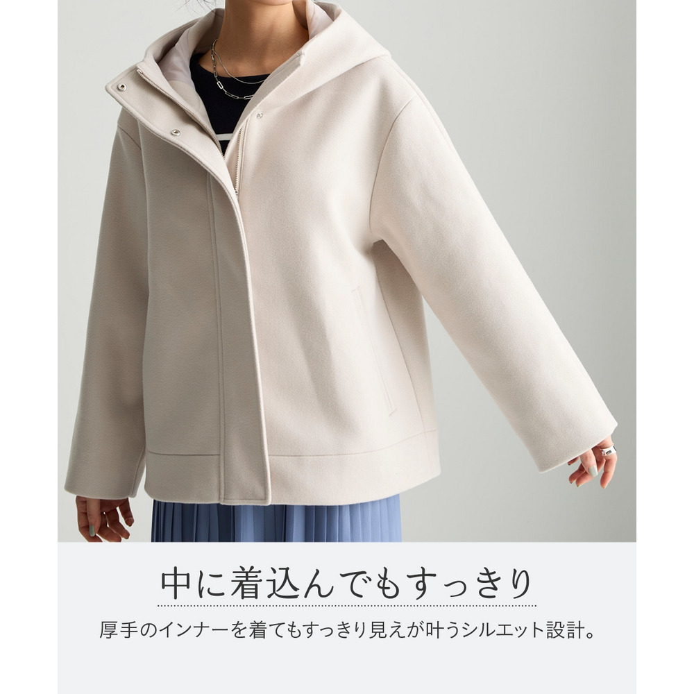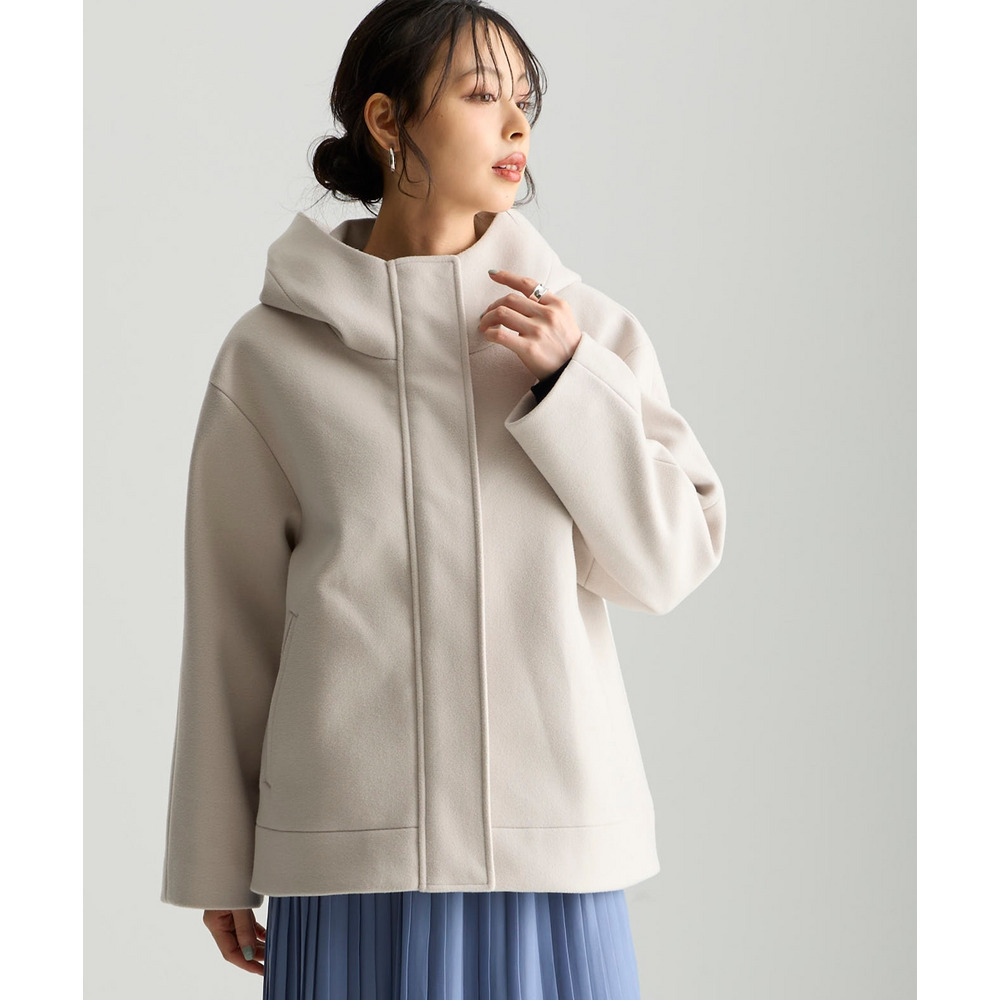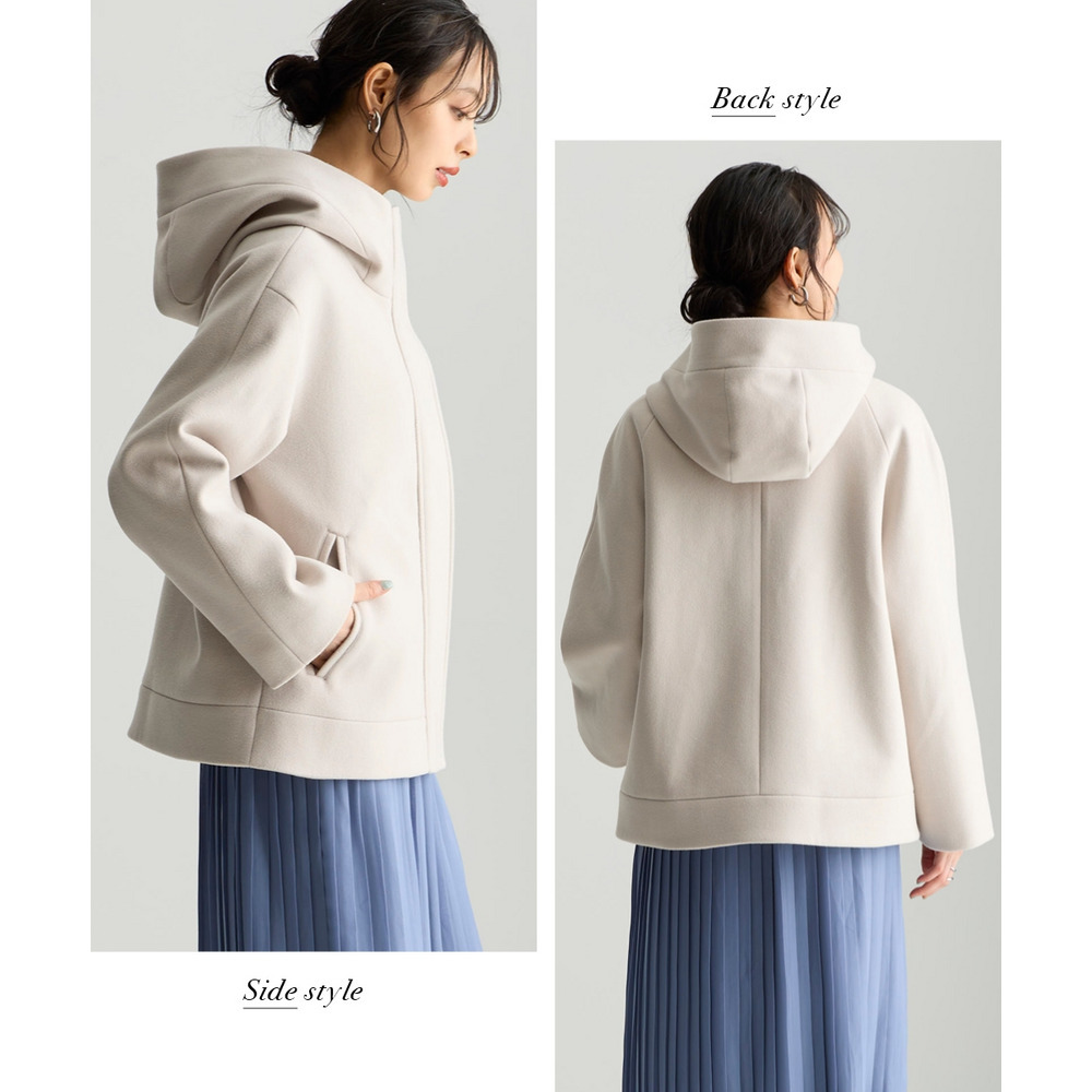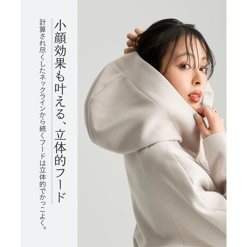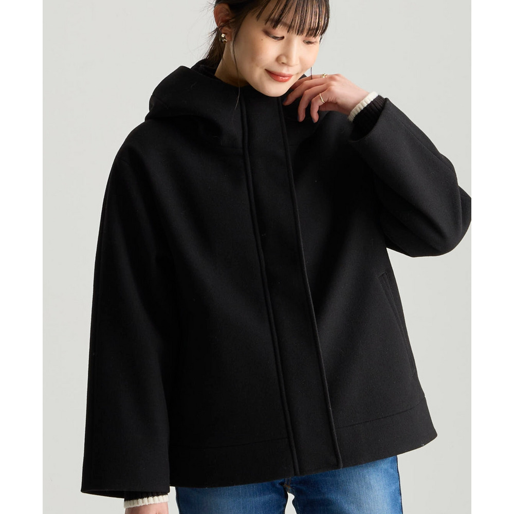 ラグランスリーブに大きなフードがやわらかな印象を与えるショート丈コート。