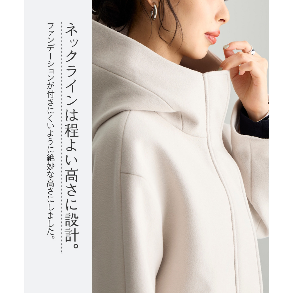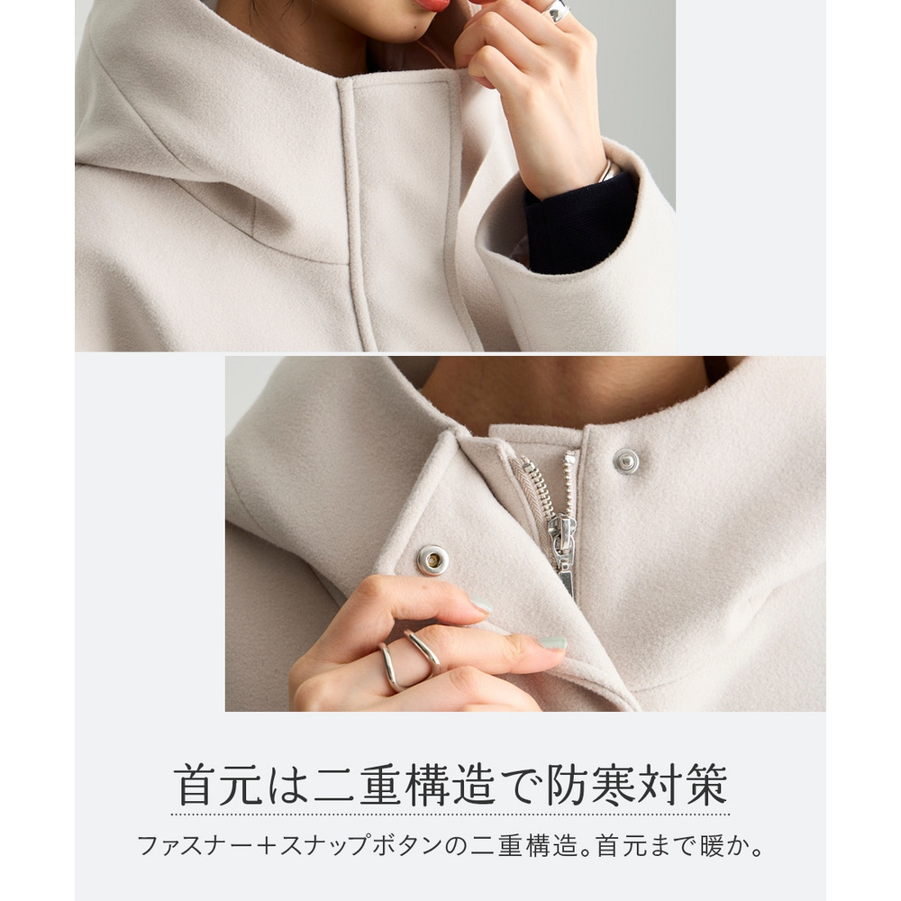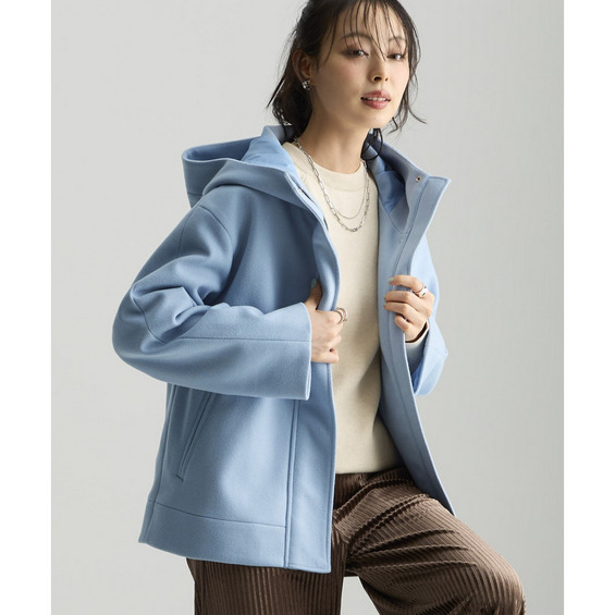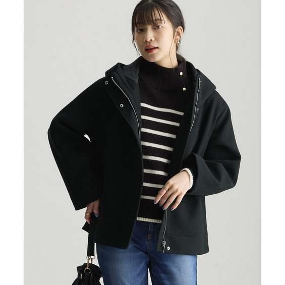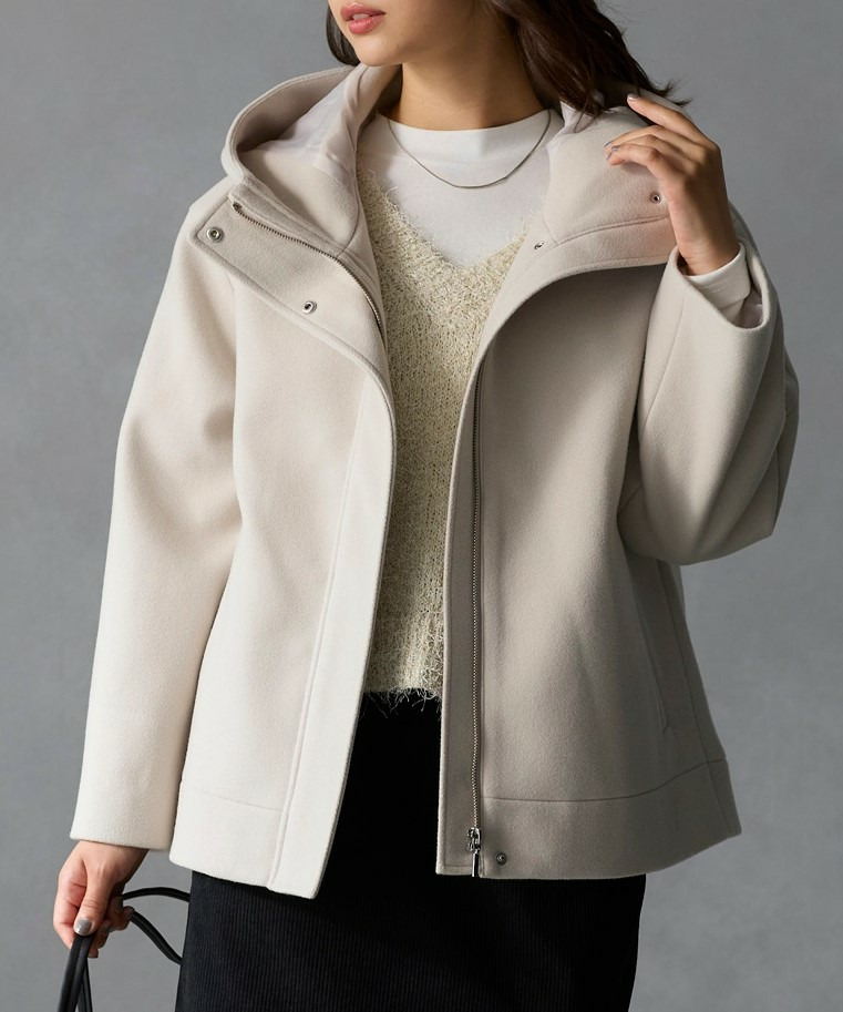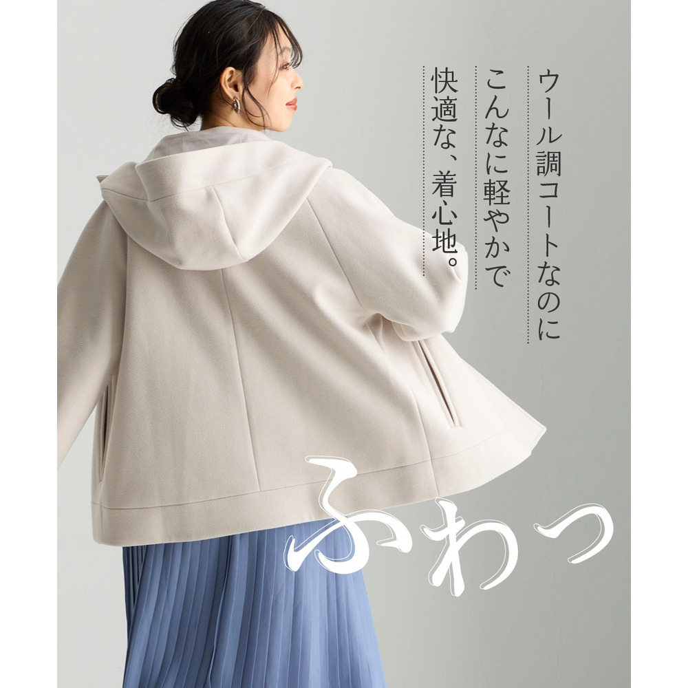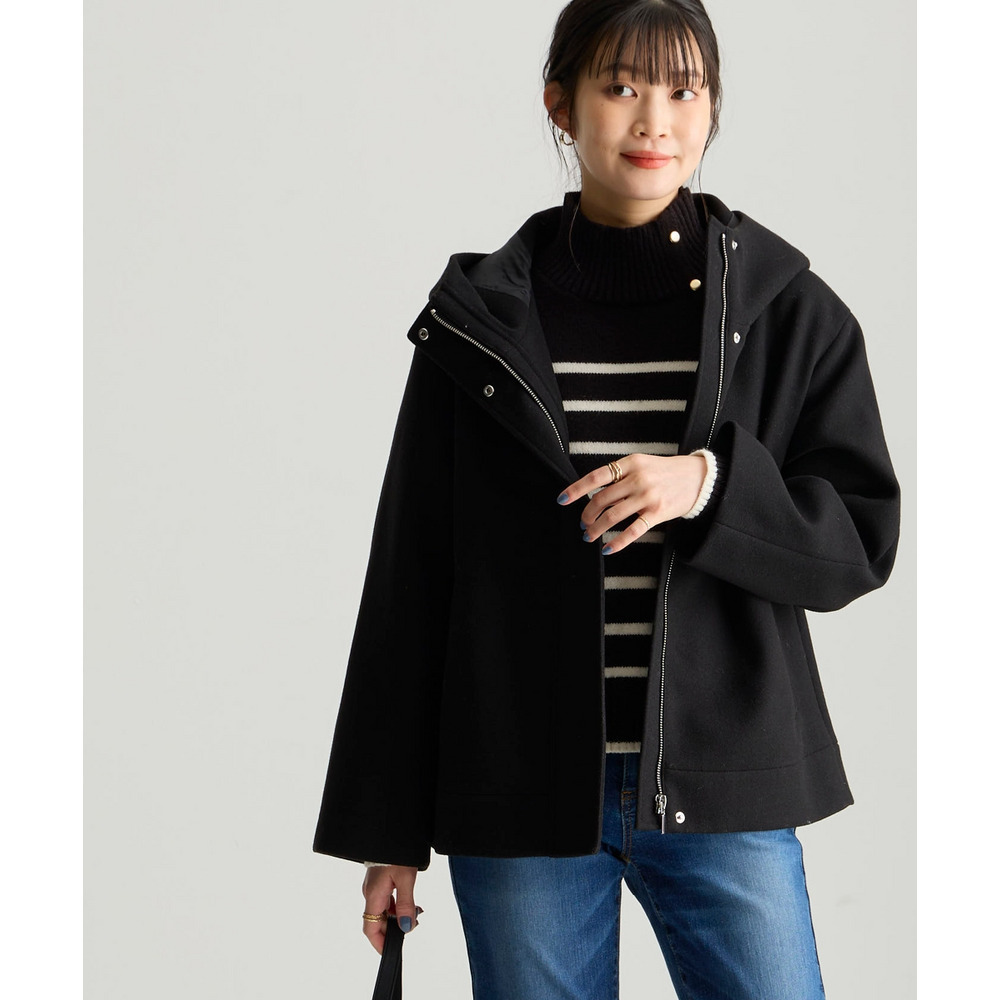 ラグランスリーブに大きなフードがやわらかな印象を与えるショート丈コート。