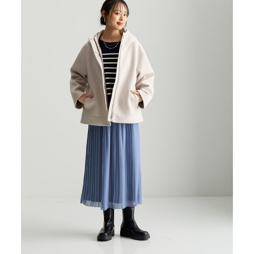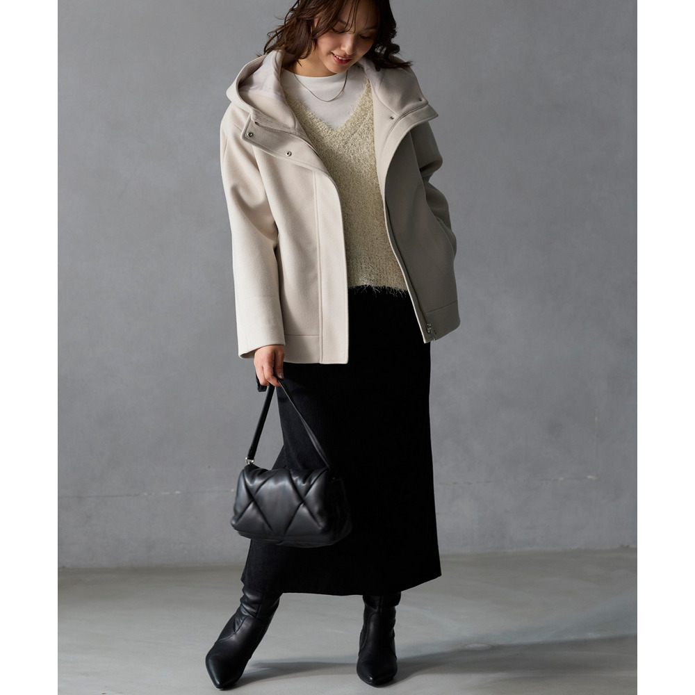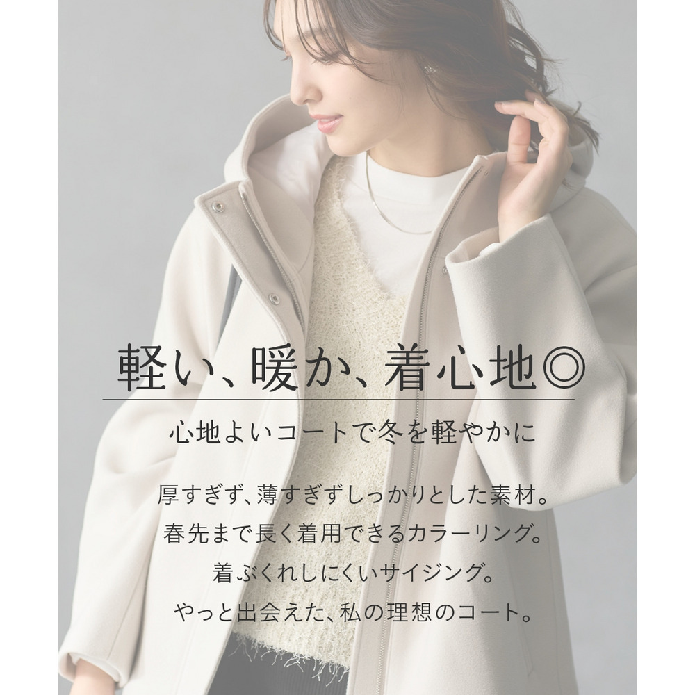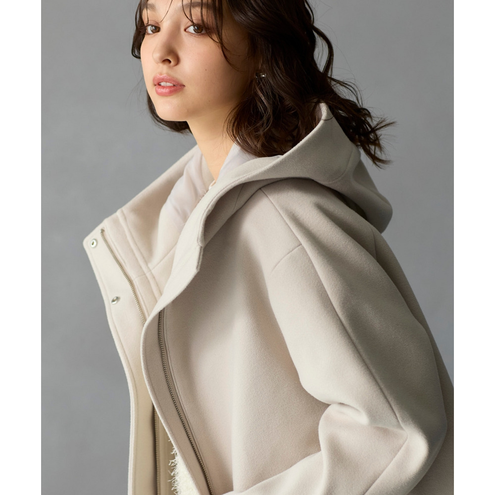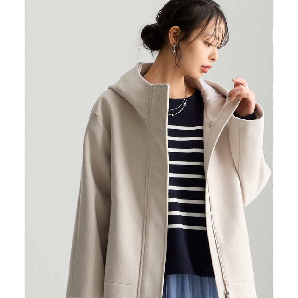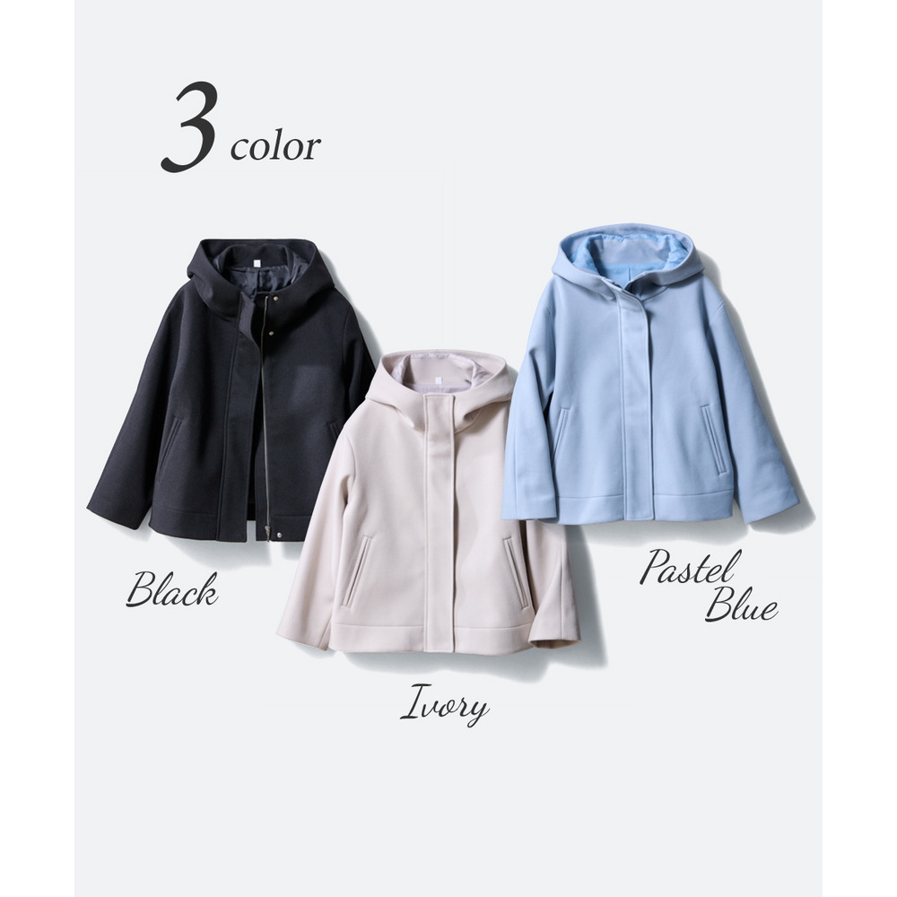 ラグランスリーブに大きなフードがやわらかな印象を与えるショート丈コート。