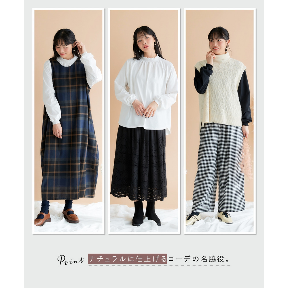 首元は甘すぎないフリルネックで、顔周りを華やかに演出しつつ、首のラインを美しく見せてくれます。