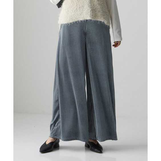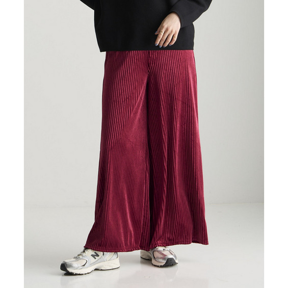 しっとりとなめらかな光沢感が魅力のベロア素材で仕立てたトレンド感あふれるワイドパンツ。