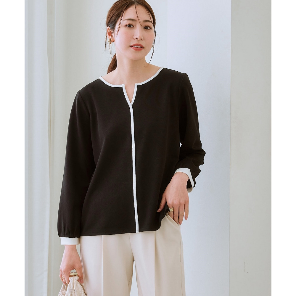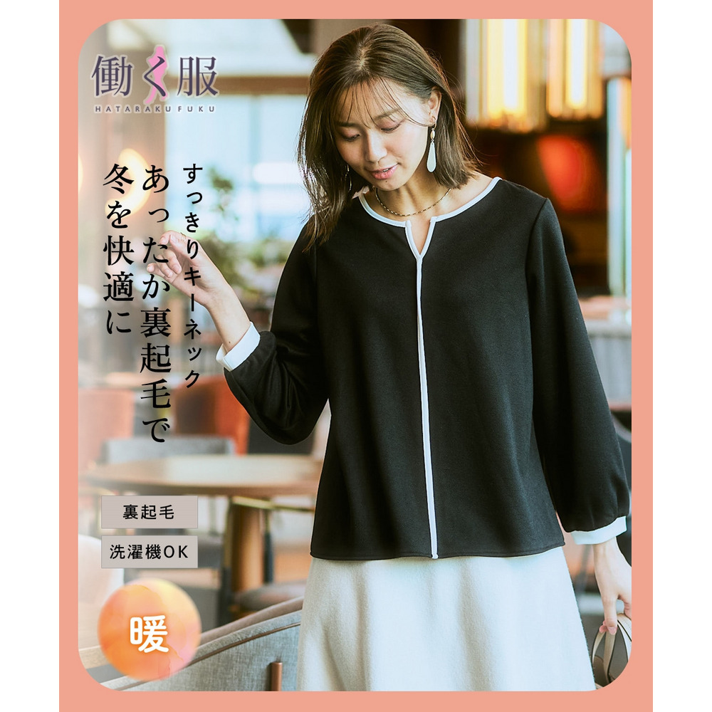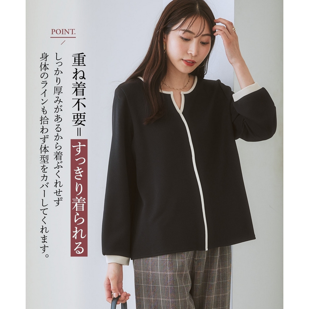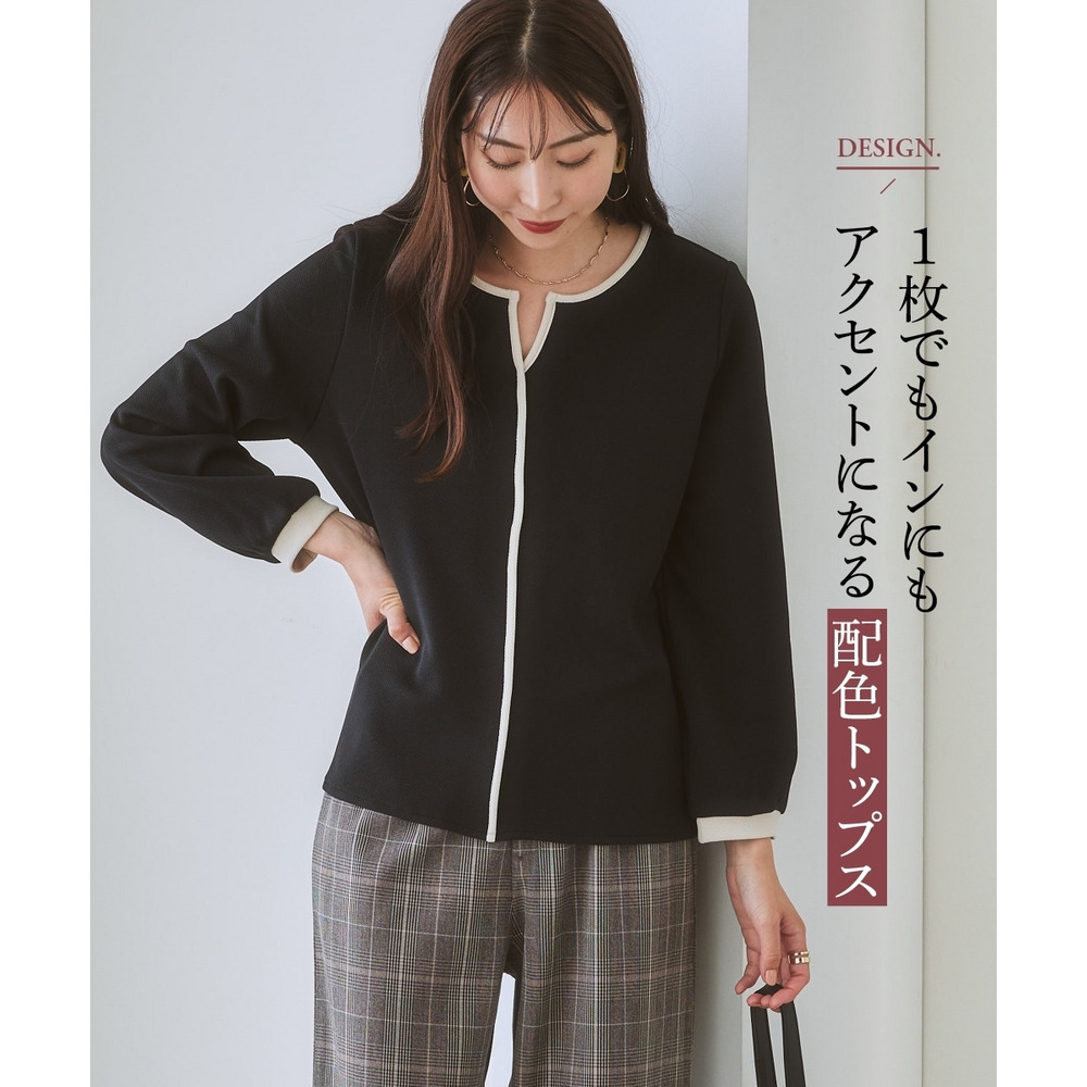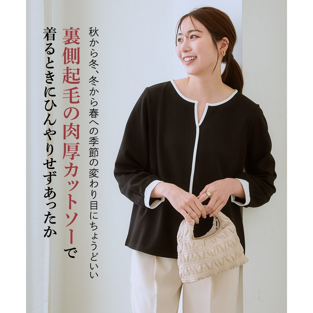 【裏側起毛であったか】配色使いキーネックトップス 大きいサイズ