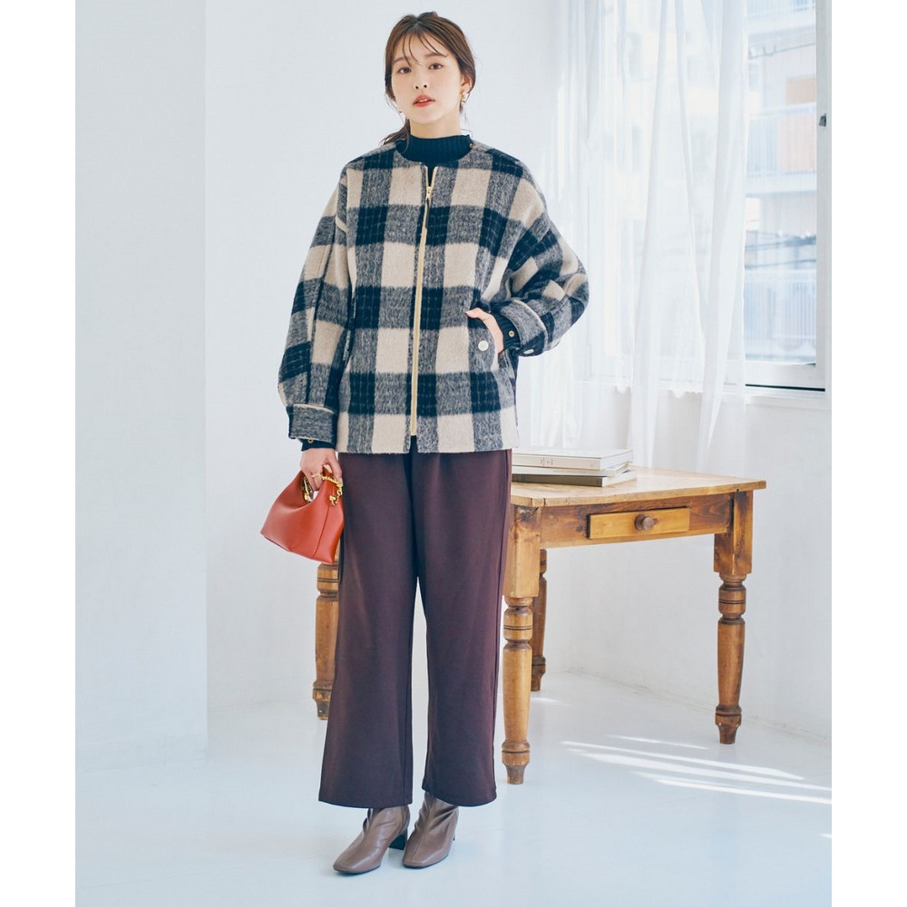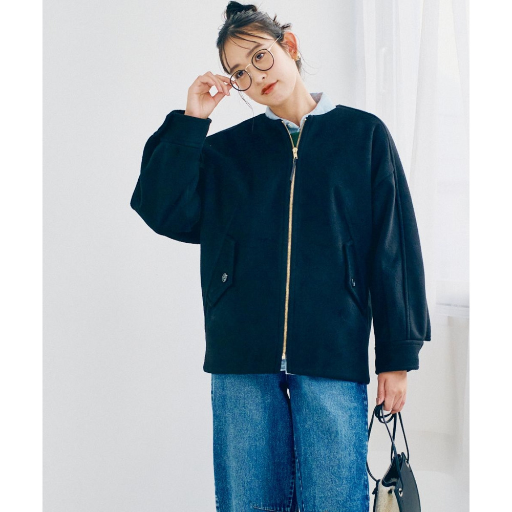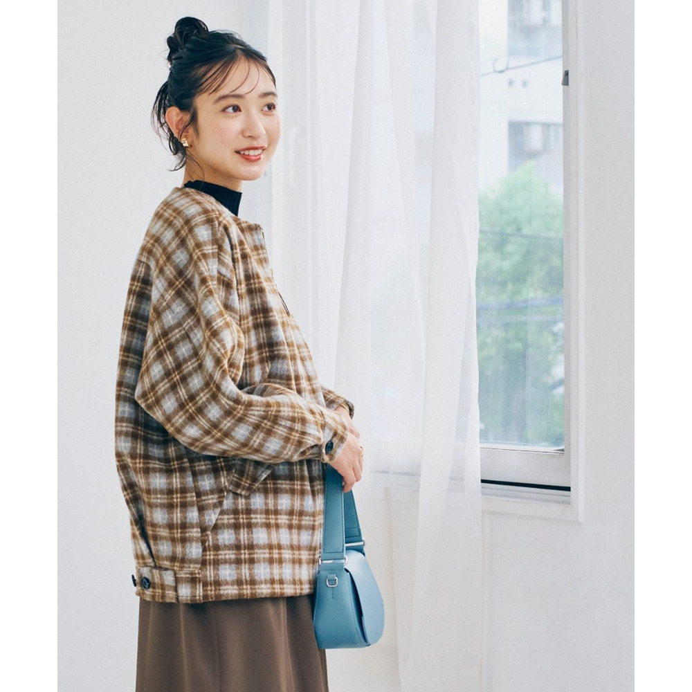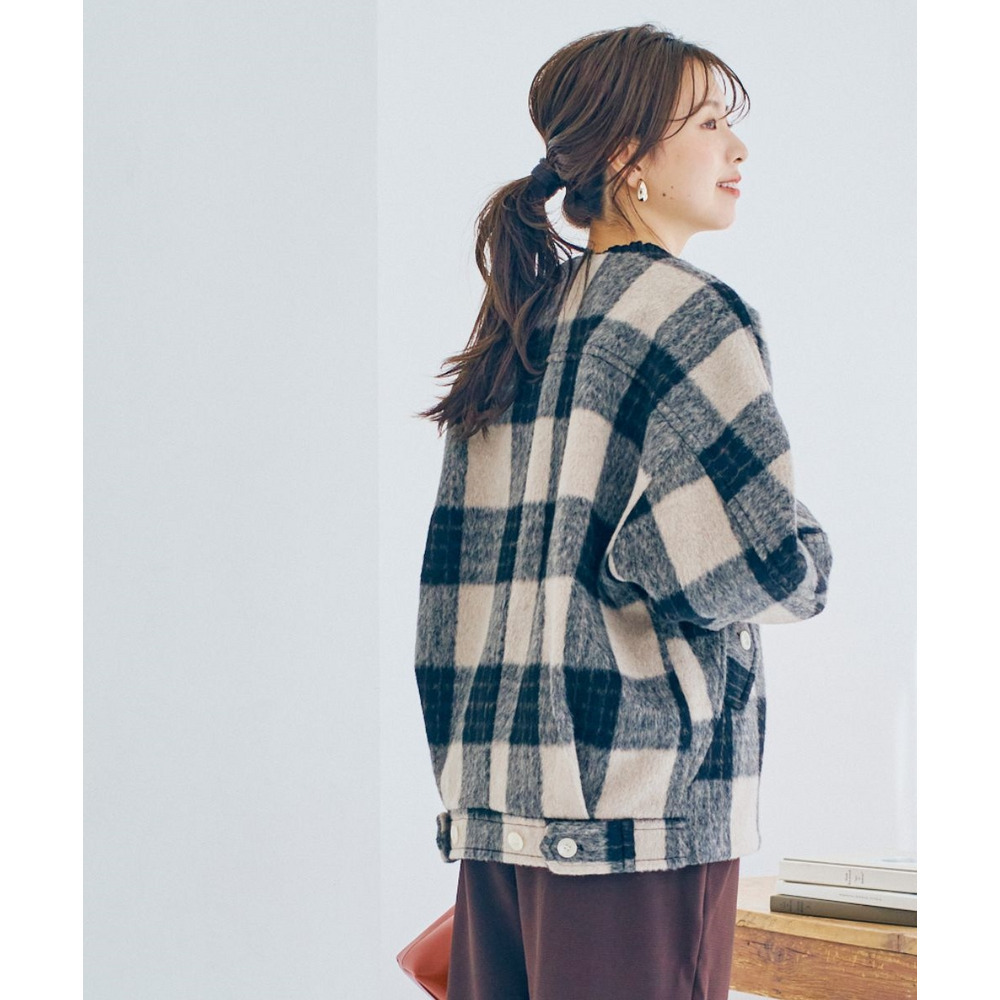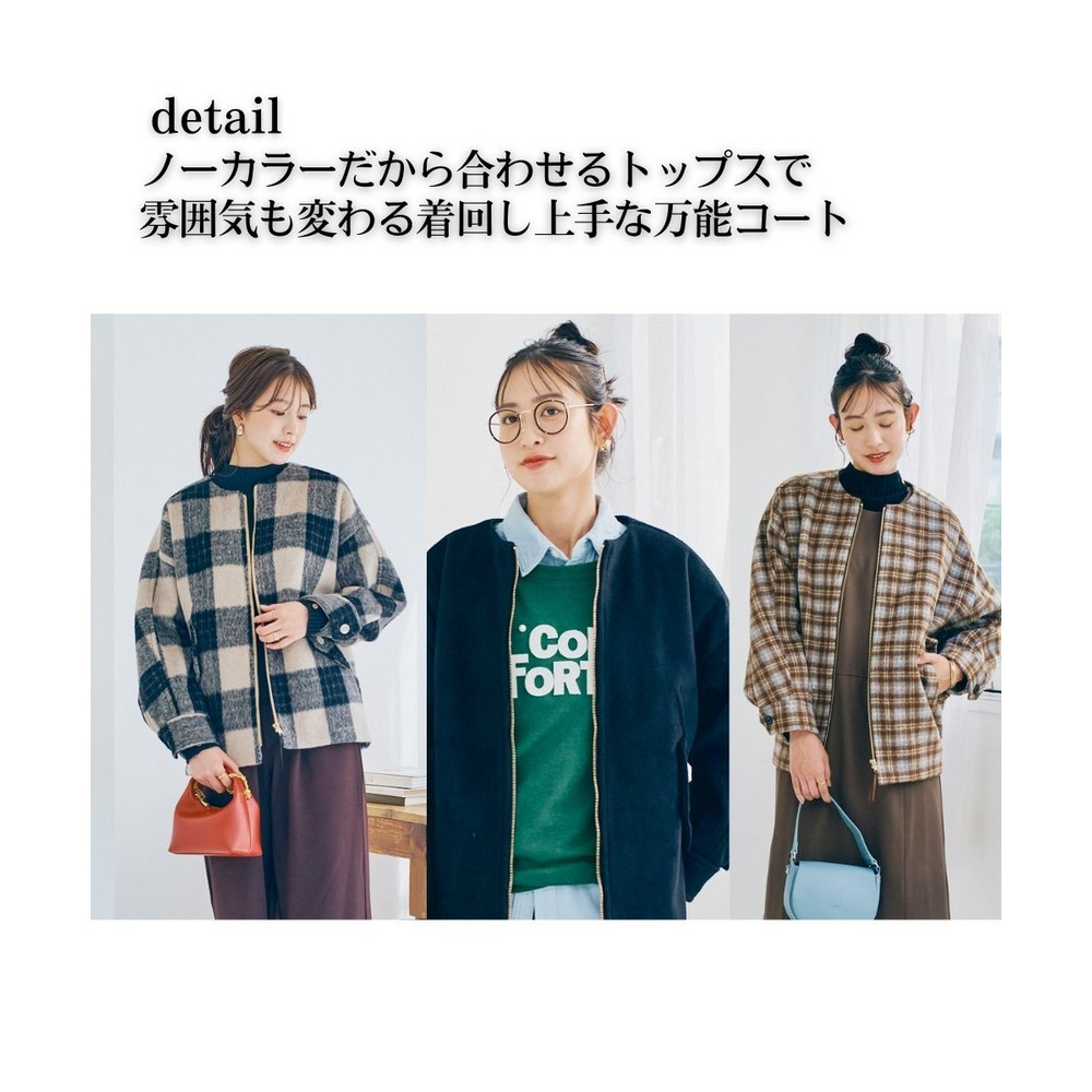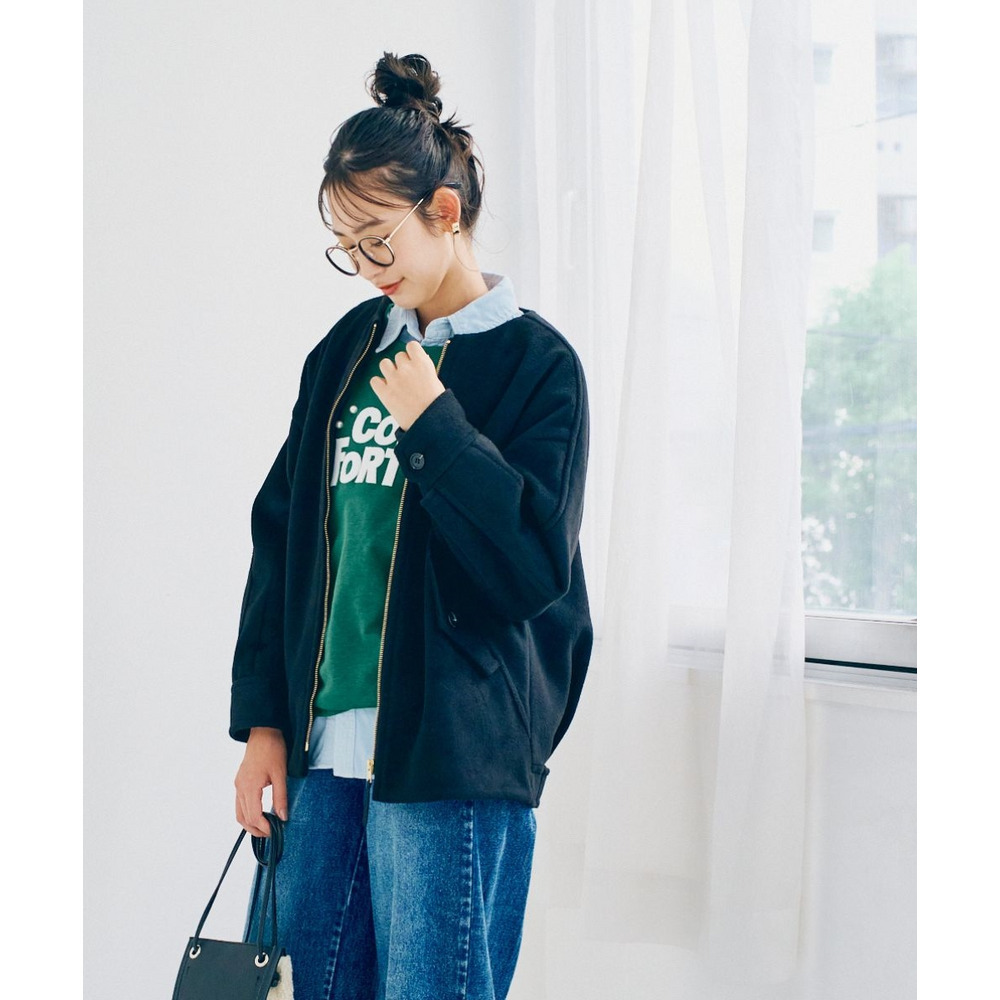 コンパクトにまとまる感じがかわいい、ノーカラーのショートコート。