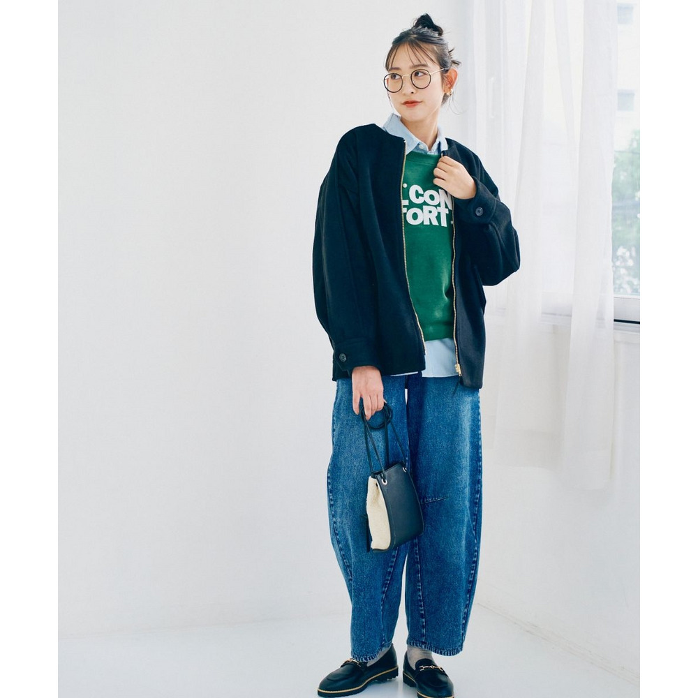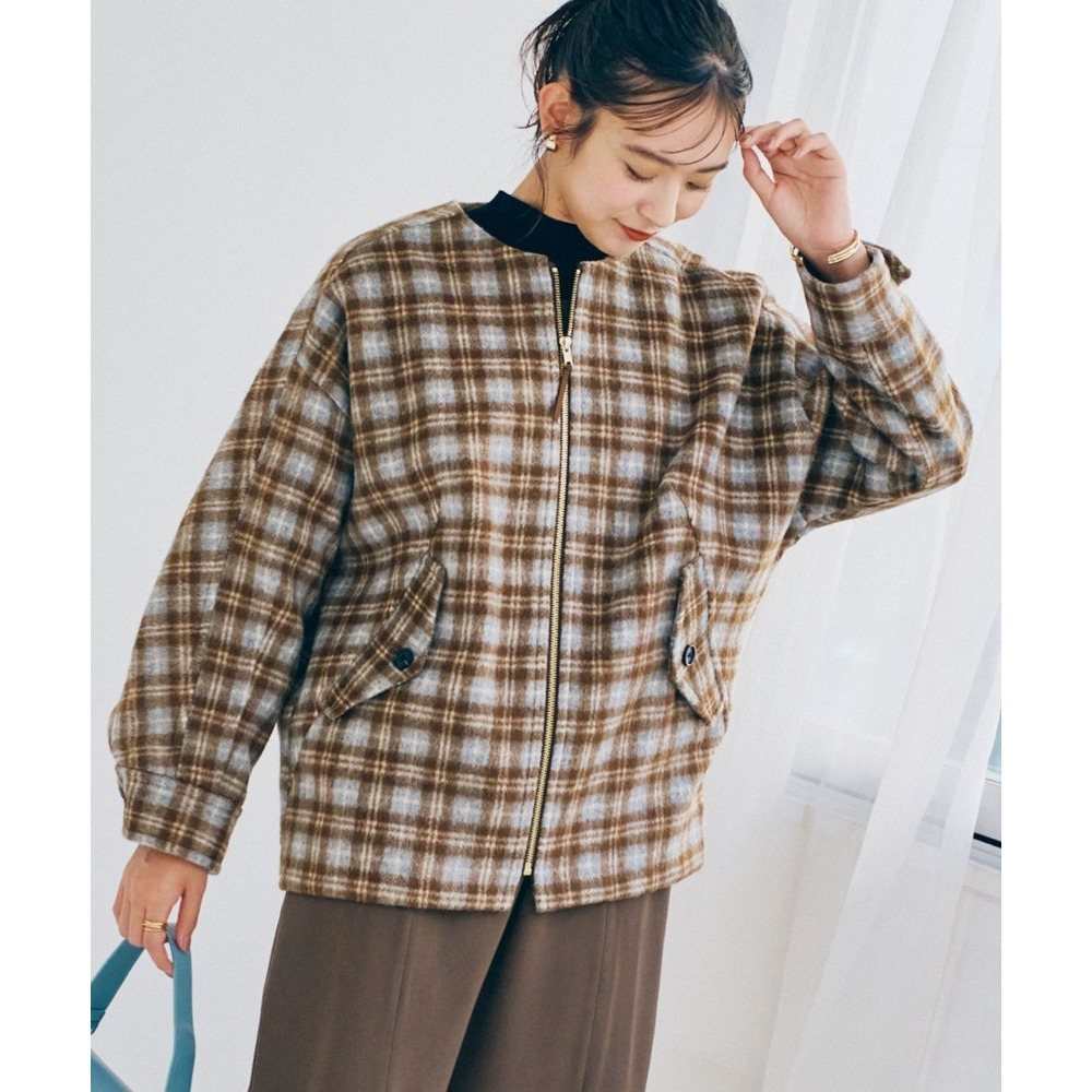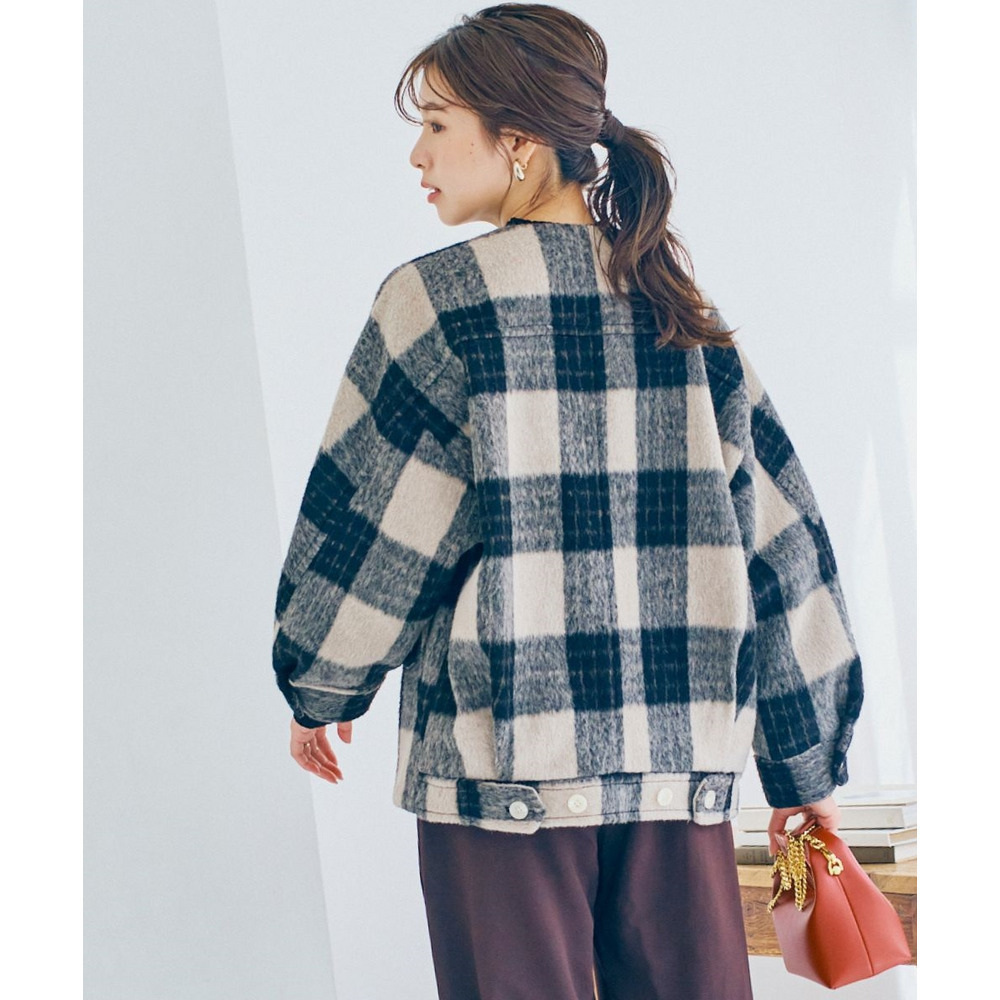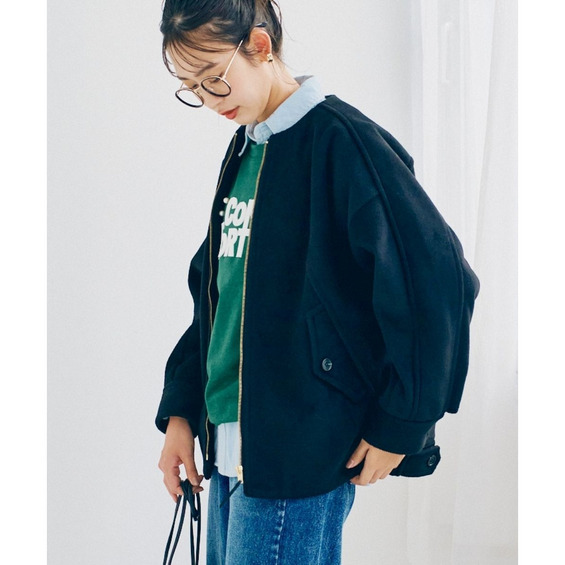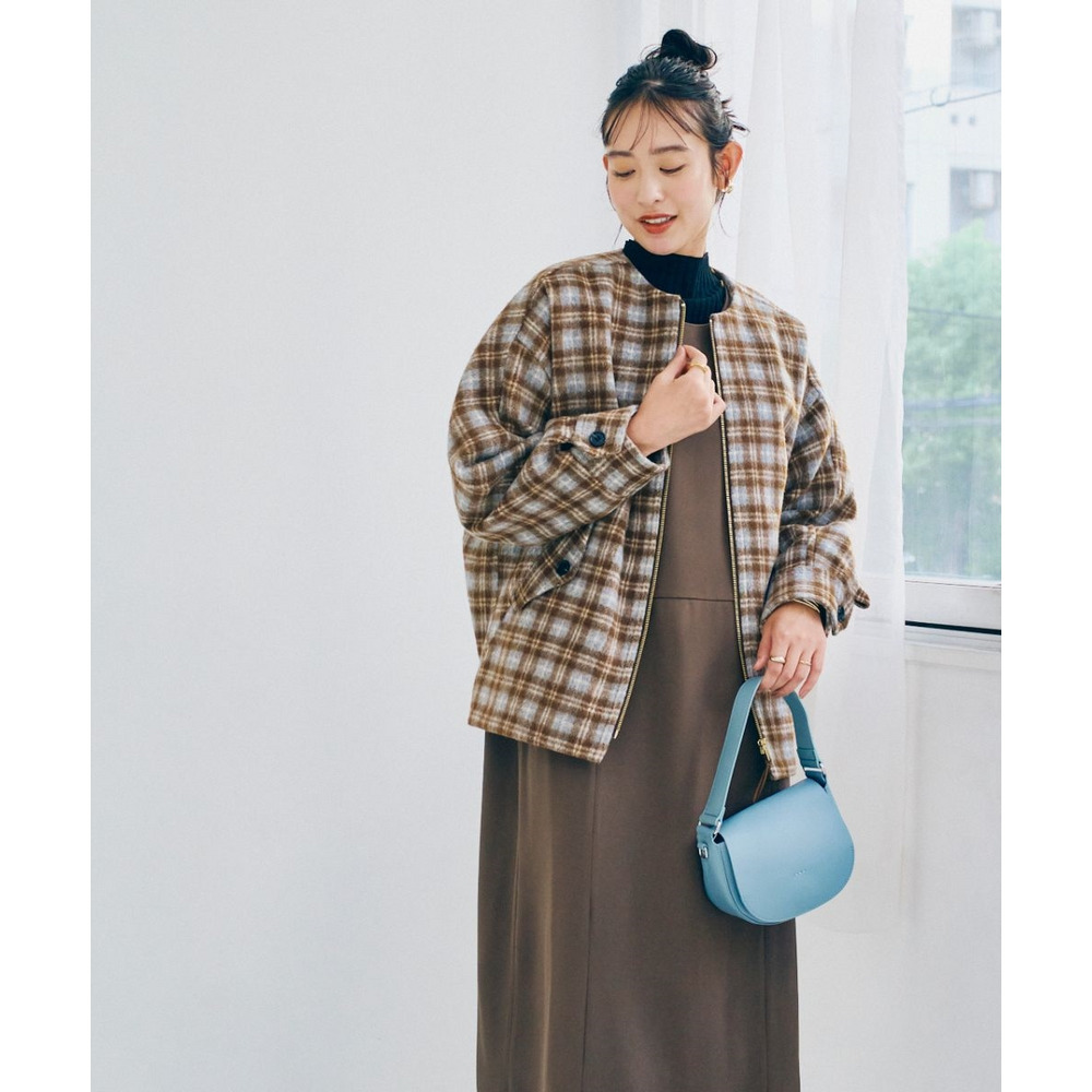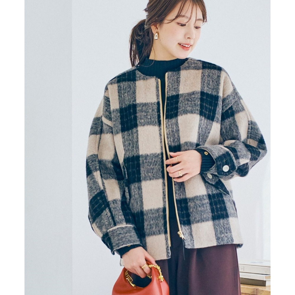 コンパクトにまとまる感じがかわいい、ノーカラーのショートコート。