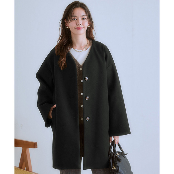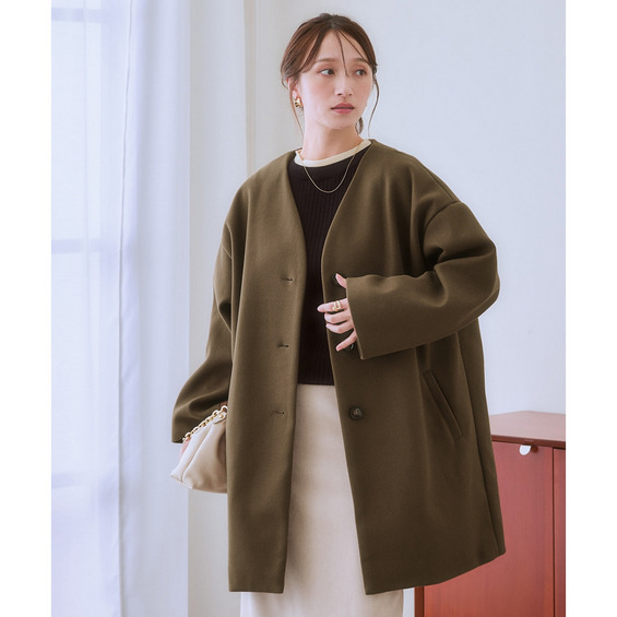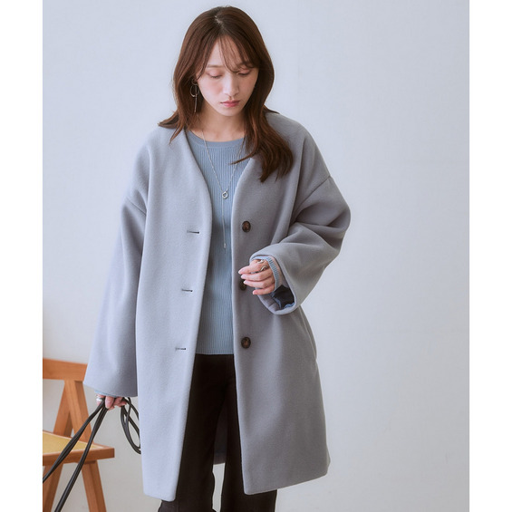上品なノーカラーコートで起毛感のあるフェイクウール素材が上質な印象を醸し出します。