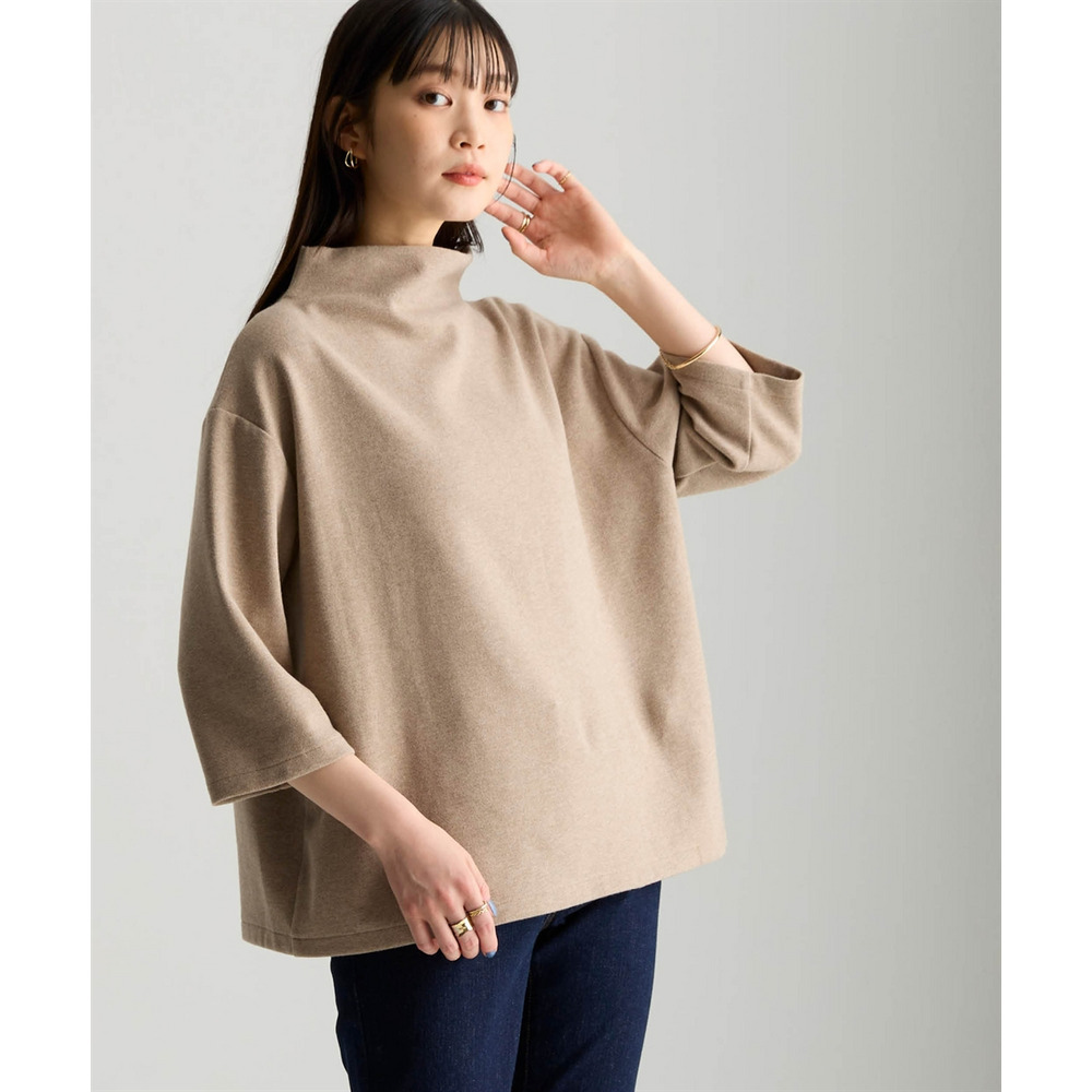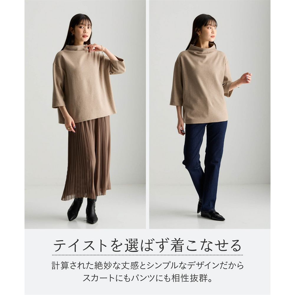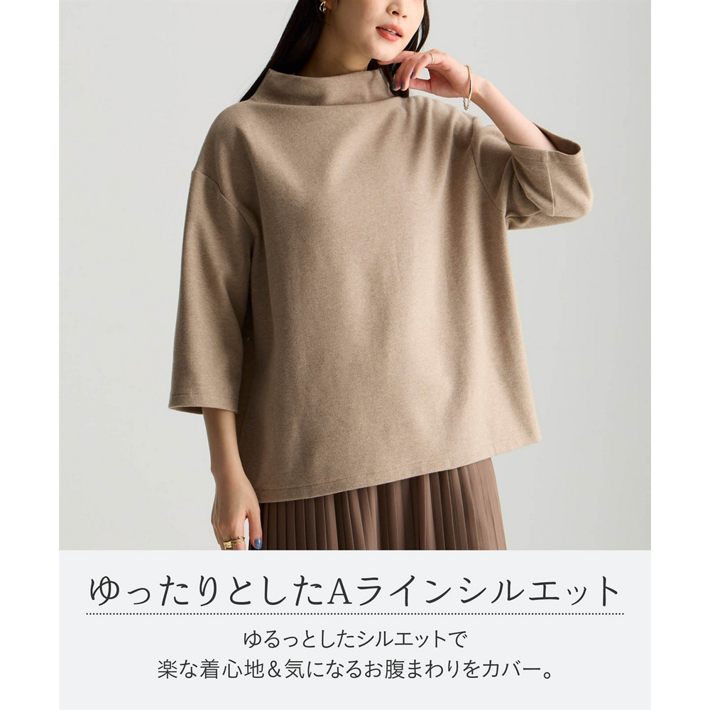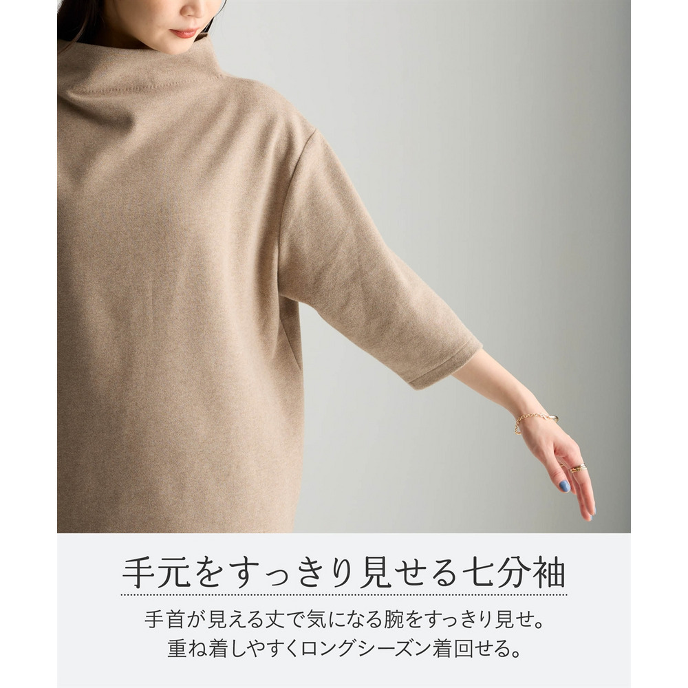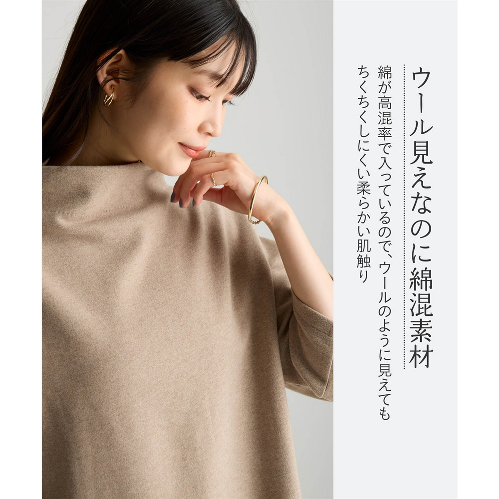 洗濯機で洗える綿混ウール見えカットソー7分袖やわらかモックネップルオーバー 大きいサイズ
