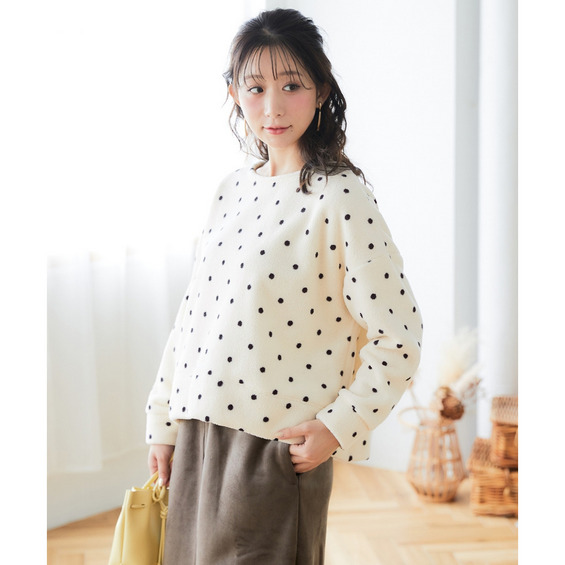 ふんわりとしたドット柄が目を引く、愛らしいデザインのフリースワイドトップス。