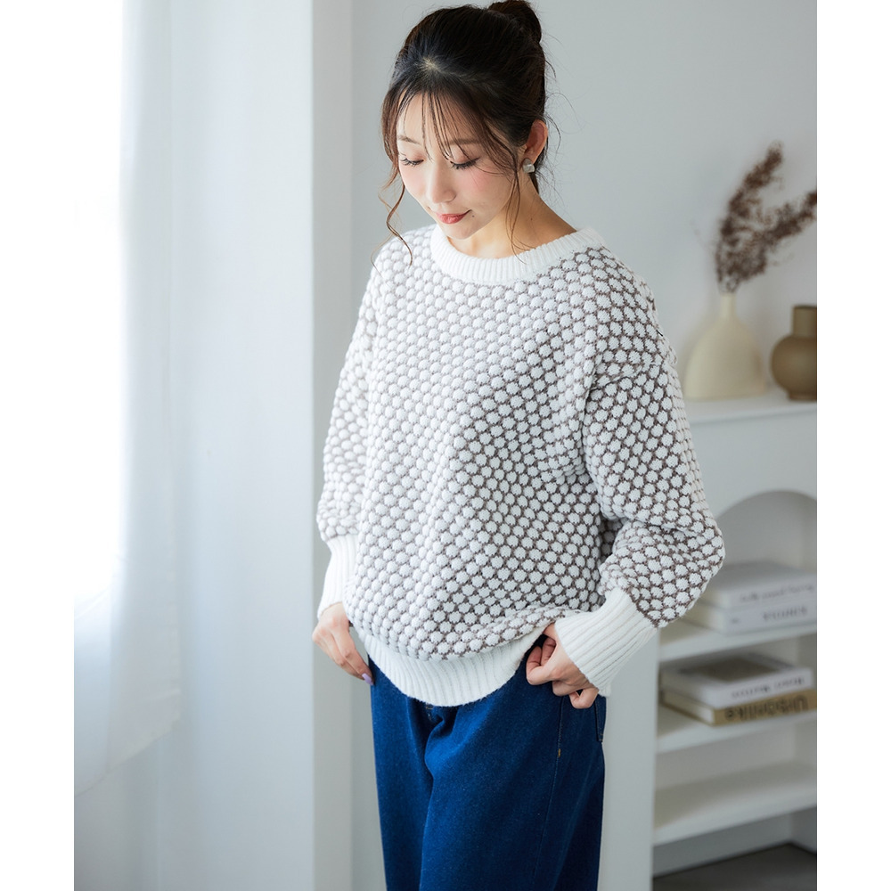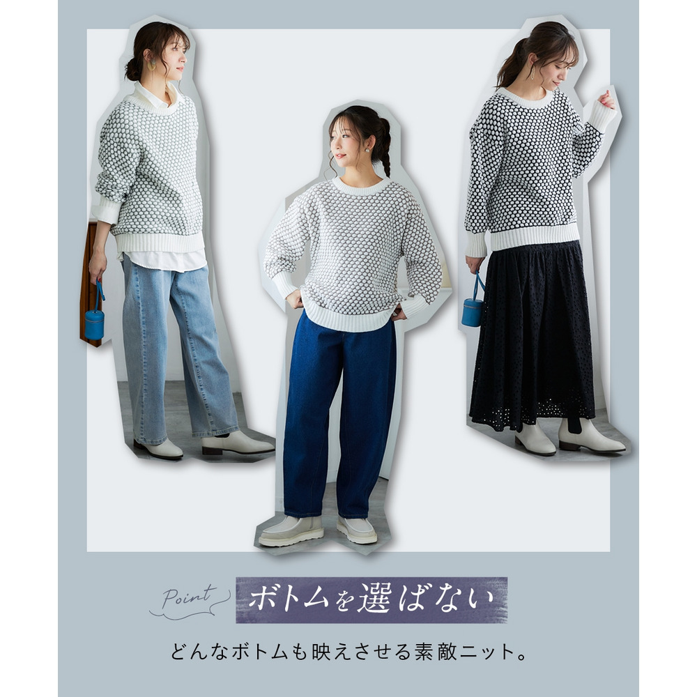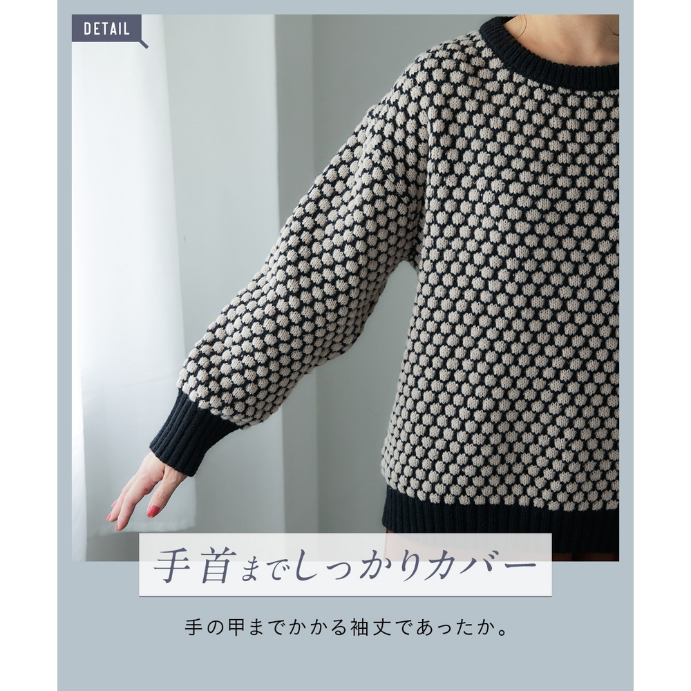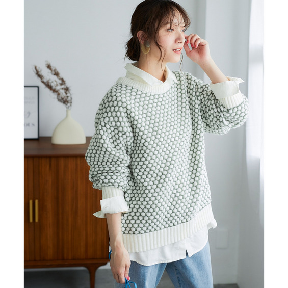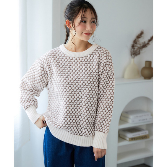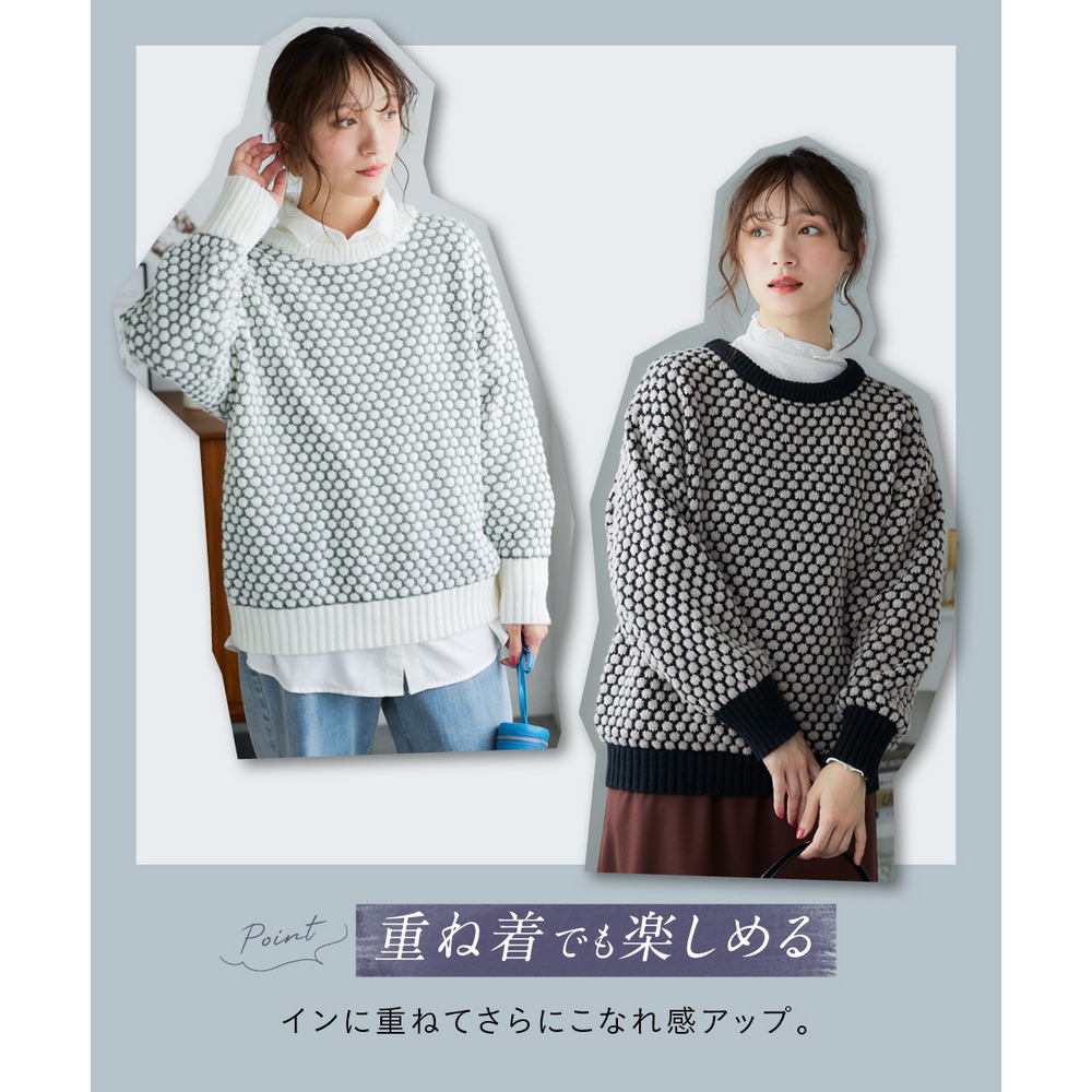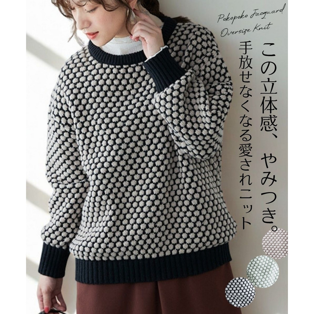 思わず触れたくなるような「ぽこぽこ」とした立体的な編み地が魅力のオーバーサイズニット。
