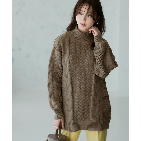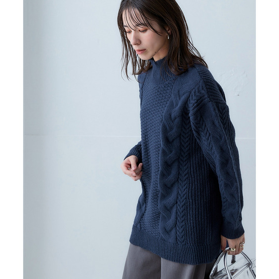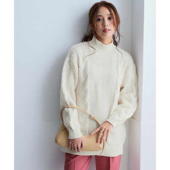 立体感のあるケーブル編みが上品な印象を与えるニットトップス。