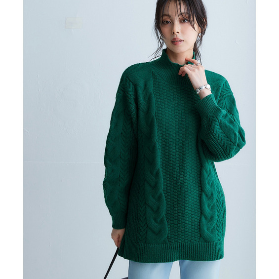 袖とフロント部分に入ったケーブル編みが高見えポイント◎