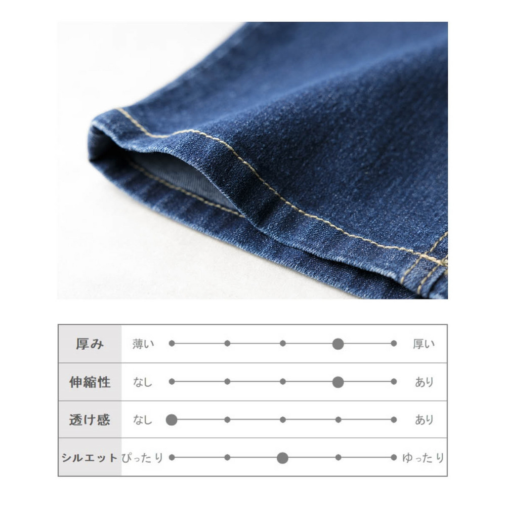 素材 品質=綿48%・レーヨン28%・ポリエステル22%・ポリウレタン2% (8オンス デニム) 透け感:透けにくい 伸縮性:ややあり 生地の厚み:普通 光沢感:なし 裏地:なし ポケット:あり ※前2・後2 ウエスト:脇・後ゴム 季節:春・夏・秋・冬 シルエット:普通 袋に入った状態での保管のためデニムの染料の匂いがこもっている場合がございます。 その場合はお手数ではございますが袋からお出しいただき空気にさらしていただいたり、水洗いをなさってください。