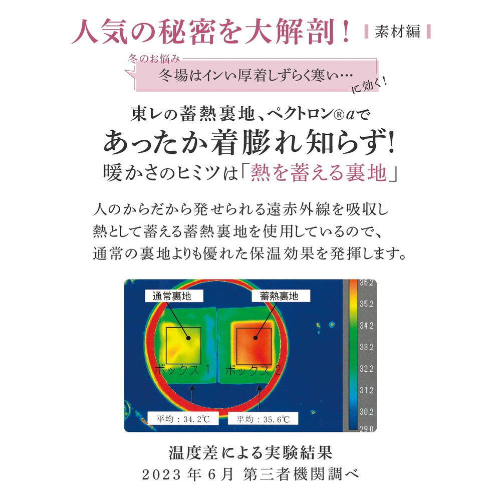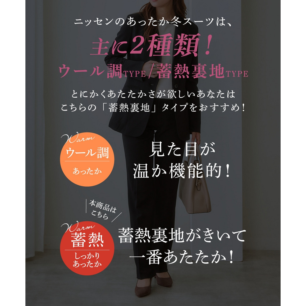 スーツのインは何かと着こめないというお悩みから、遠赤外線蓄熱保温あったか裏地(東レペクトロン(R)α)を採用、働く女性を冷えから守ります。