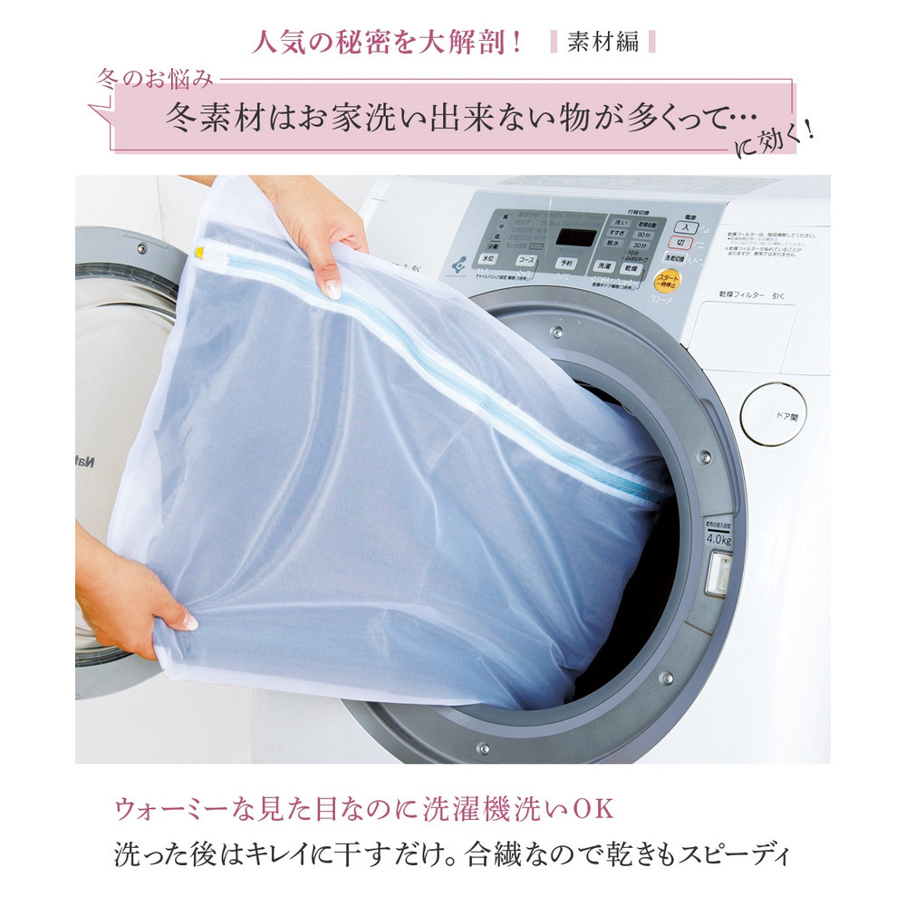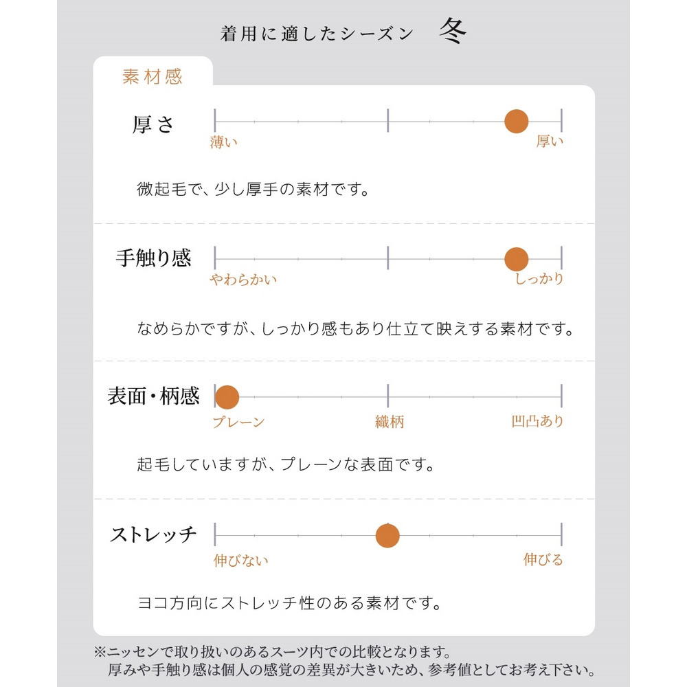 合繊でいてウール調のウォーミーな見た目を追求しながらも、冬素材特有の風合いやケアのしにくさを解消したウール調。