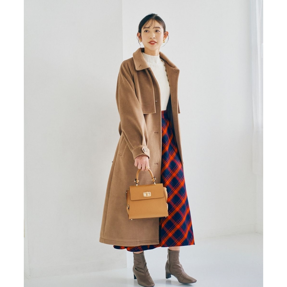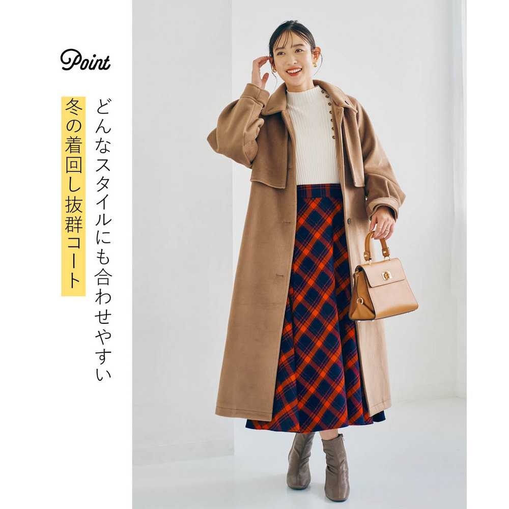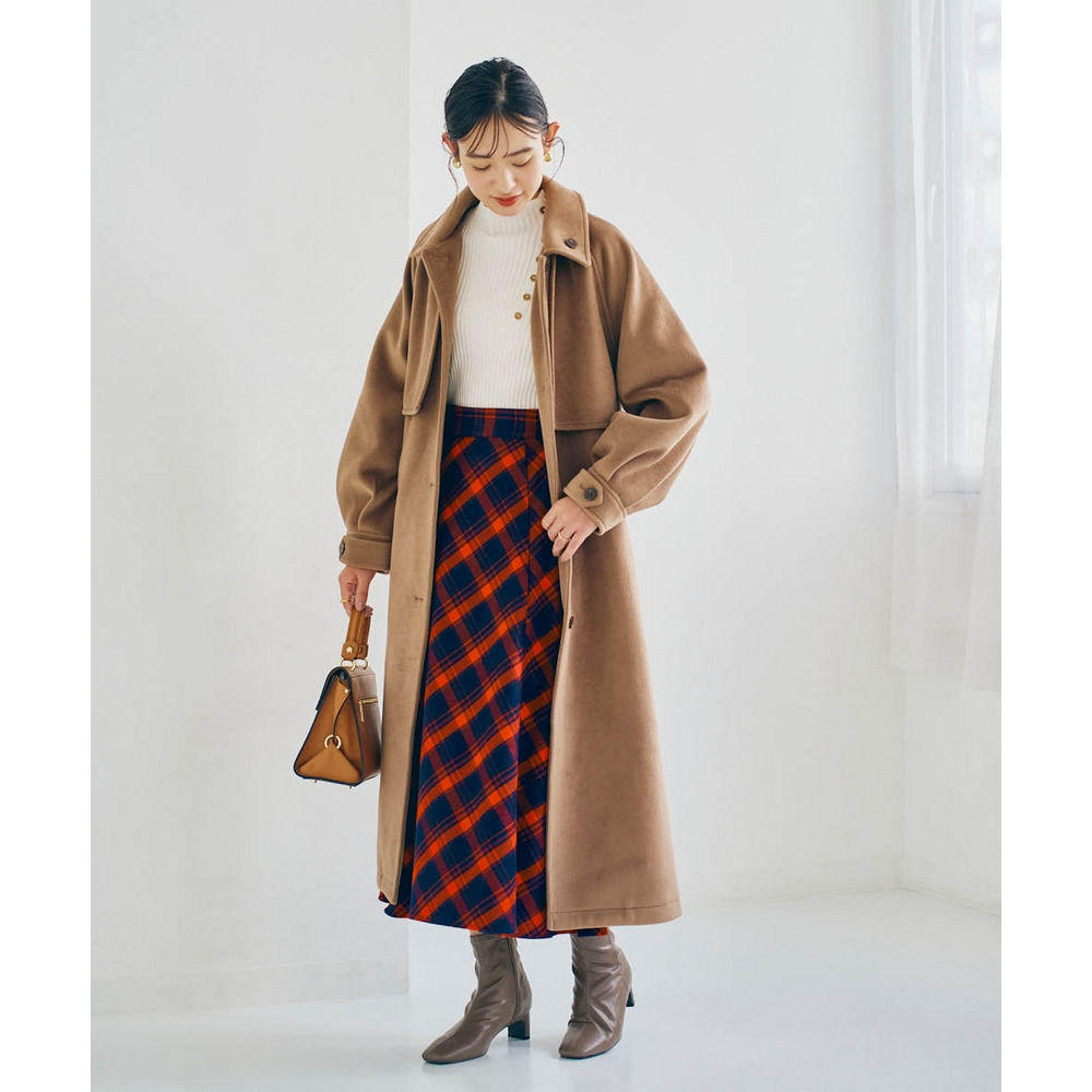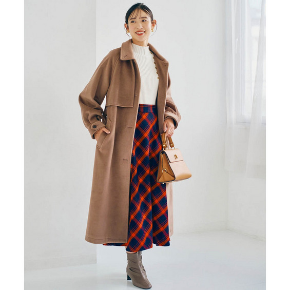 ロングコートはすっぽりラインをカバーしてくれつつも少し裾から除くスカートの柄をポイントにしても◎