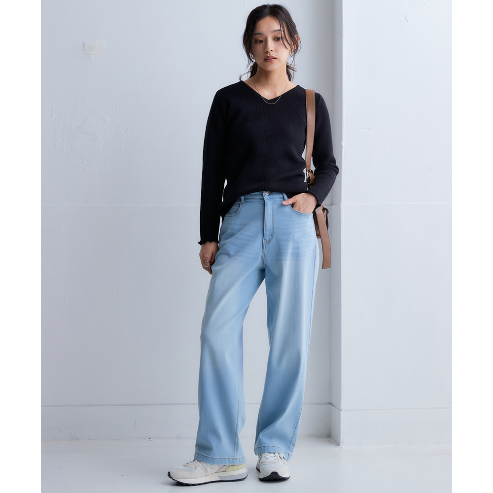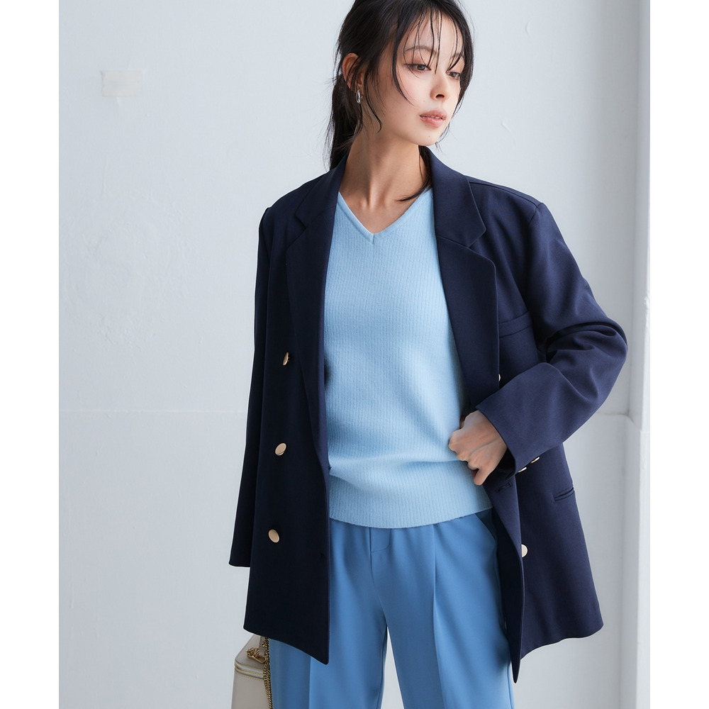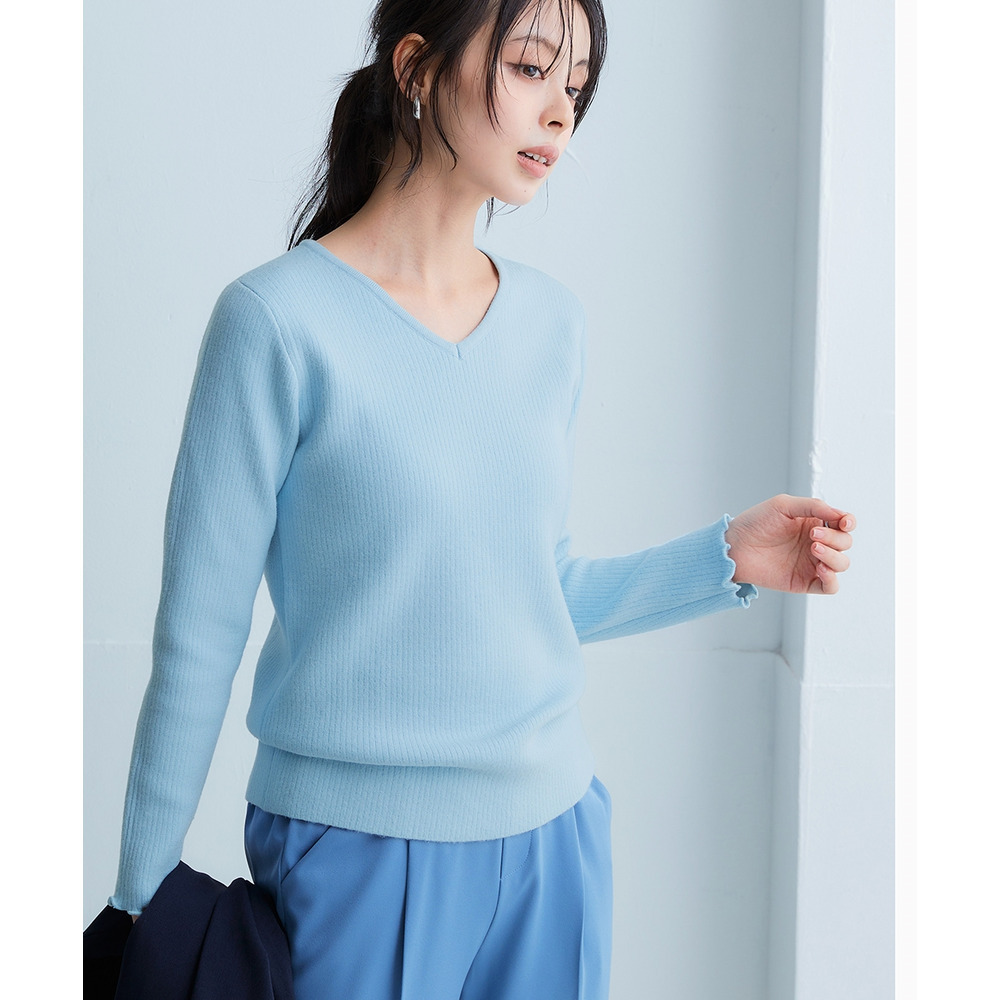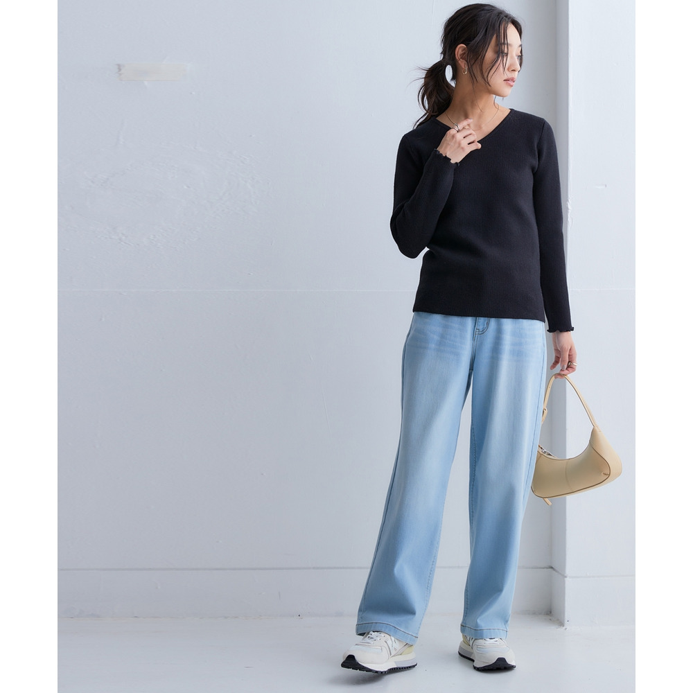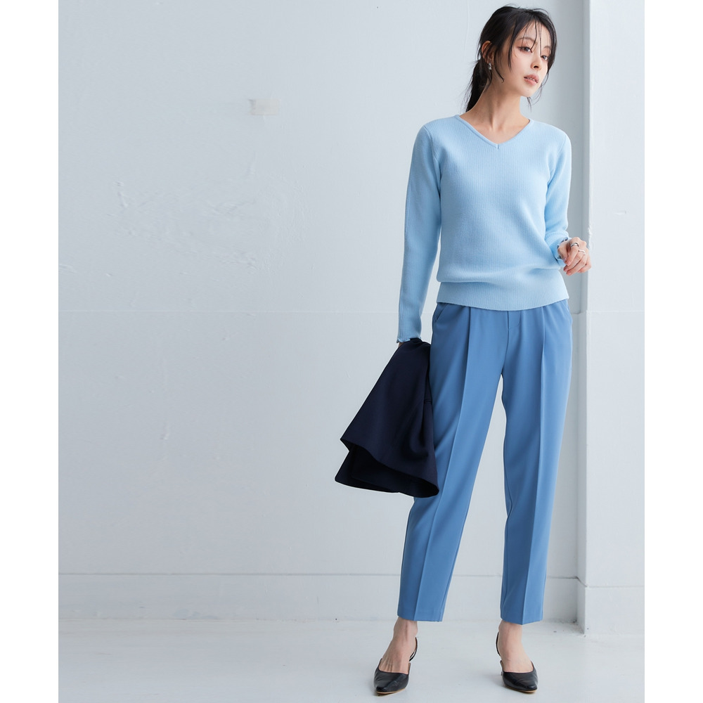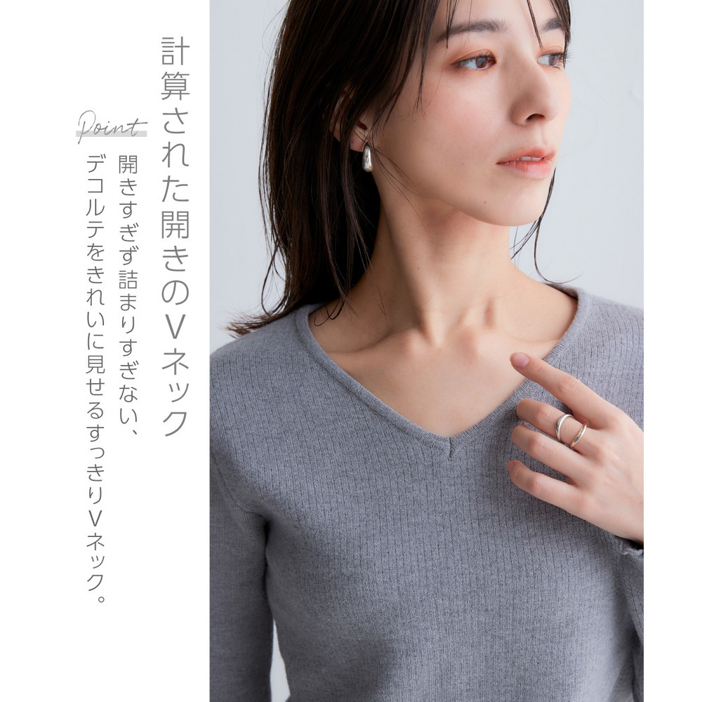 デコルテを美しく見せるVネックラインで、抜け感と女性らしさを演出。