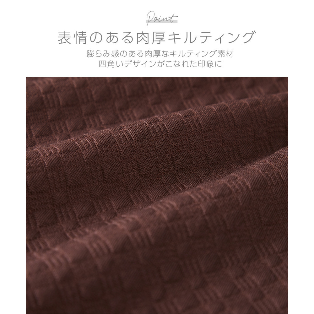 四角いキルティングステッチが凹凸を生み出し、陰影による高見え感をプラス。